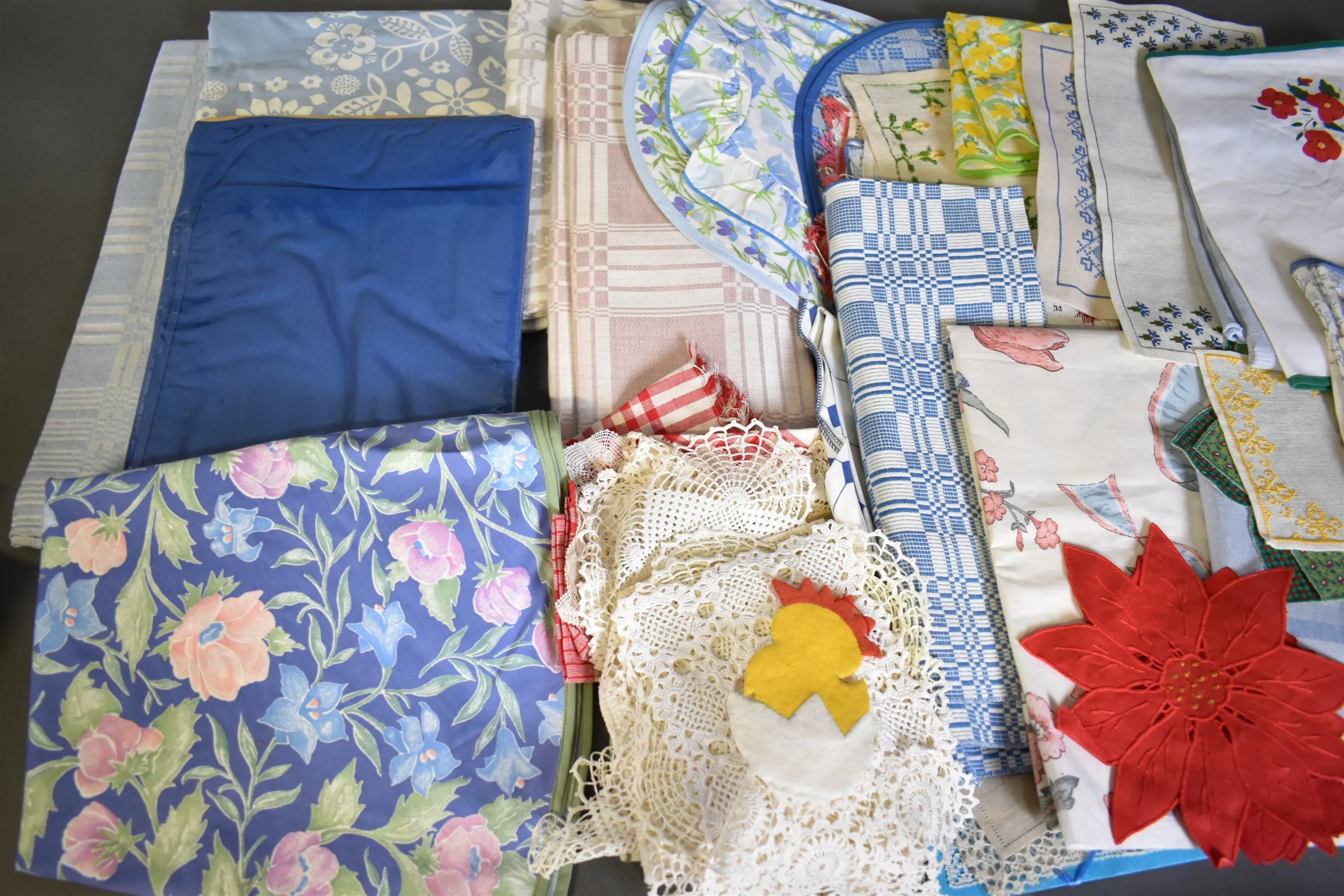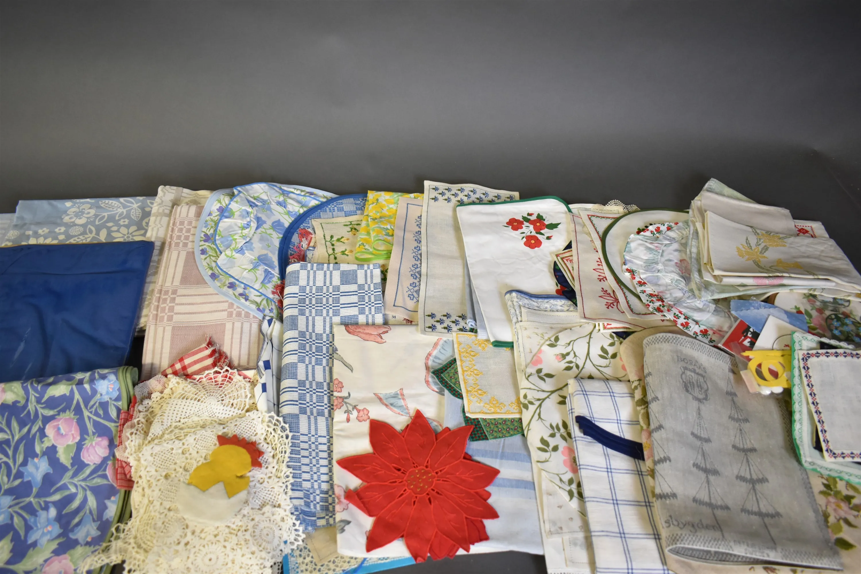 5339. Parti textilier, bl.a linnedukar & broderade dukar
