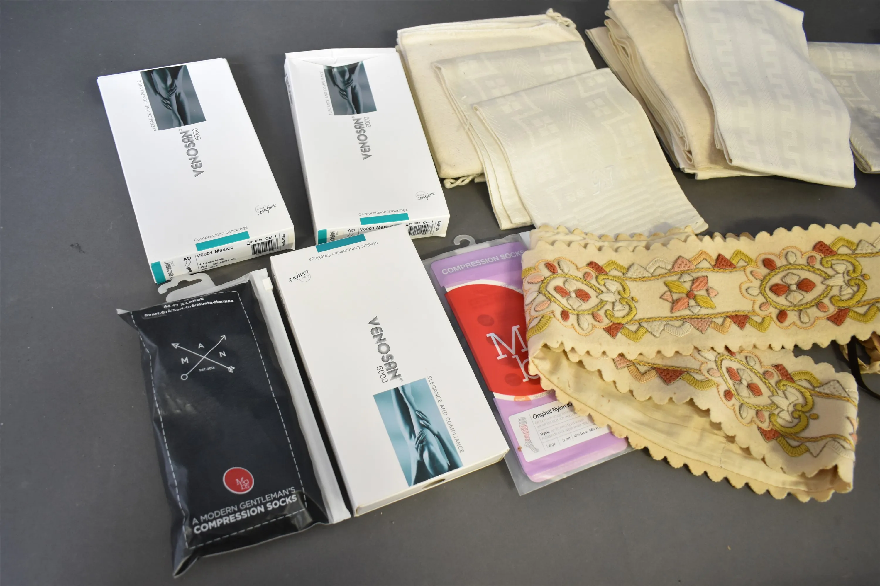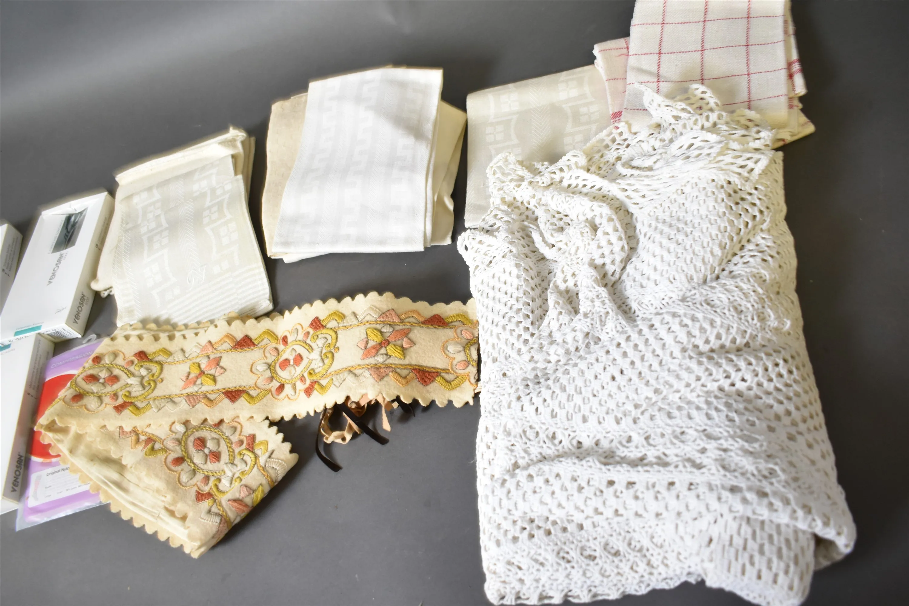 15932. Parti textilier, bl.a linnehanddukar