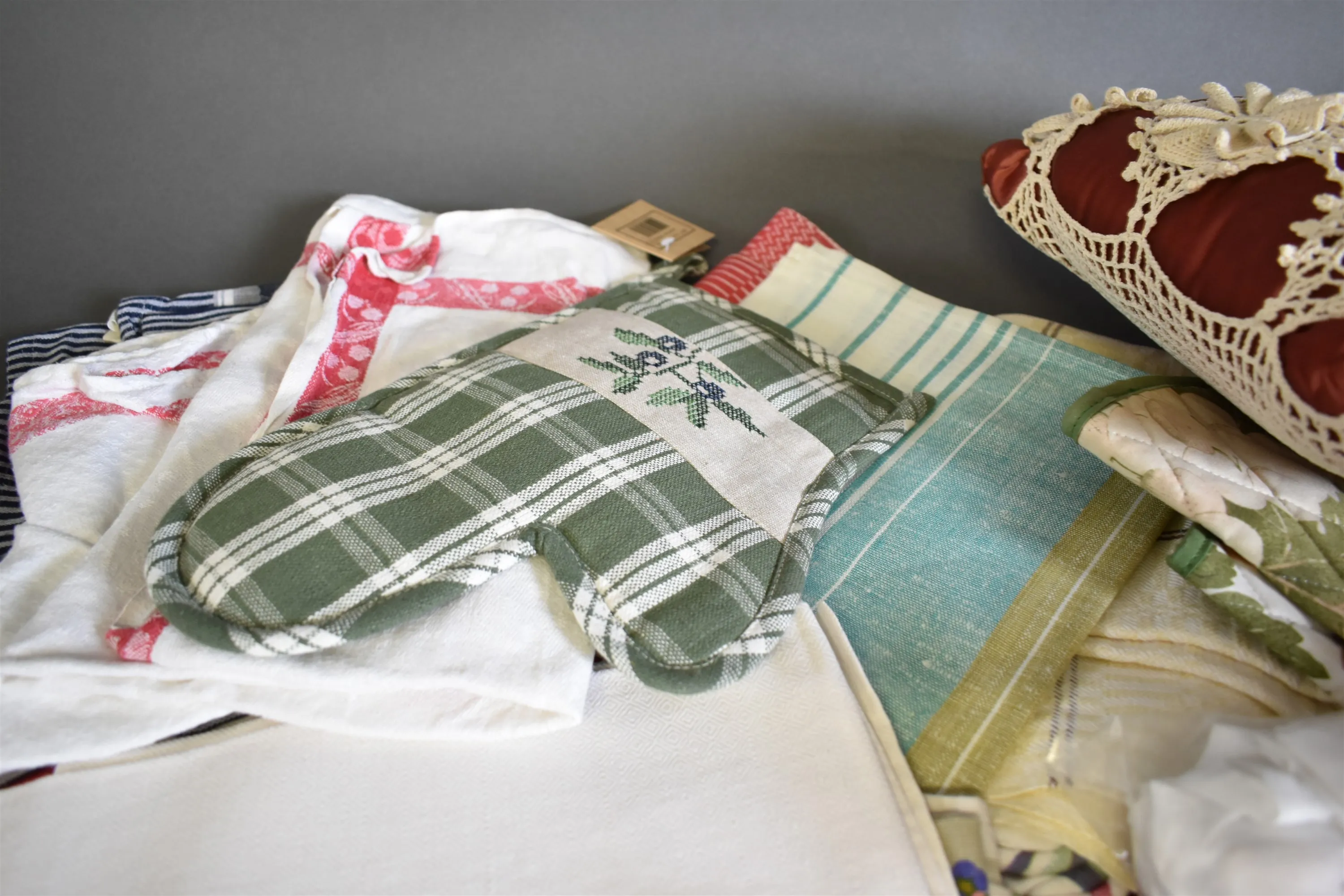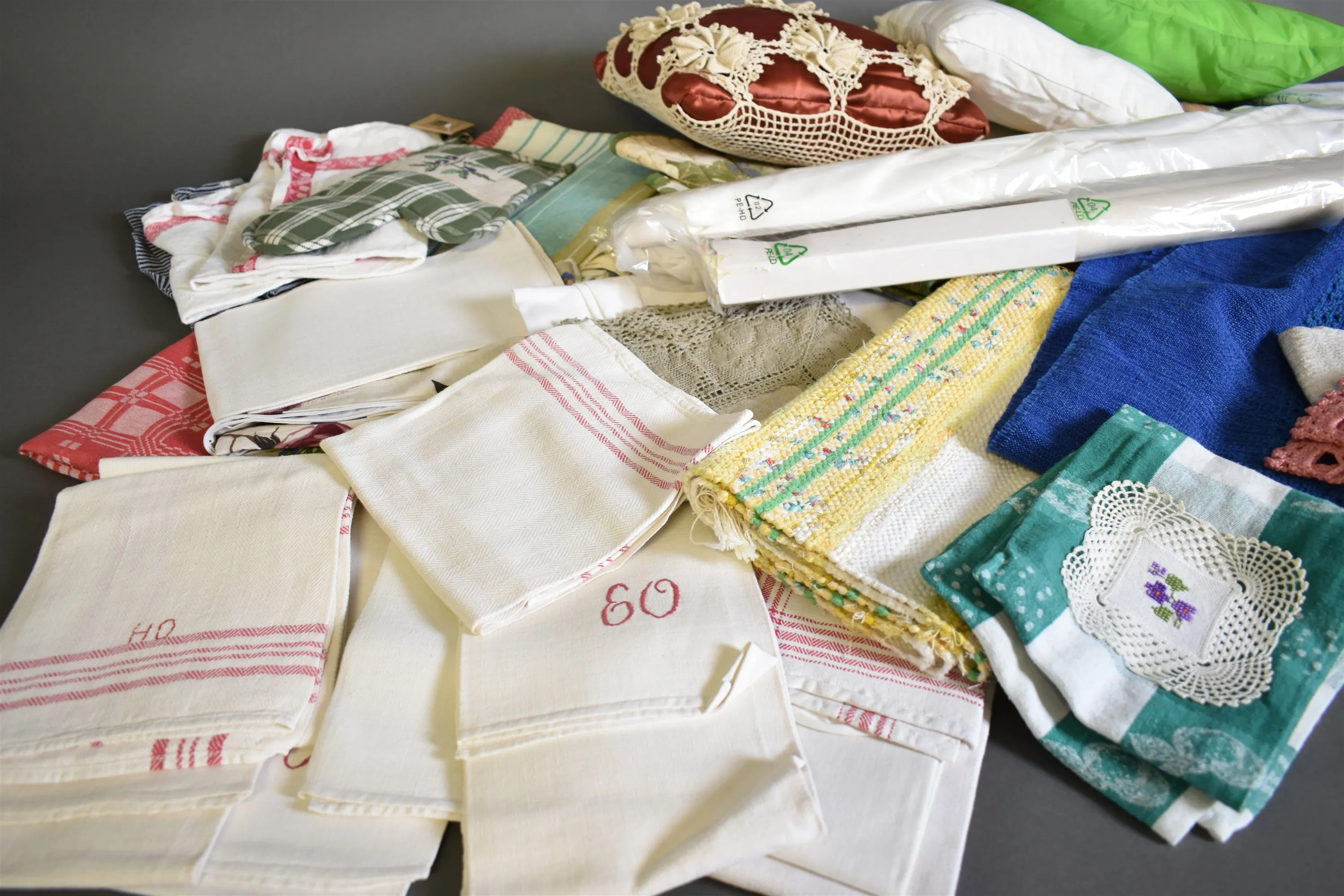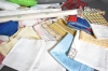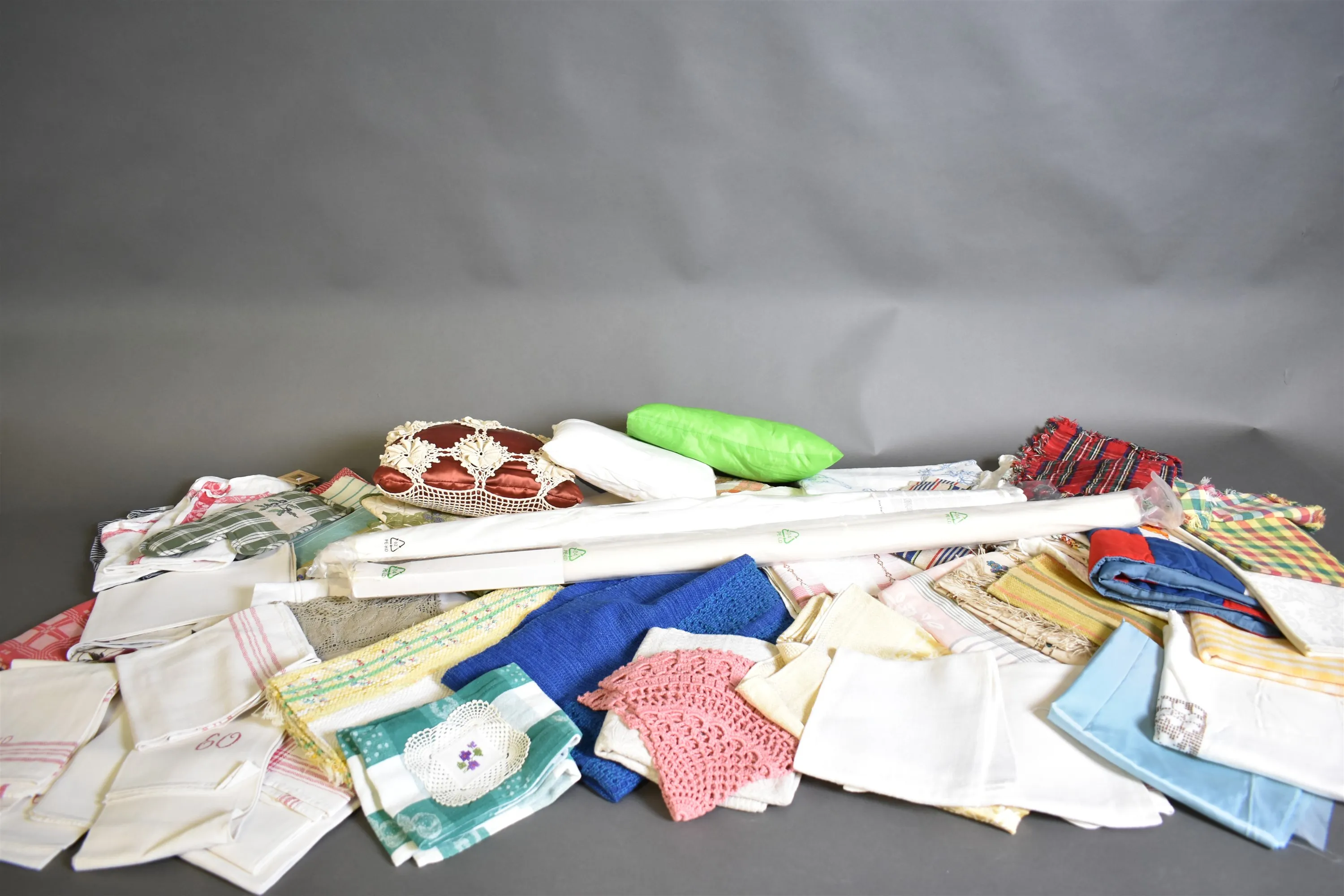 13988. Parti textilier bla dukar och rullgardiner