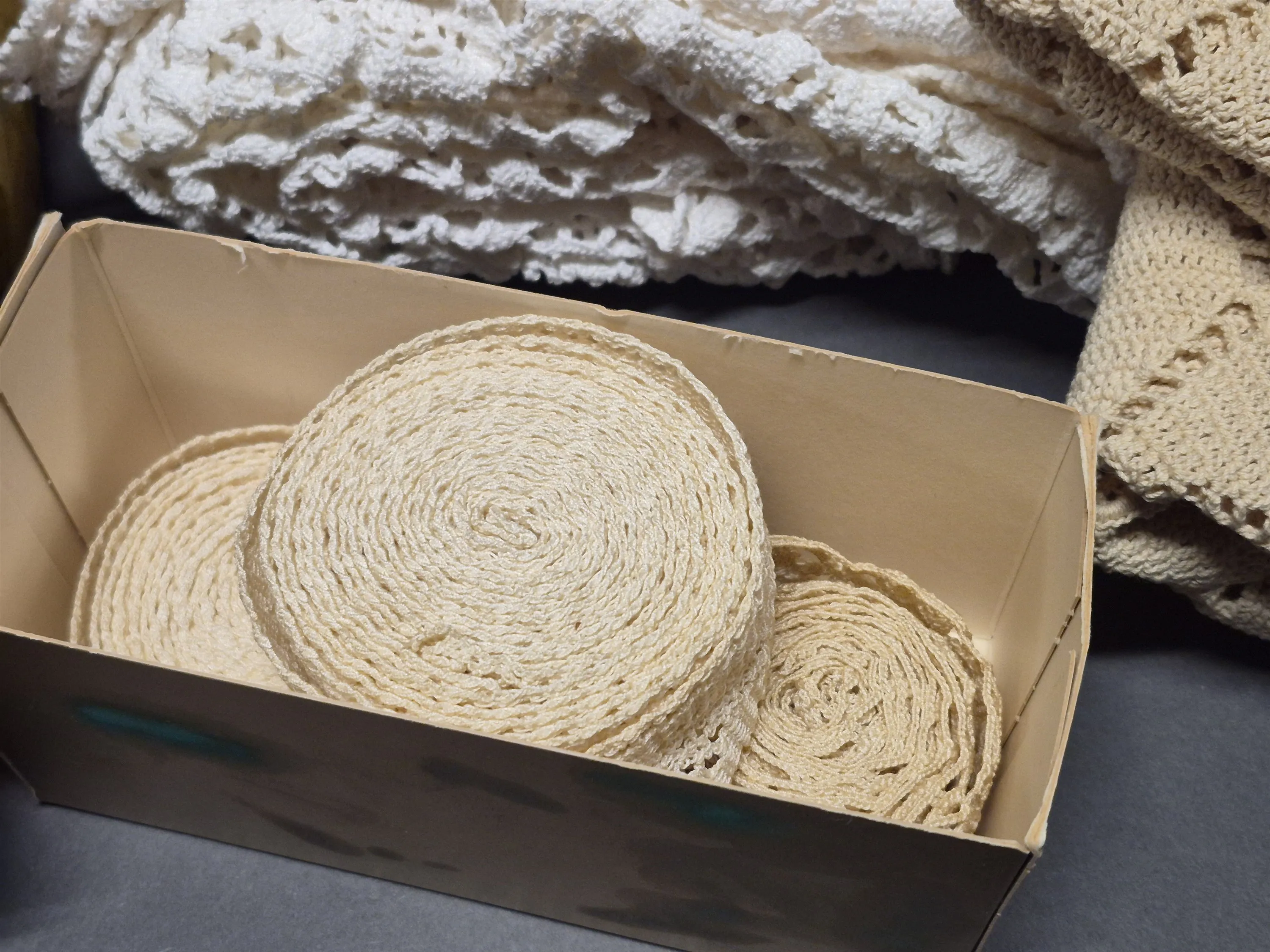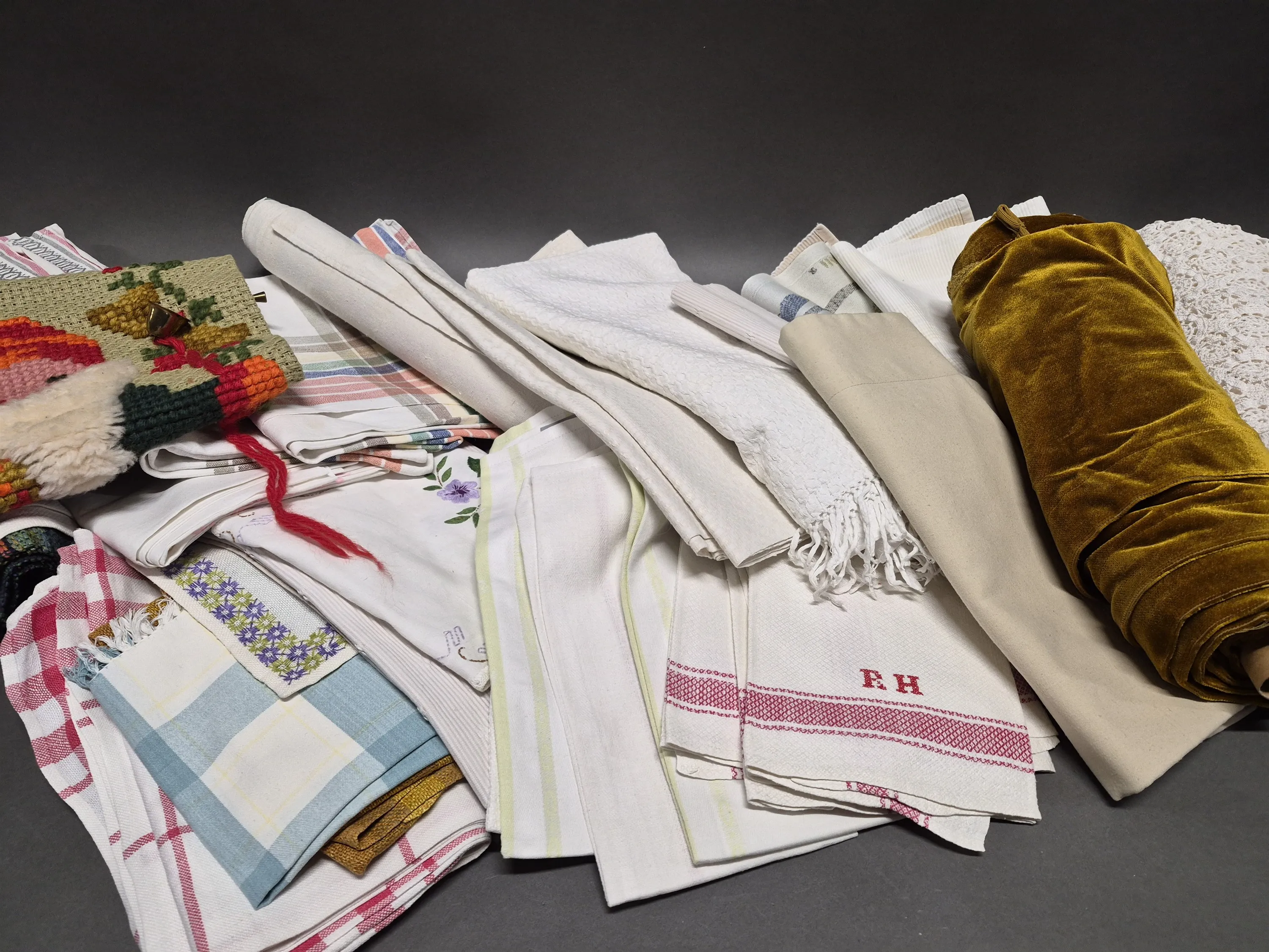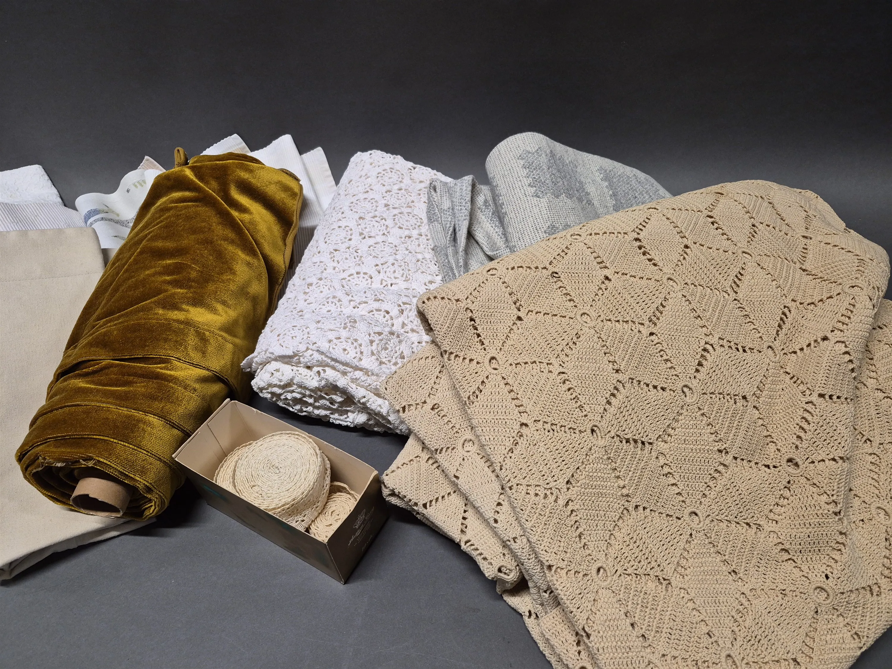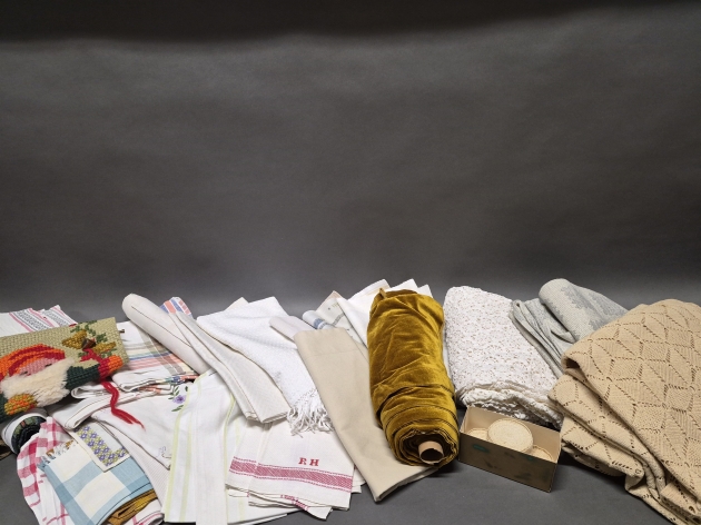 18794. Parti textilier bla dukar och virkat, någon fläck finns