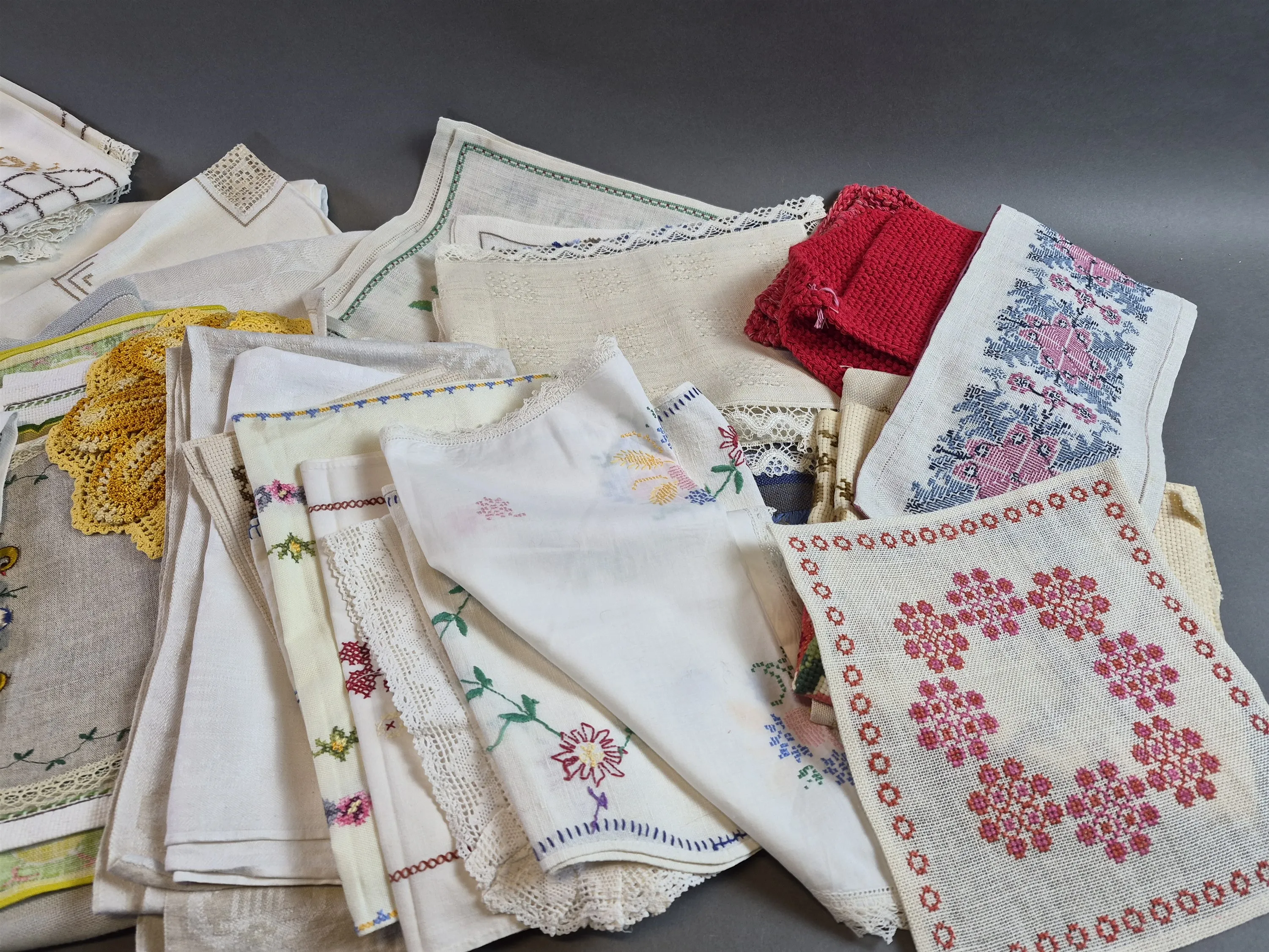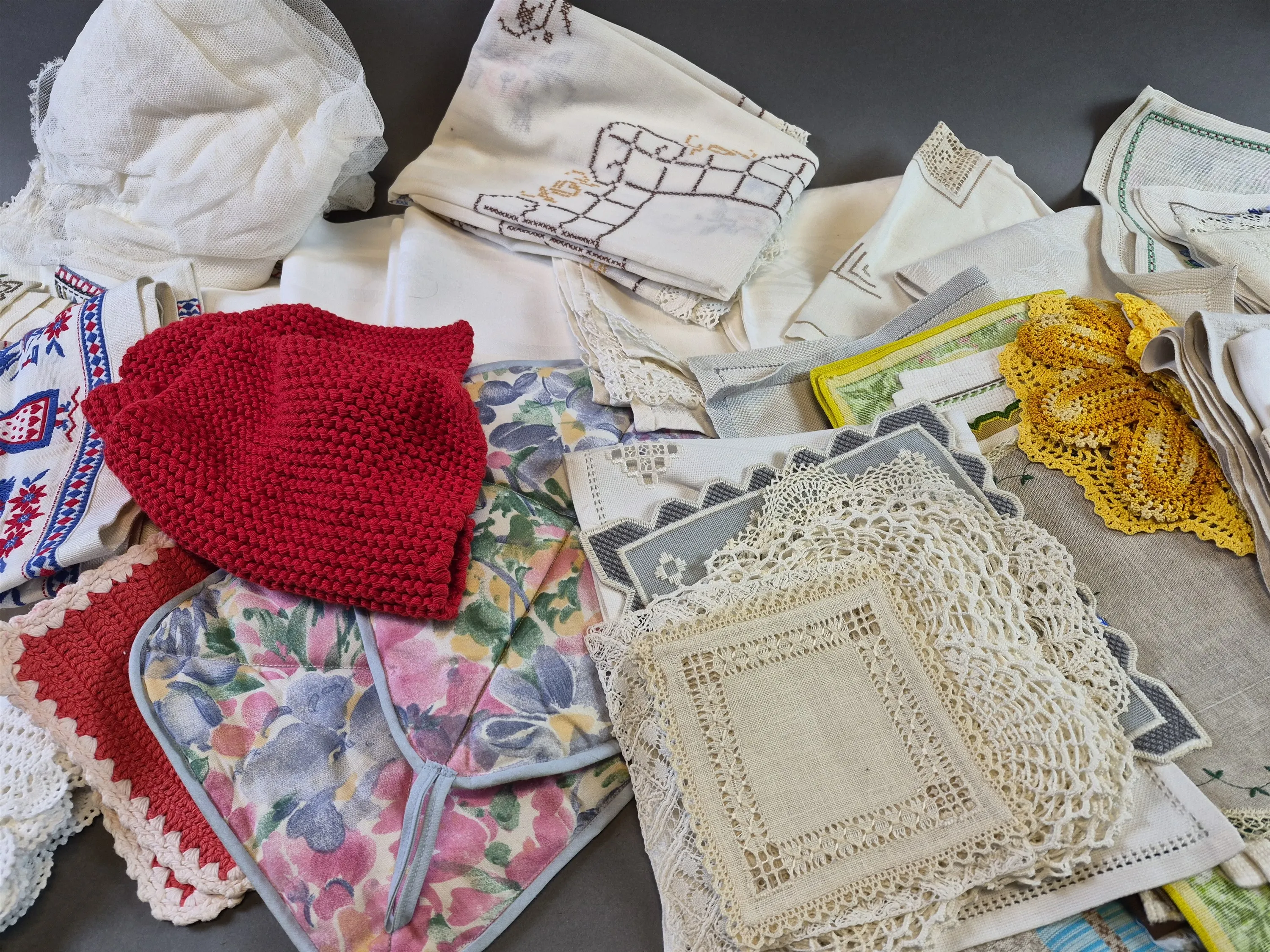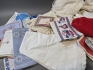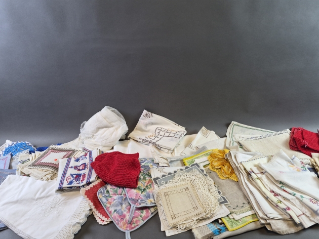 20616. Parti textilier bla handarbete och linnedukar