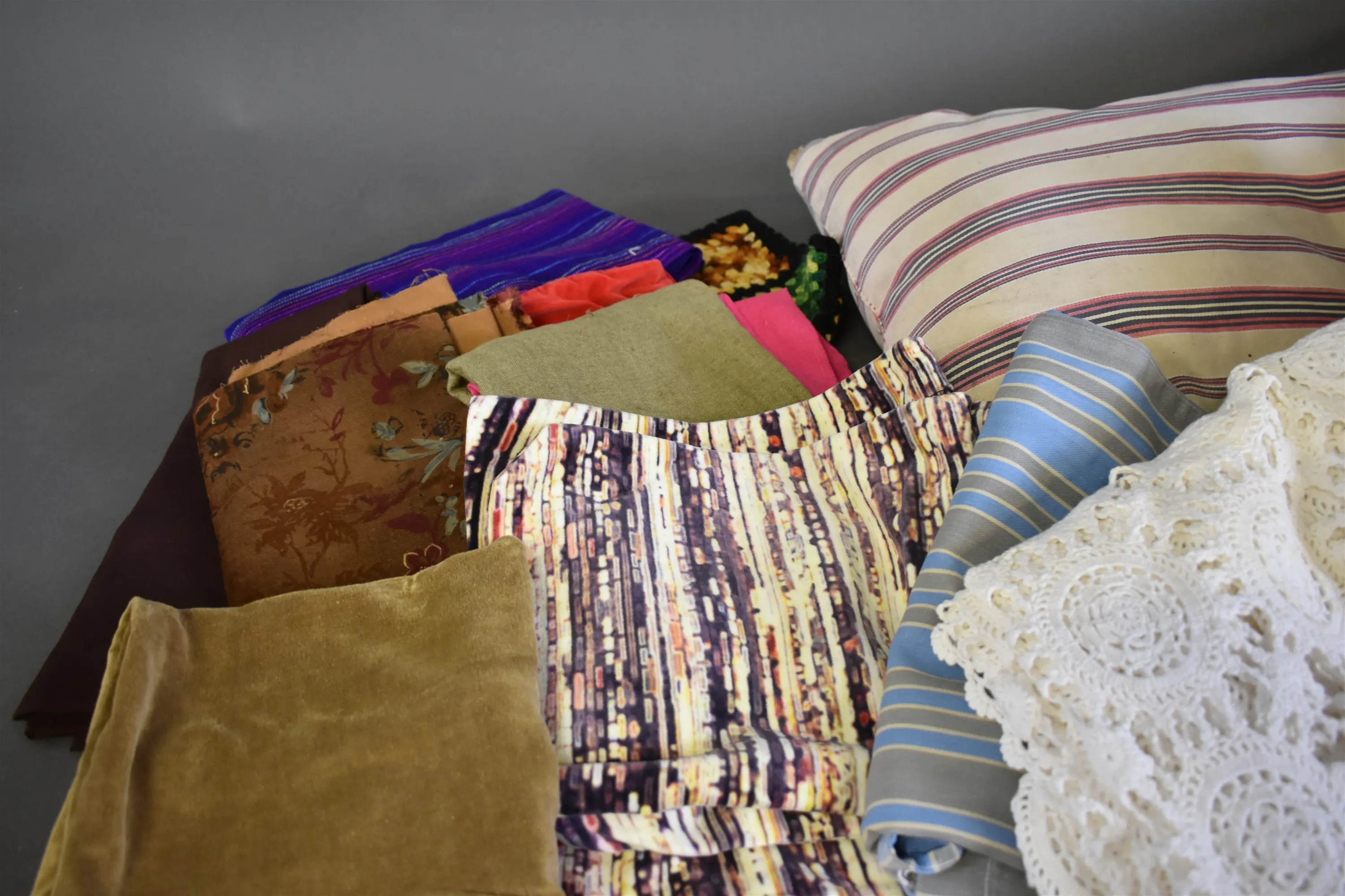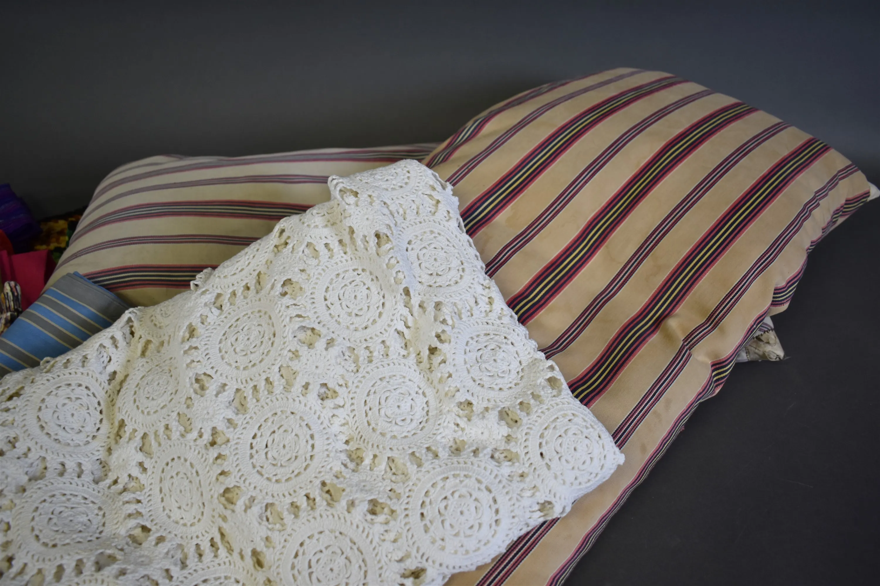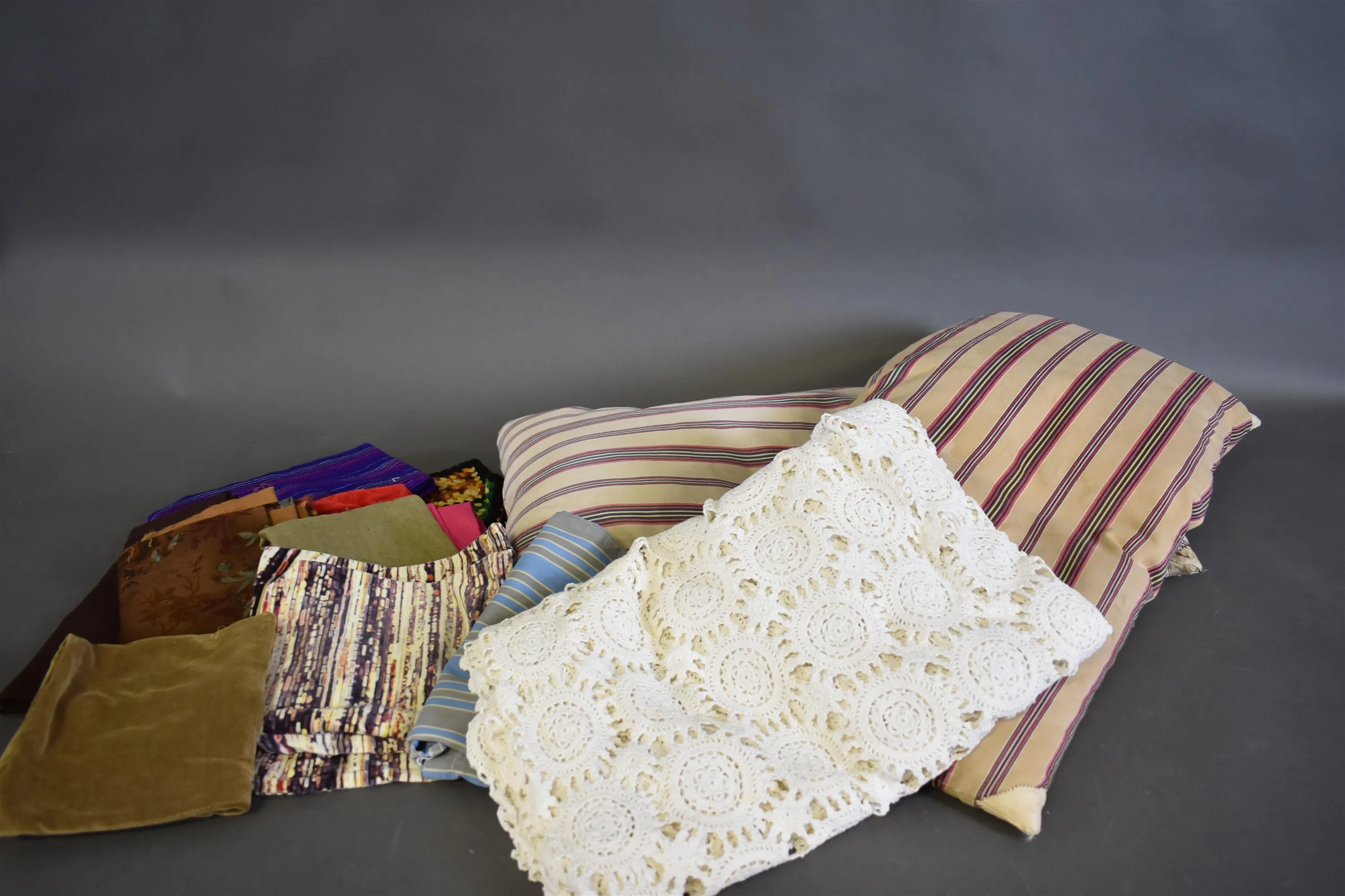 16232. Parti textilier bla kuddar och virkat överkast, längd på kudde 87 cm