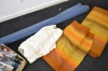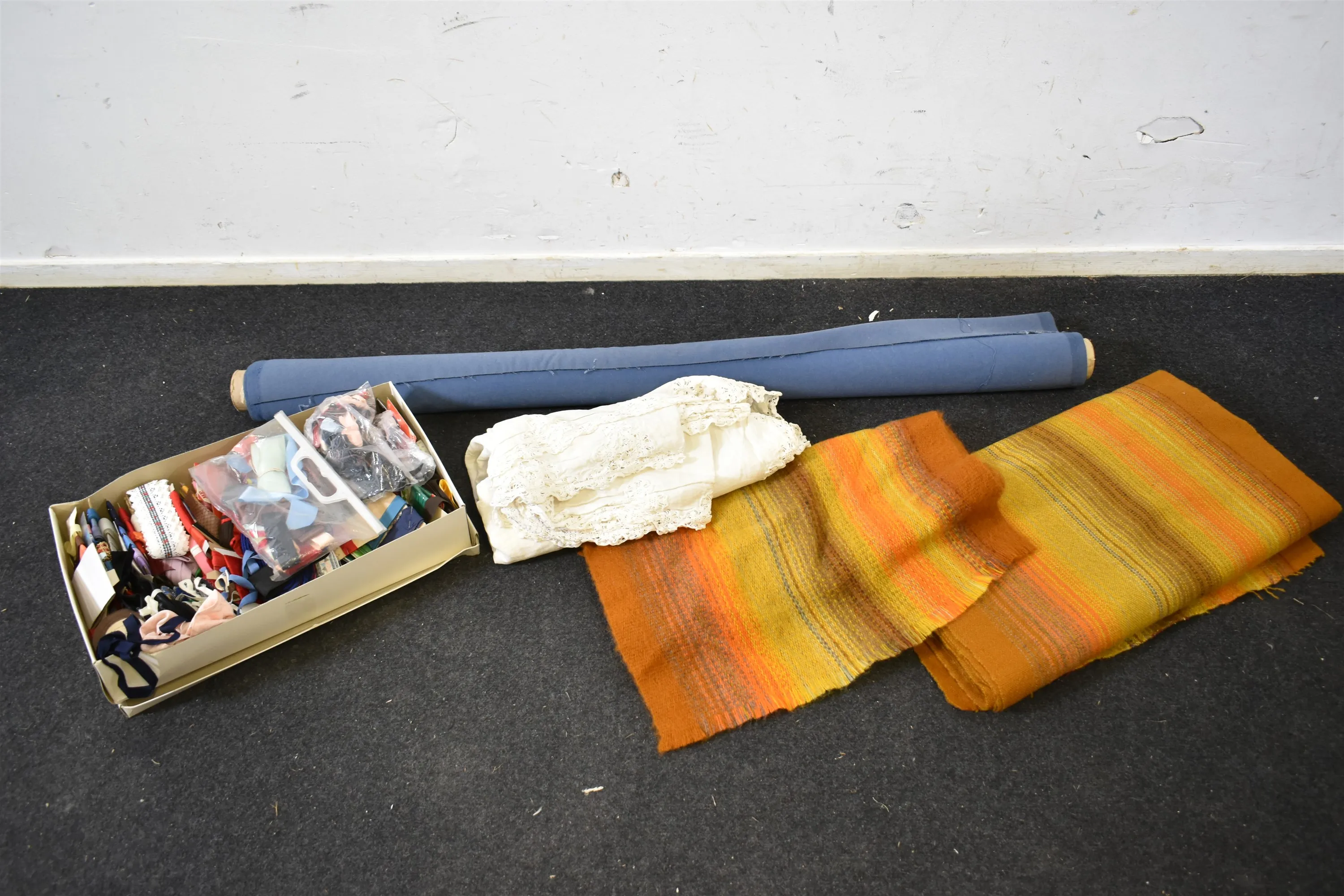 11677. Parti textilier bla tyg på rulle och diverse band till sömnad, längd på rulle 133 cm