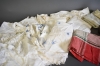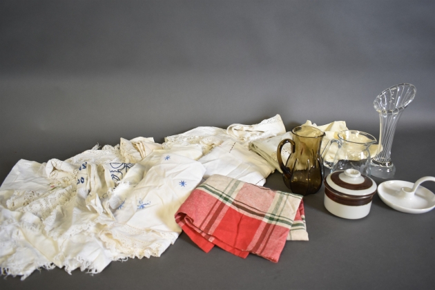 15038. Parti textilier, glas bla hundbensvas och lockburk Arabia, högsta höjd 30 cm