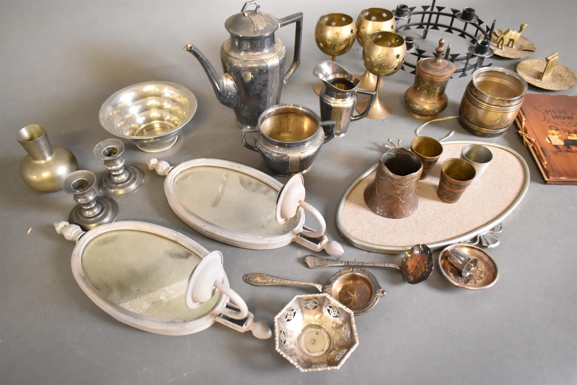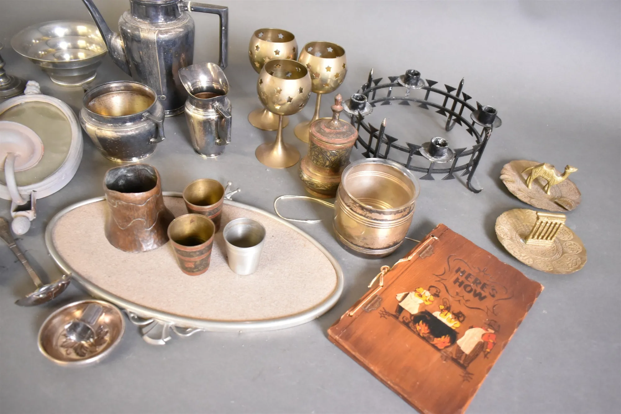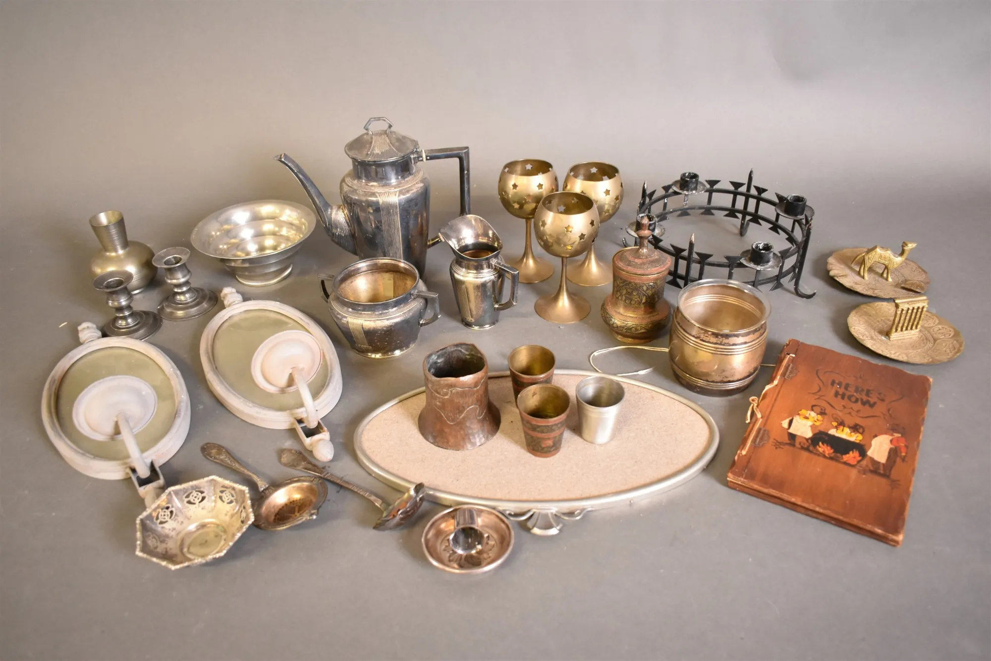 12992. Parti trä/metall bl.a nysilver & tenn högsta 24 cm
