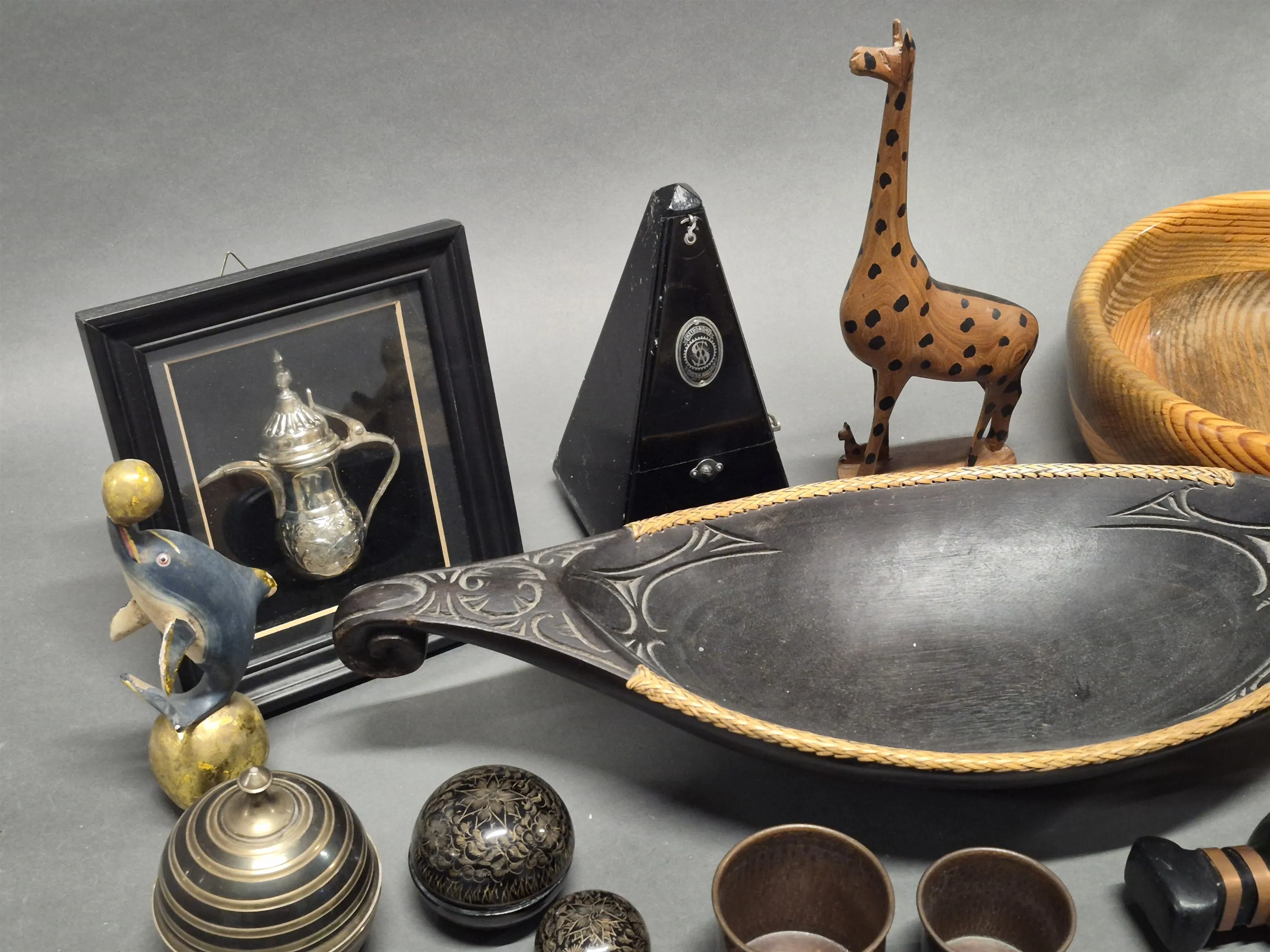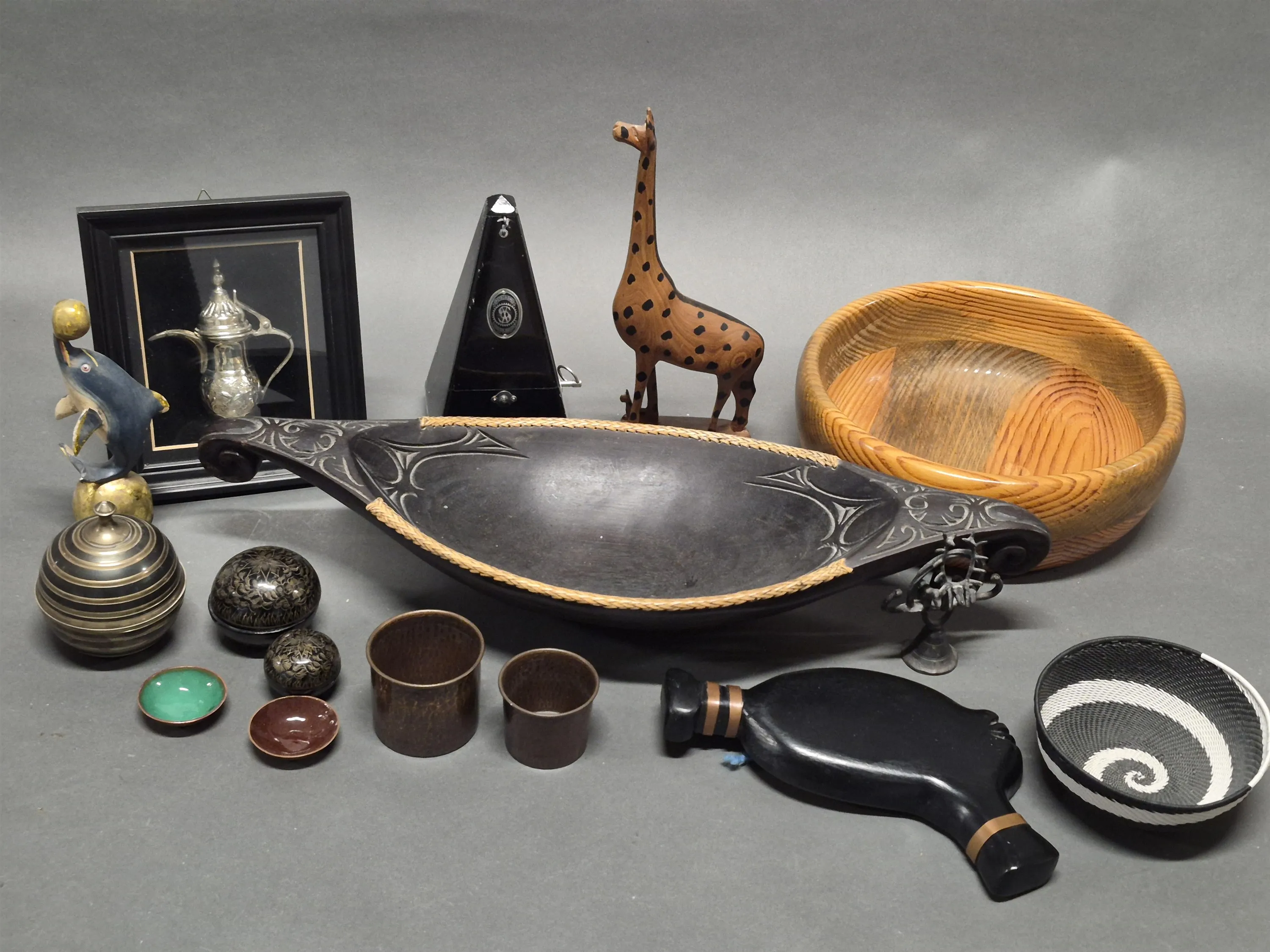 18494. Parti träföremål bl.a fat & metallkanna i monter högsta 28 cm