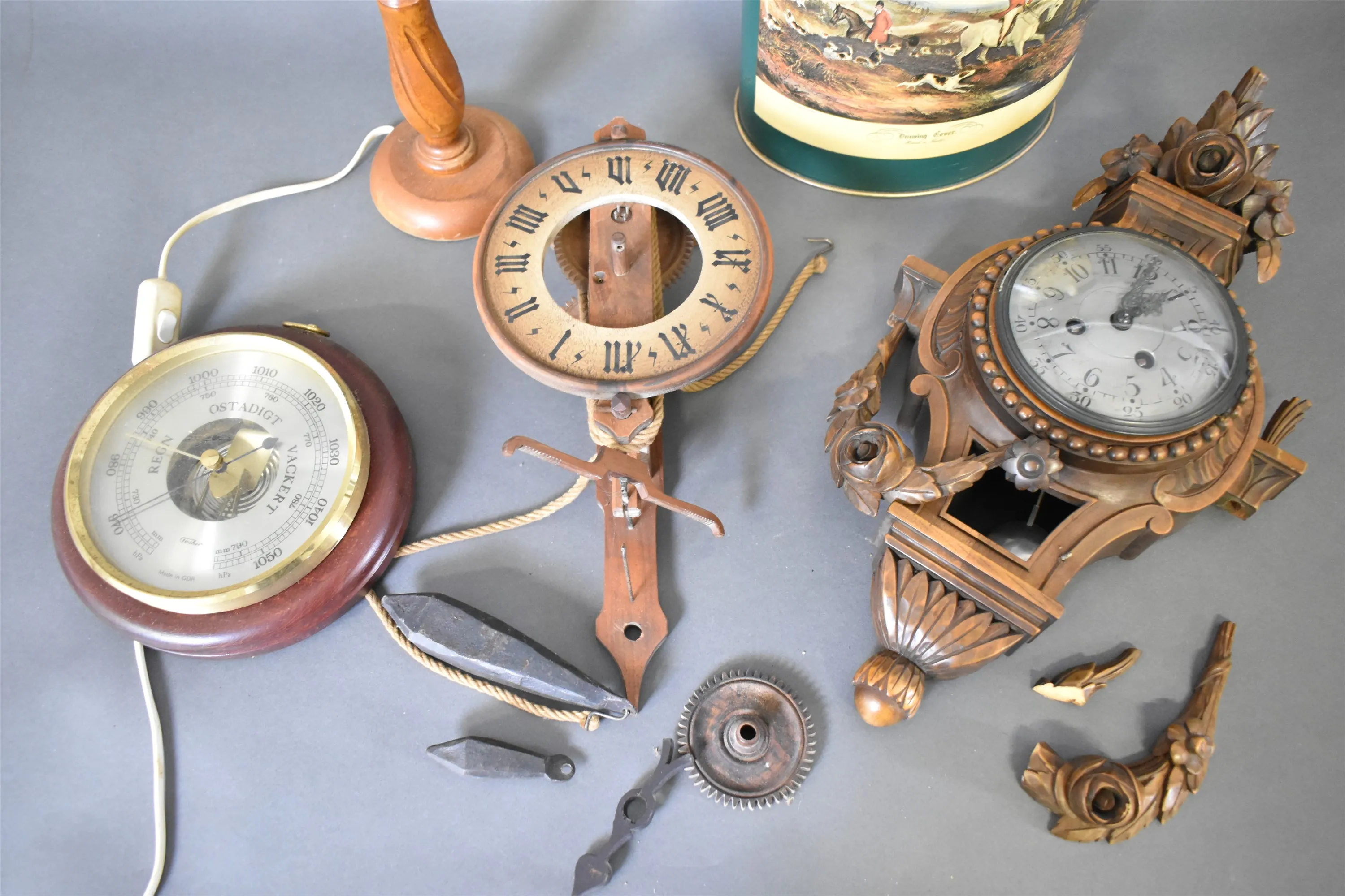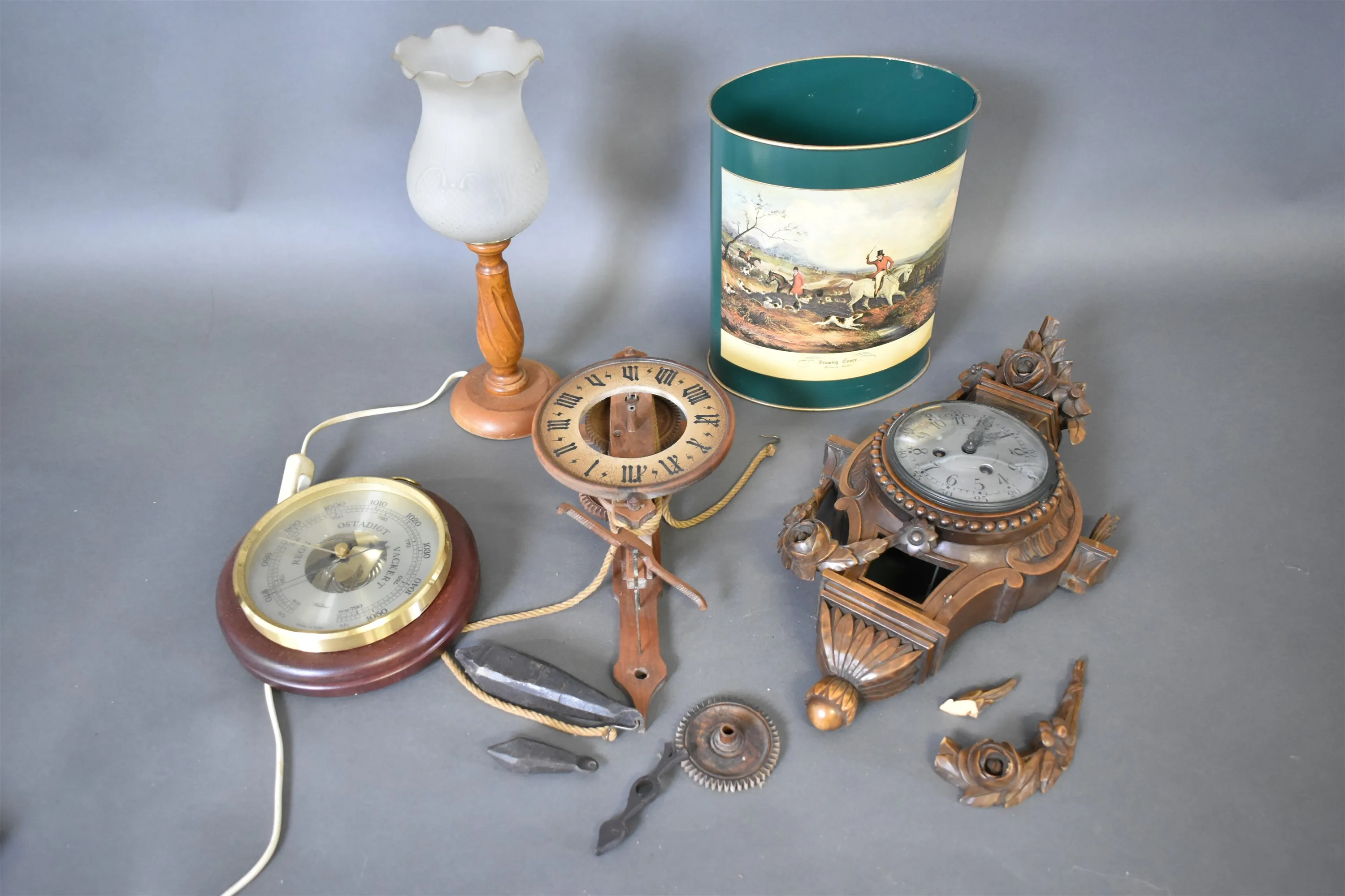 12380. Parti väggur, barometer, bordslampa & papperskorg, högsta 30 cm
