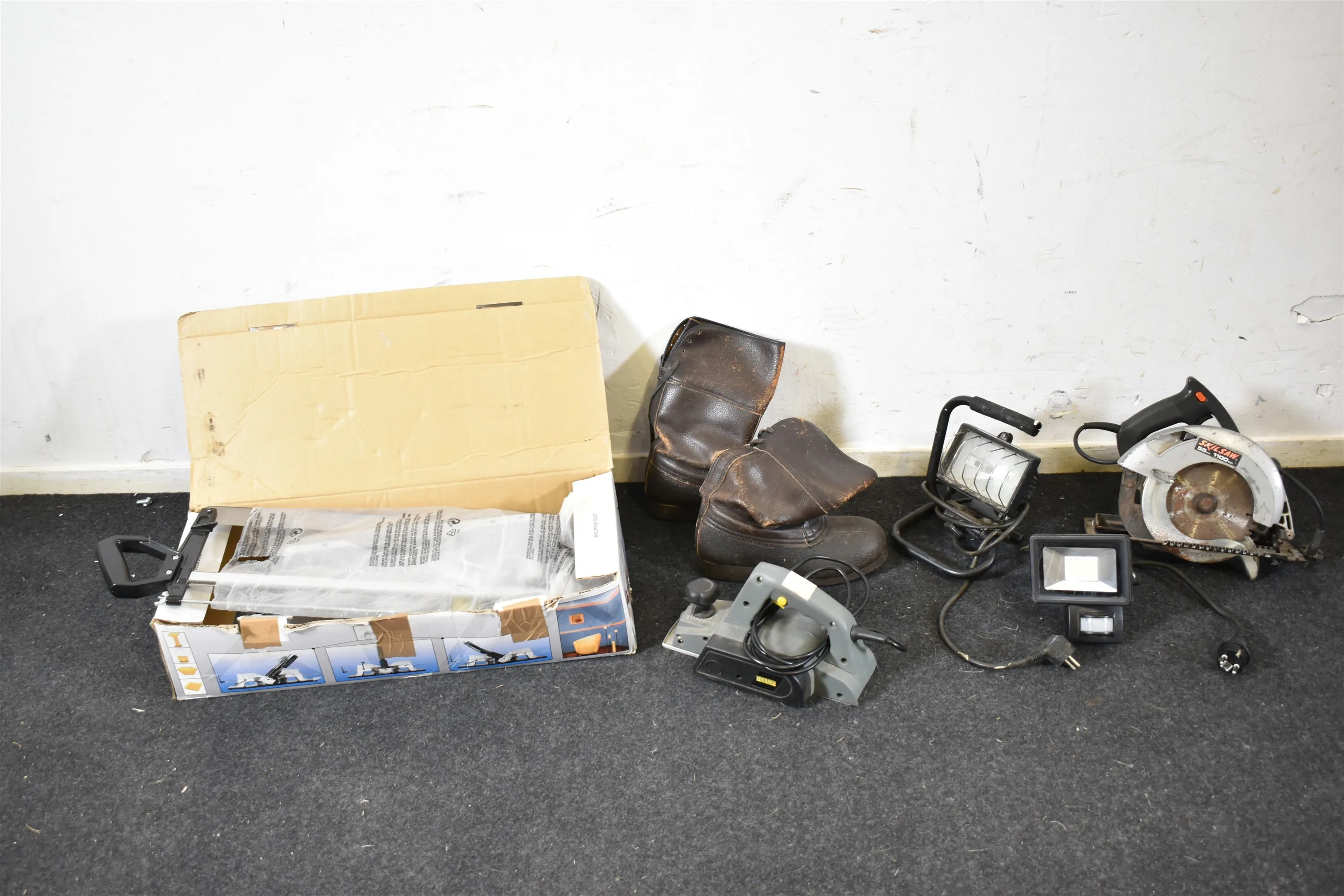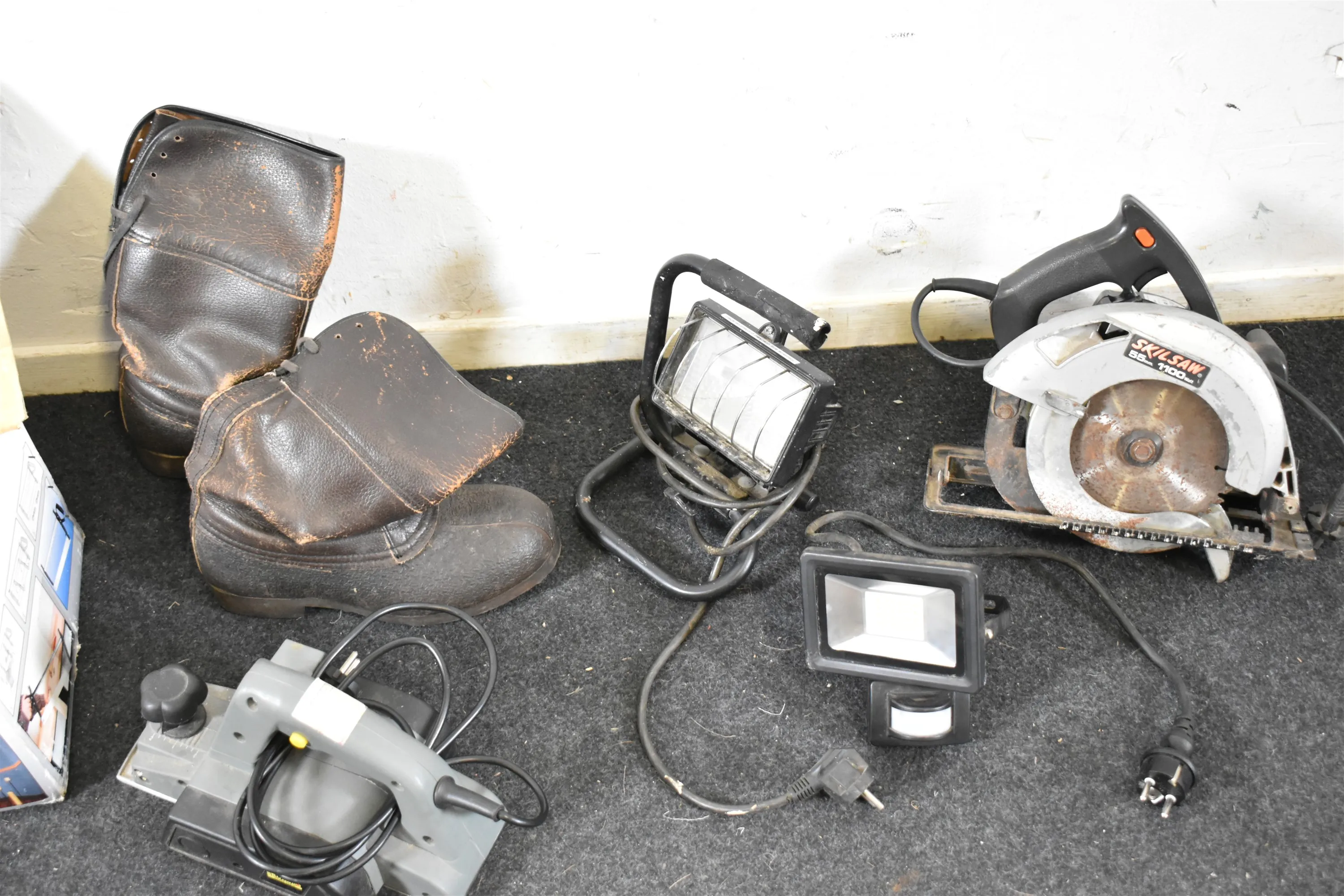 16430. Parti verktyg bla elverktyg, giringssåg och arbetsstövlar