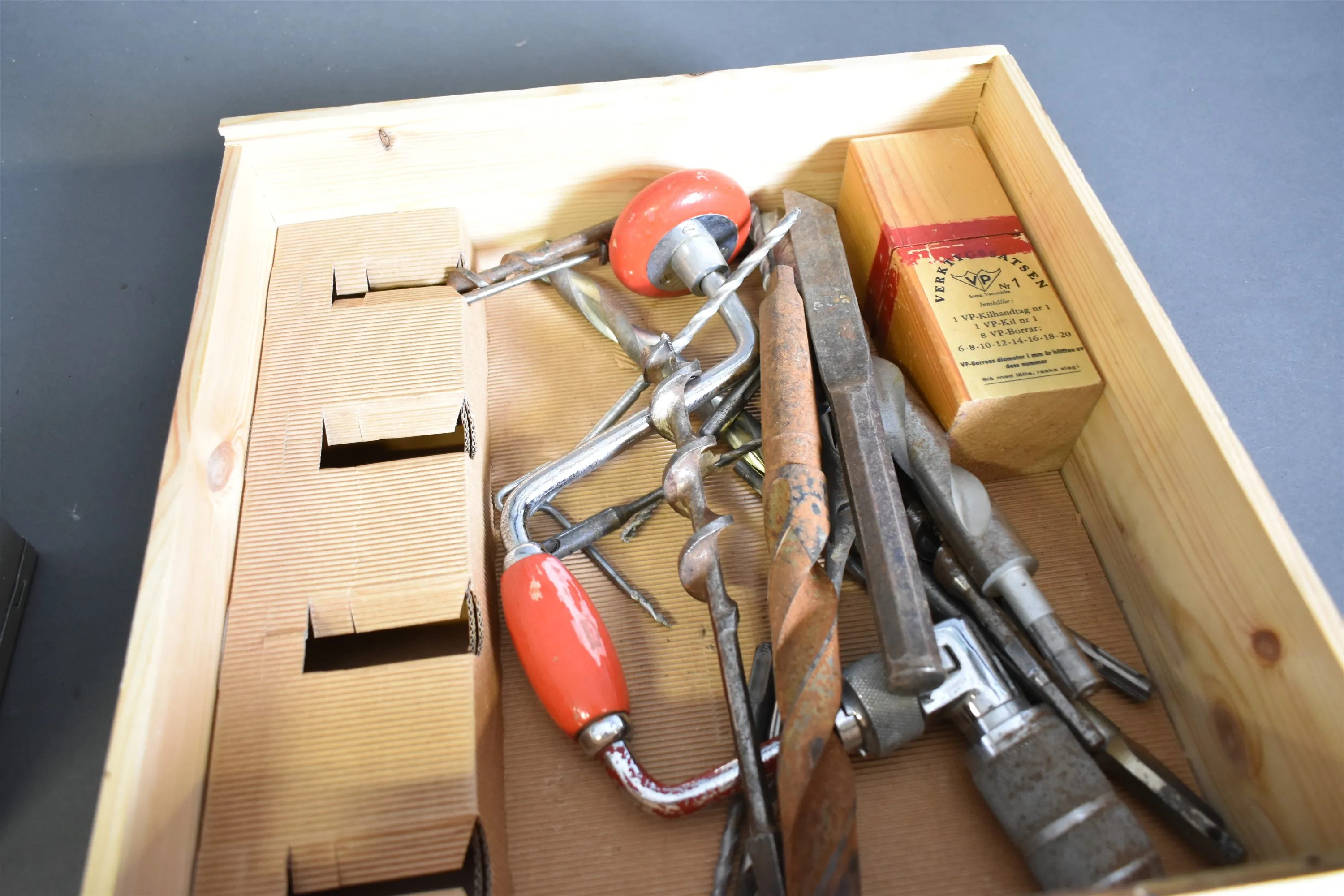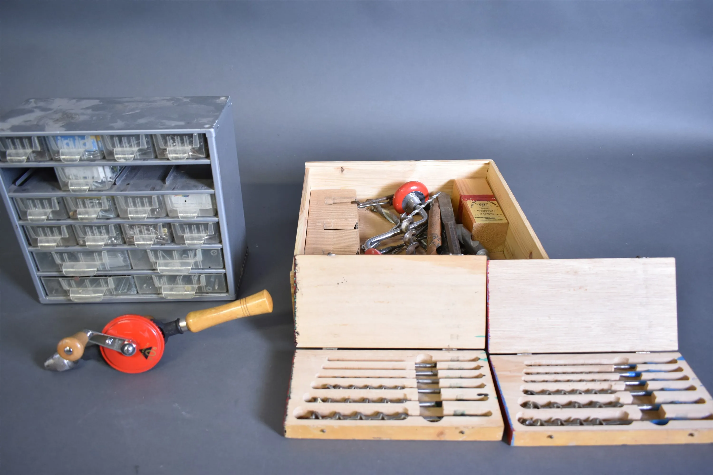 14322. Parti verktyg, borr och sortimentslåda med innehåll, högsta höjd 28 cm