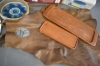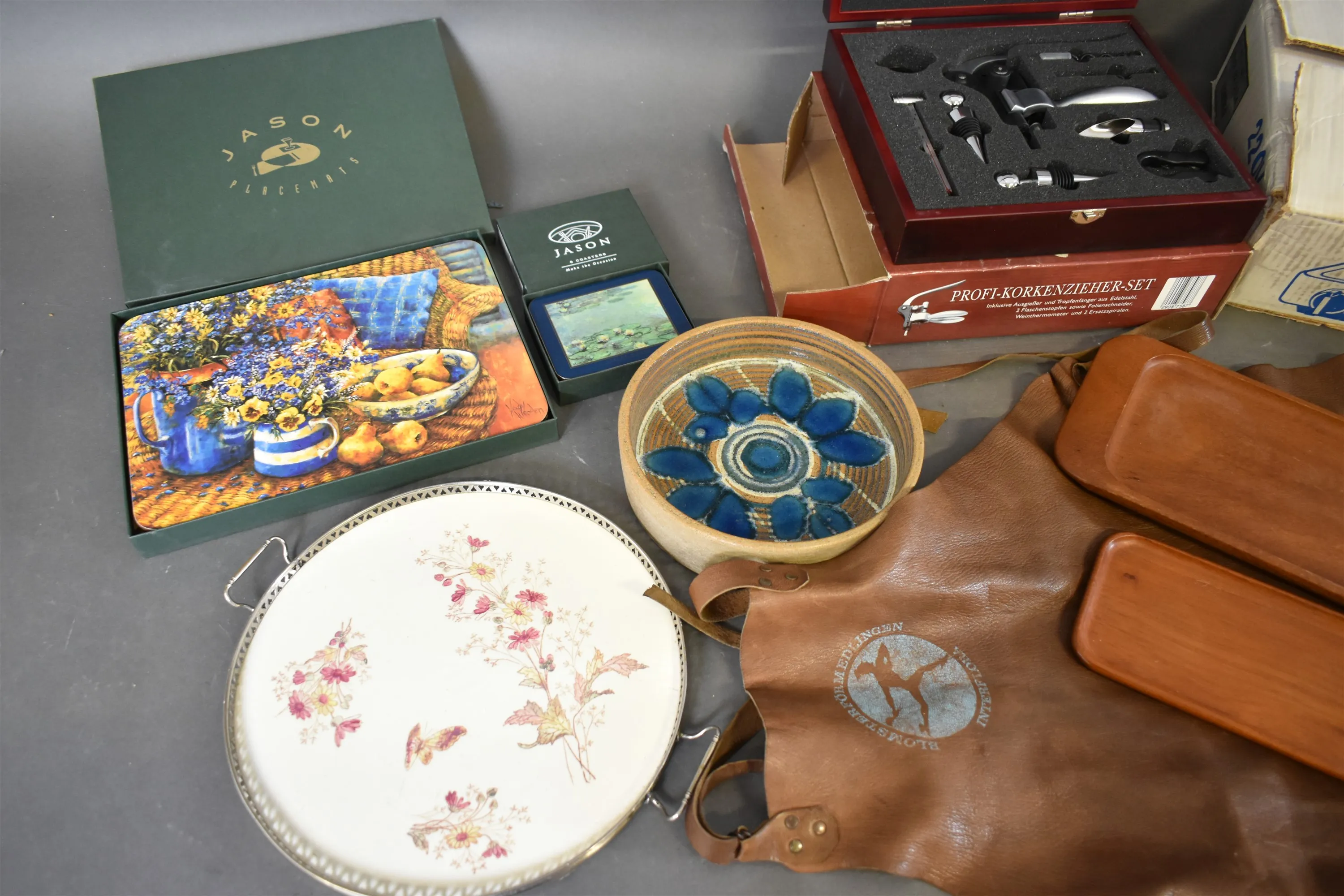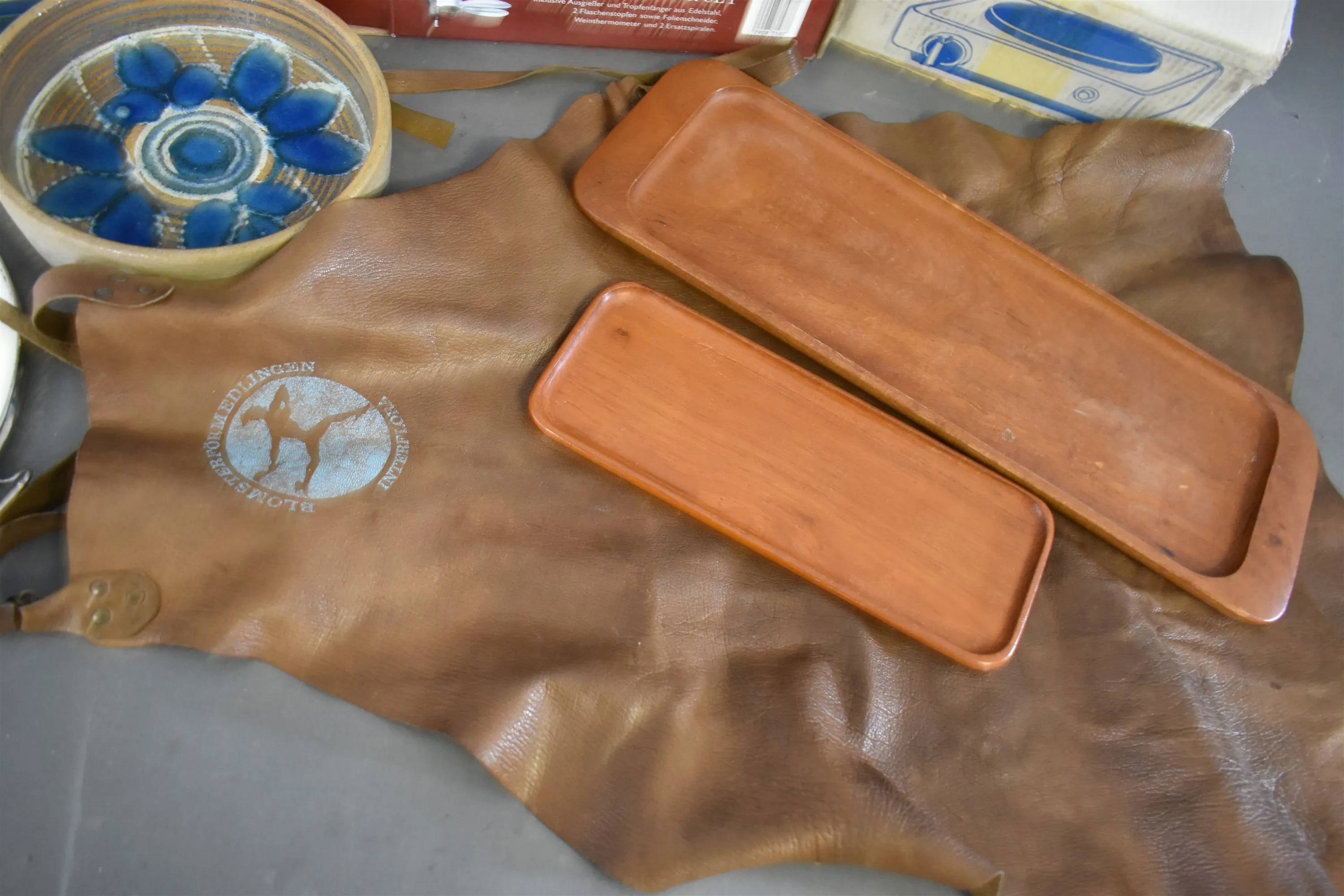 14666. Parti vinset, underlägg, teakbrickor & förkläde längsta bricka 49 cm
