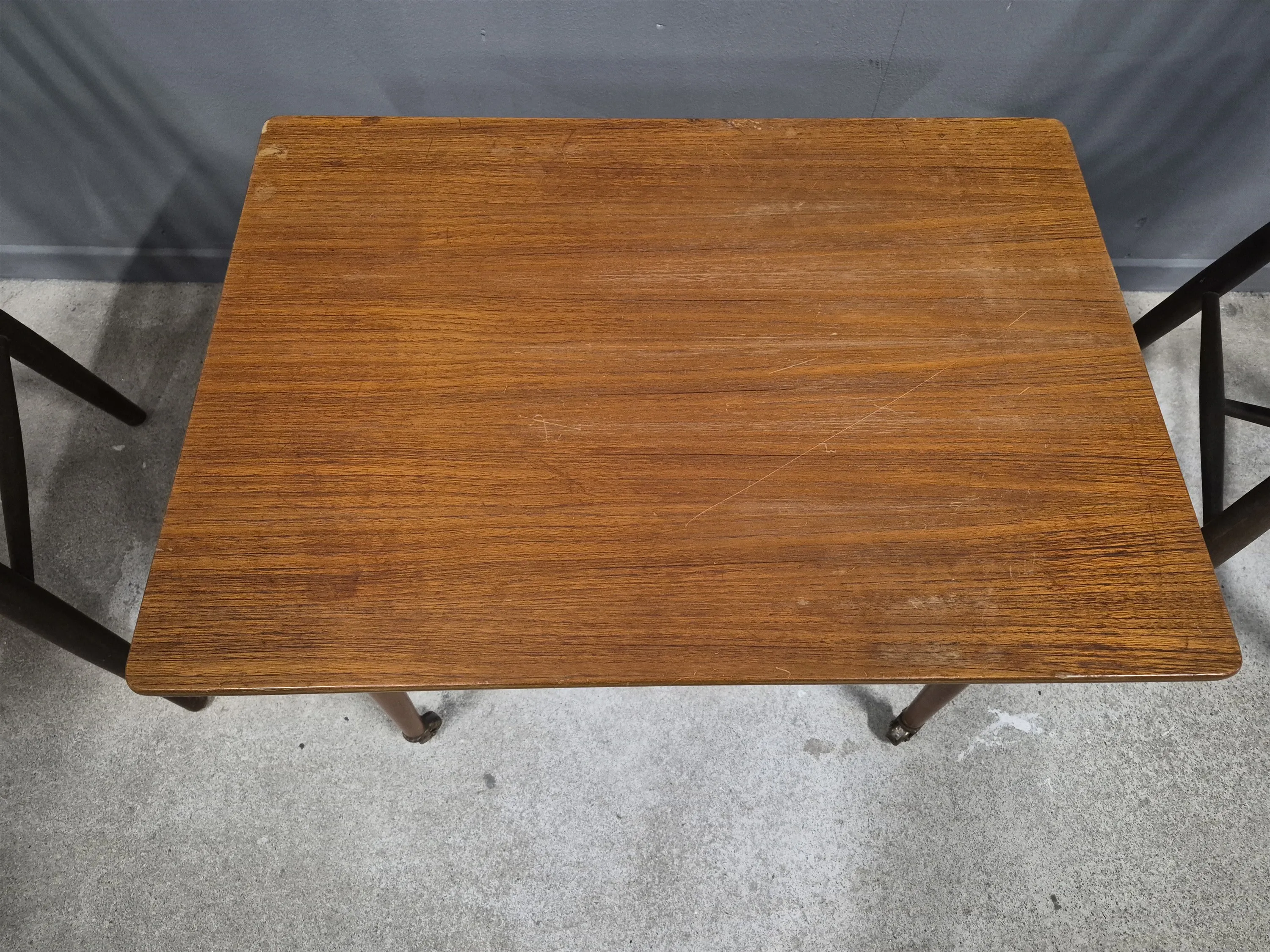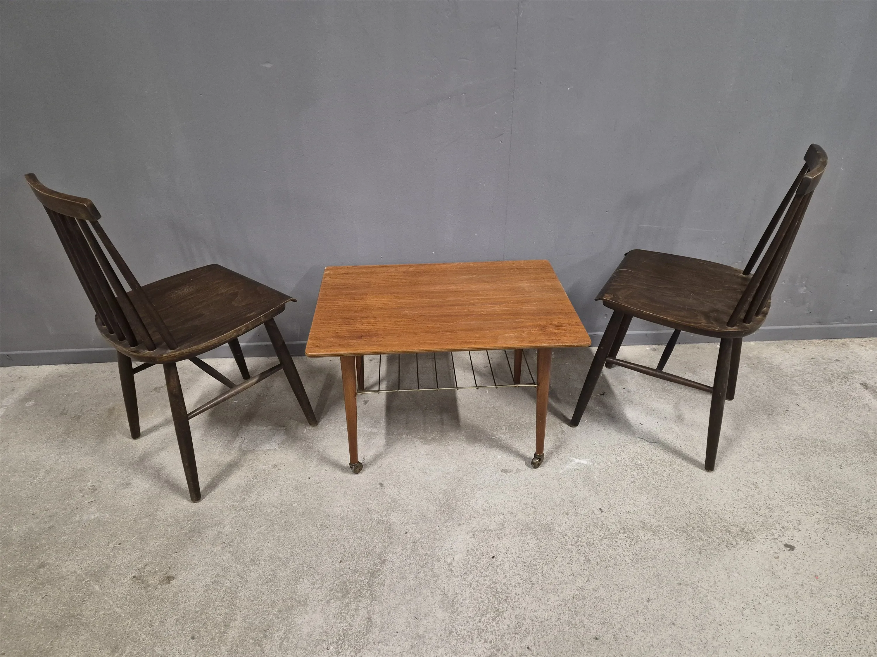 18087. Pinnstolar 1 par, teakbord på hjul högsta 83 cm