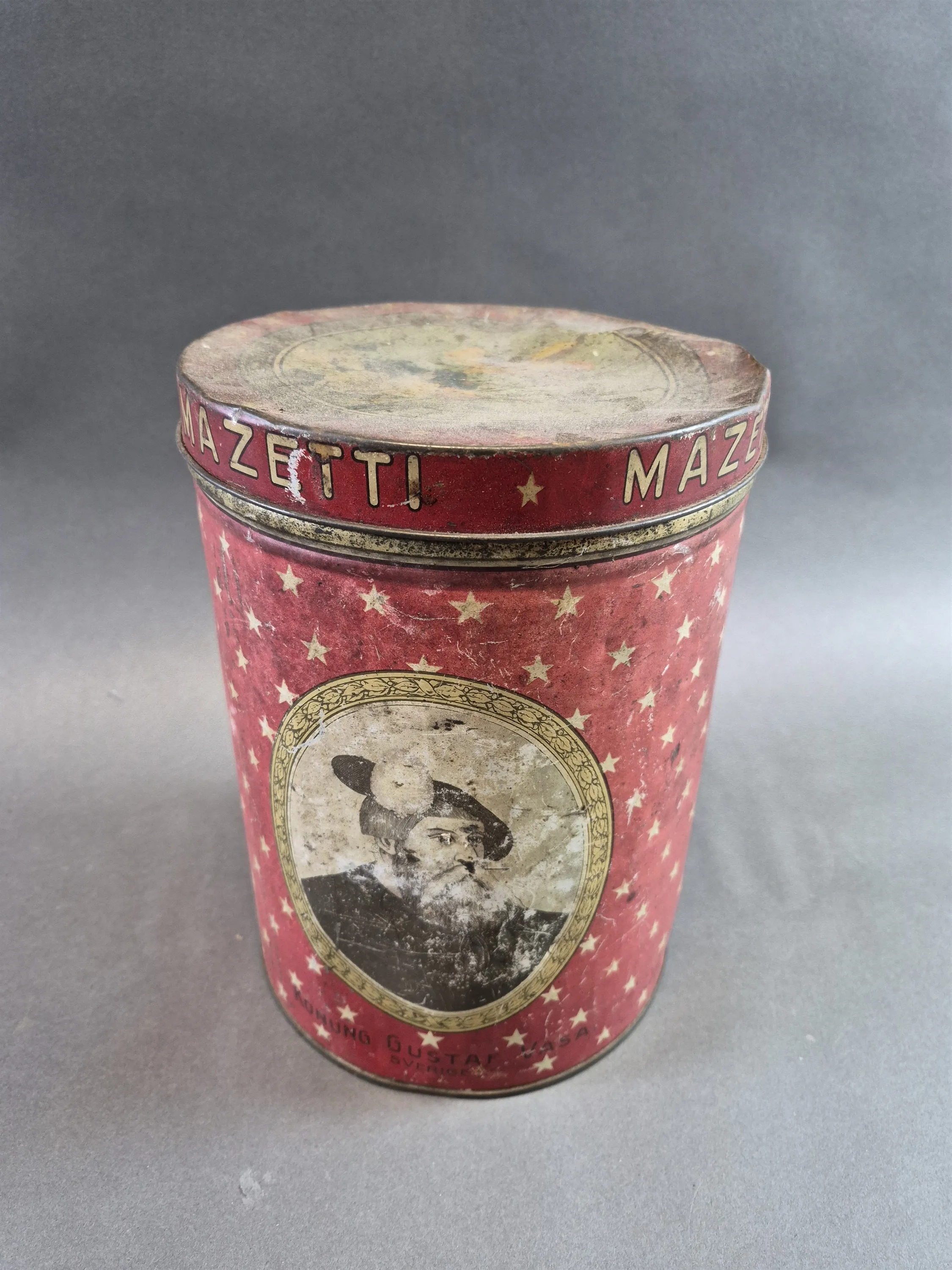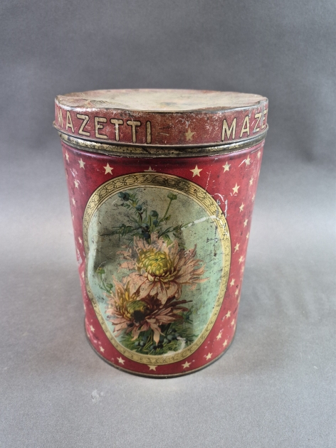 20177. Plåtburk Mazetti, bucklor finns, höjd 25 cm