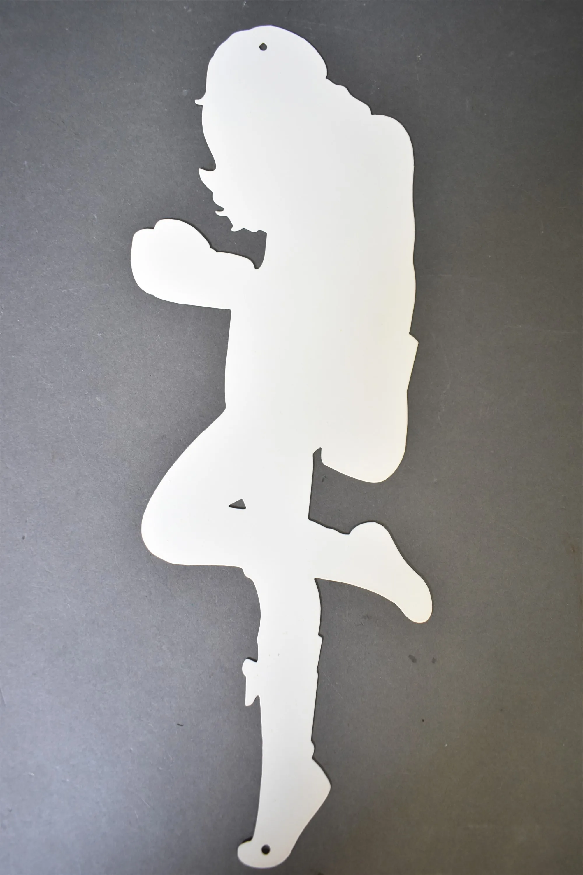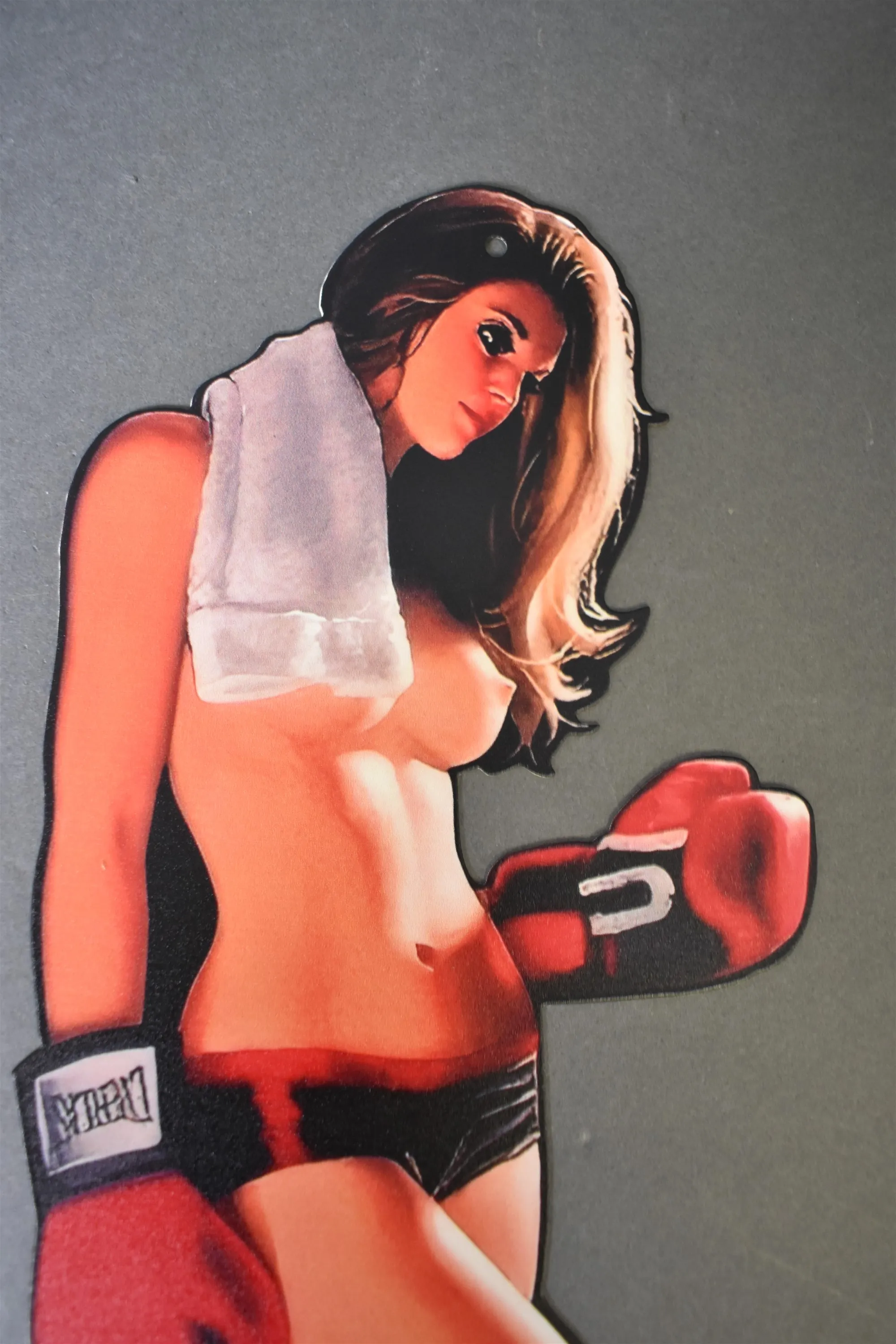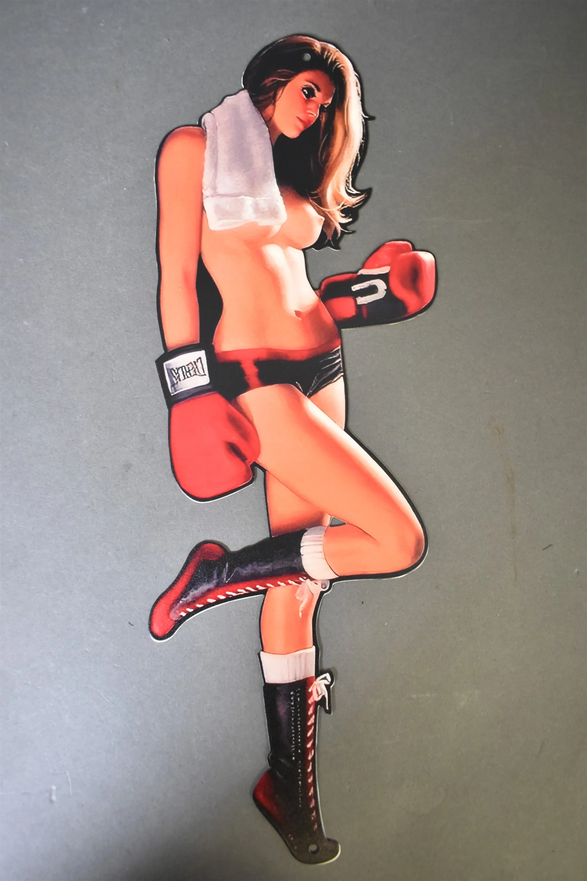15614. Plåtskylt Pinuppa, Boxningskvinna, senare tillverkad, höjd 40 cm