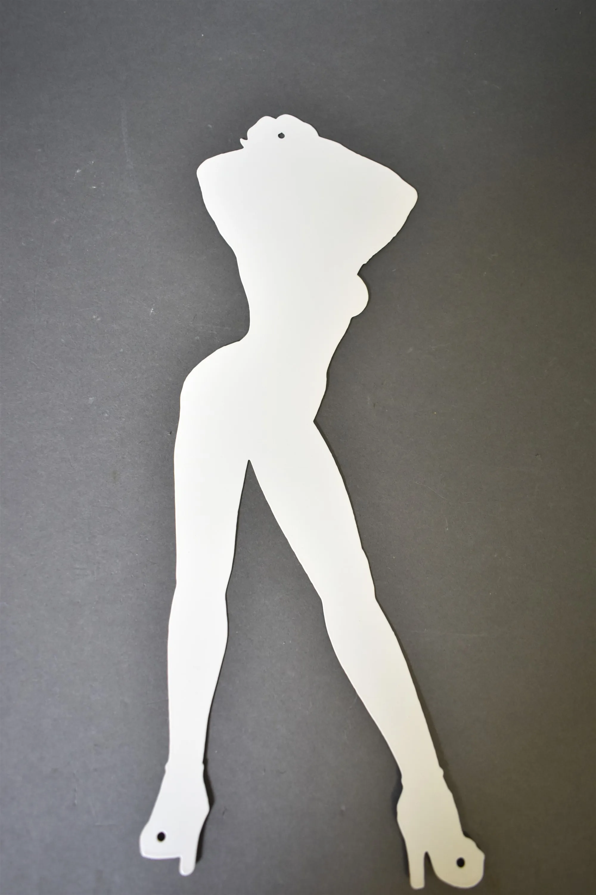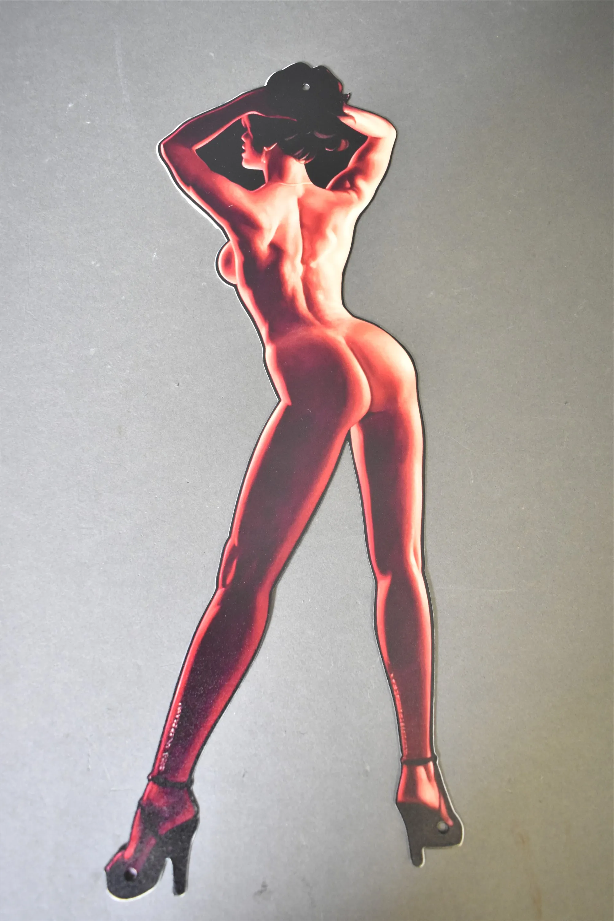15621. Plåtskylt Pinuppa, Kvinna, senare tillverkad, höjd 40 cm