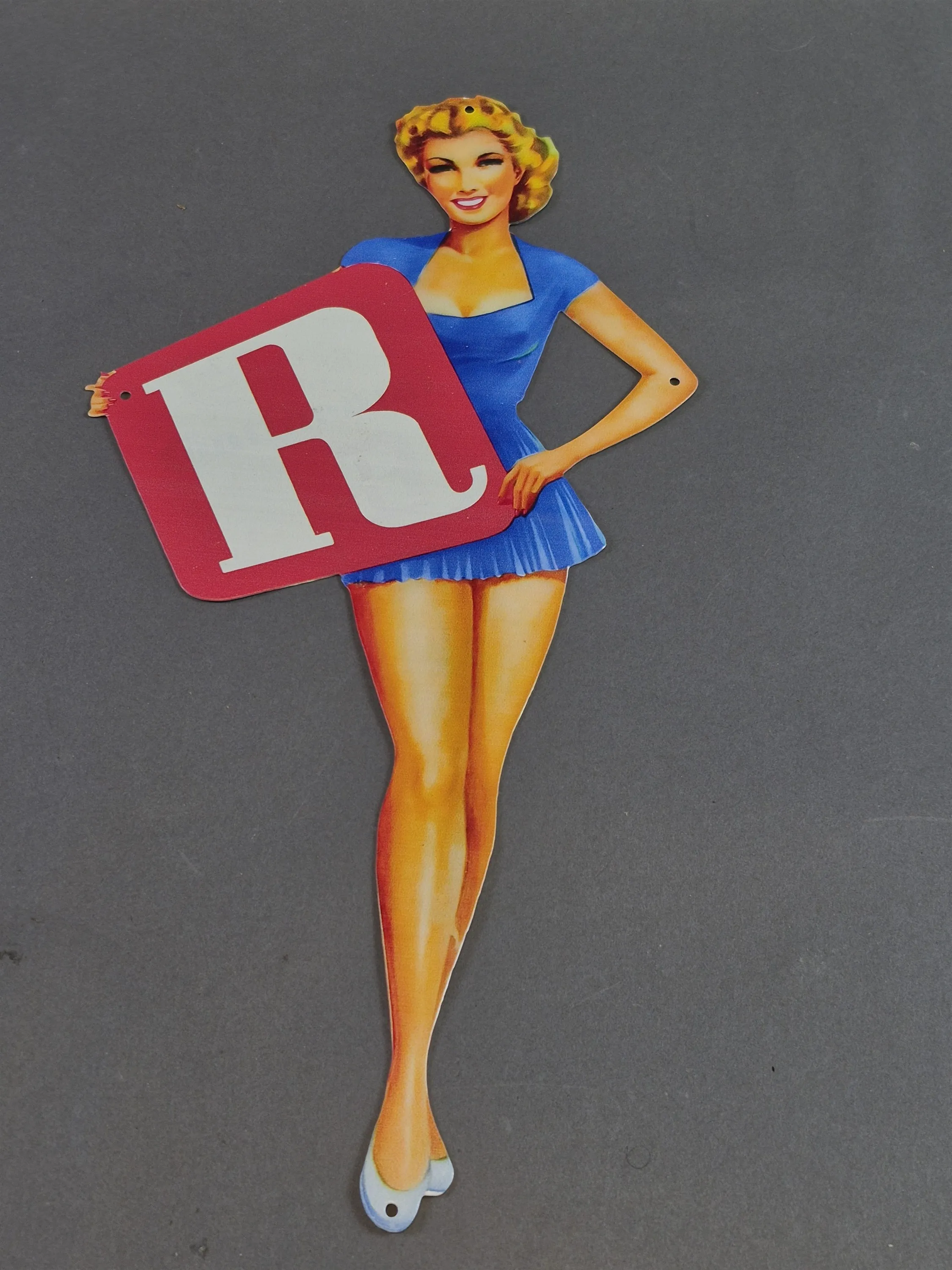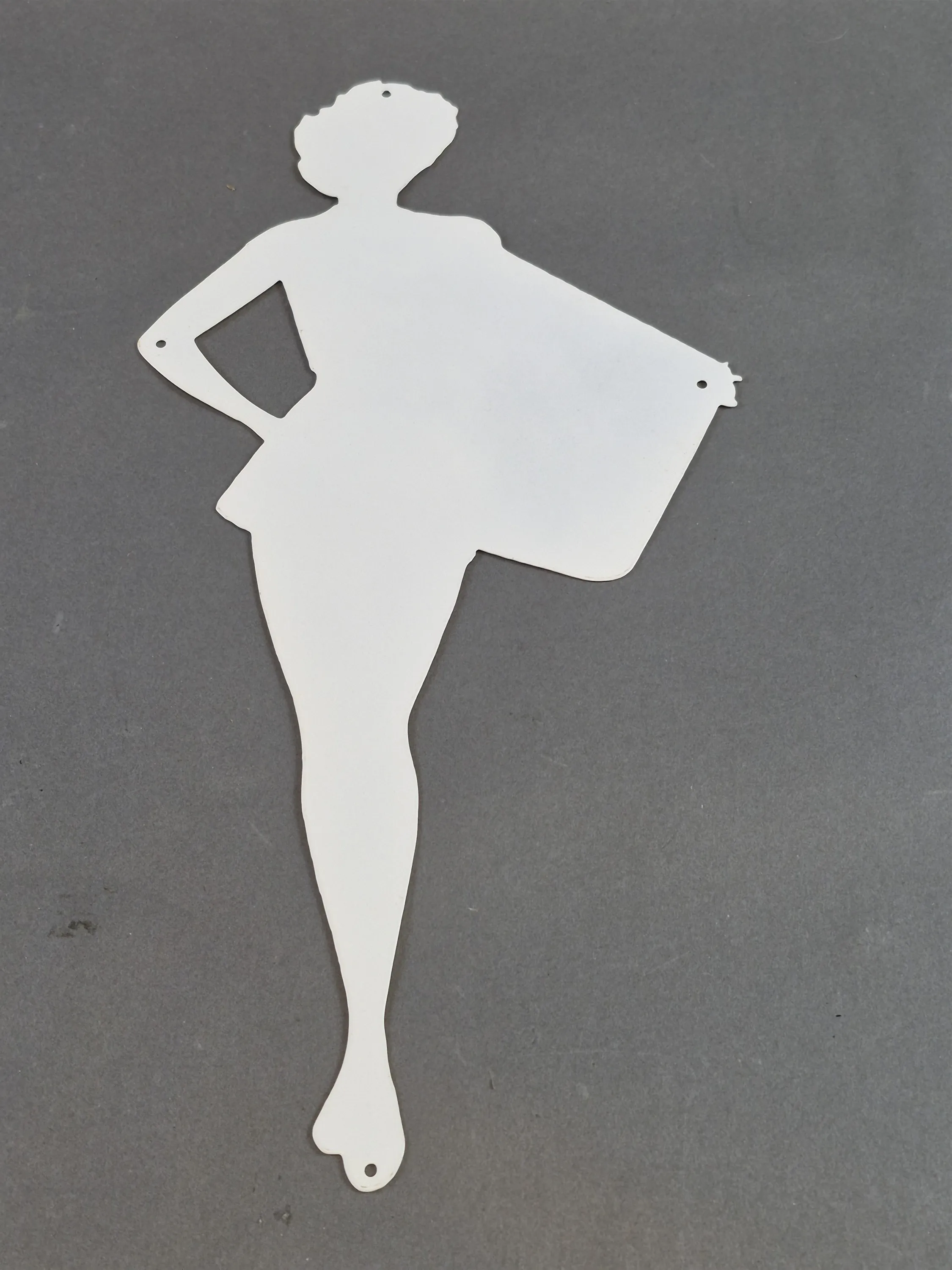 20184. Plåtskylt Pinuppa, Kvinna, senare tillverkad, höjd 40 cm