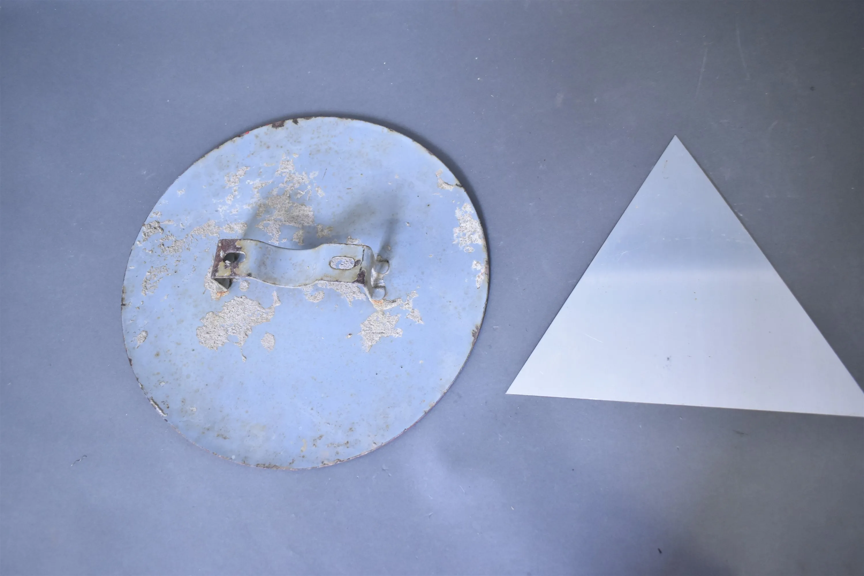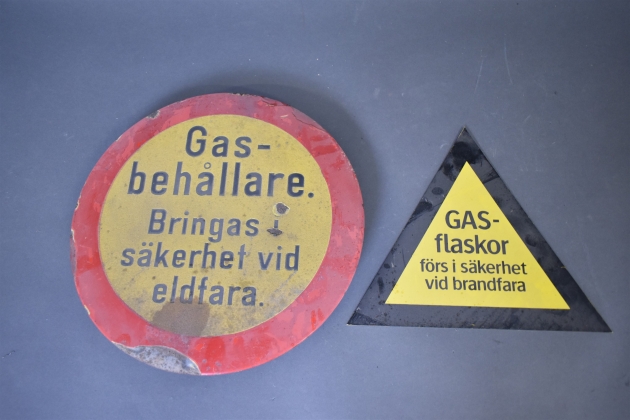 13231. Plåtskyltar 2 st Gas-flaskor, största diameter 34 cm