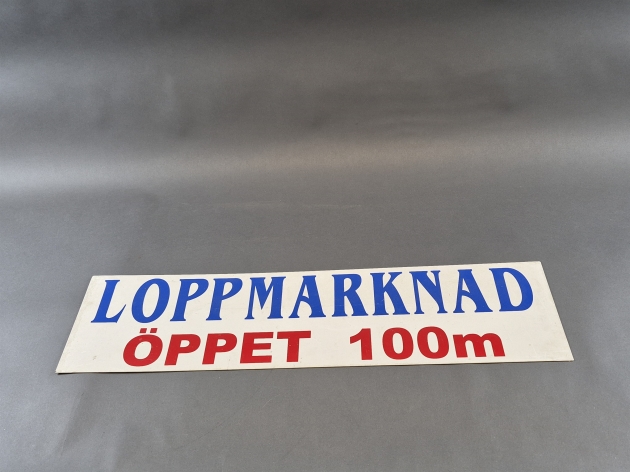 20188. Plåtskylt, Loppmarknad Öppet 100 M, mått 100 x 25 cm