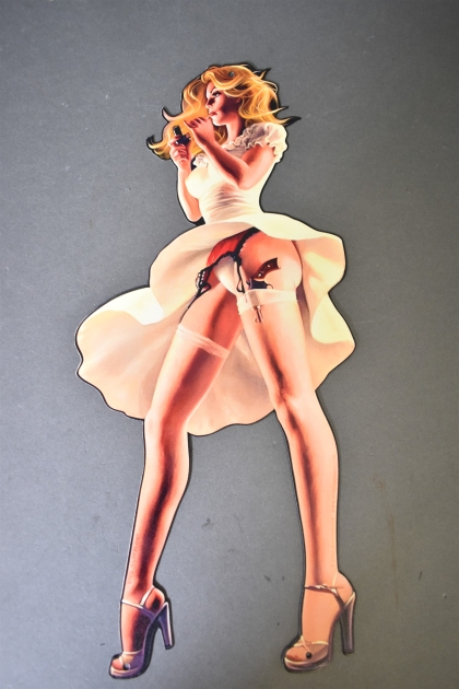 15615. Plåtskylt Pinuppa, Kvinna med gul klänning, senare tillverkad, höjd 40 cm