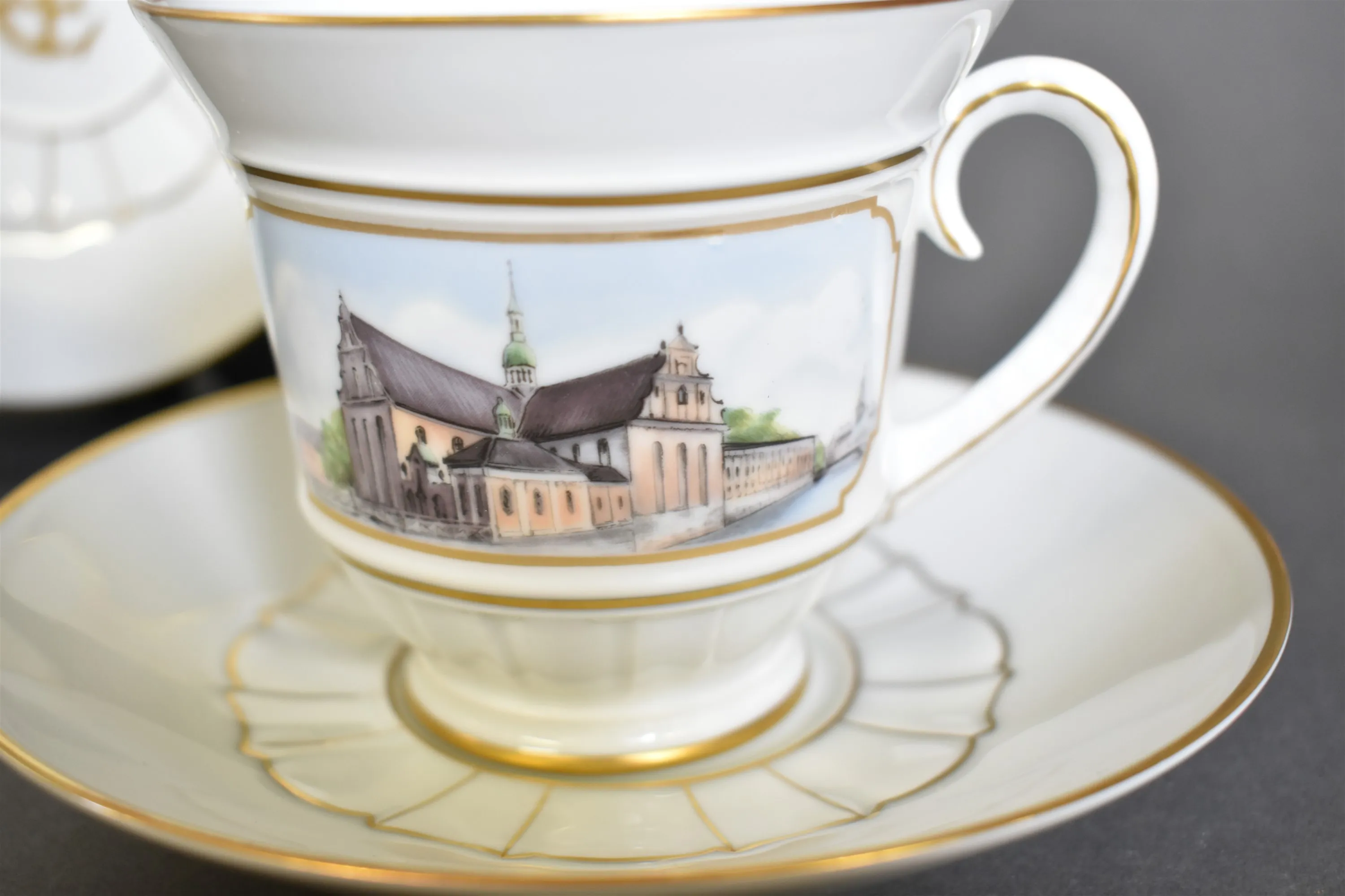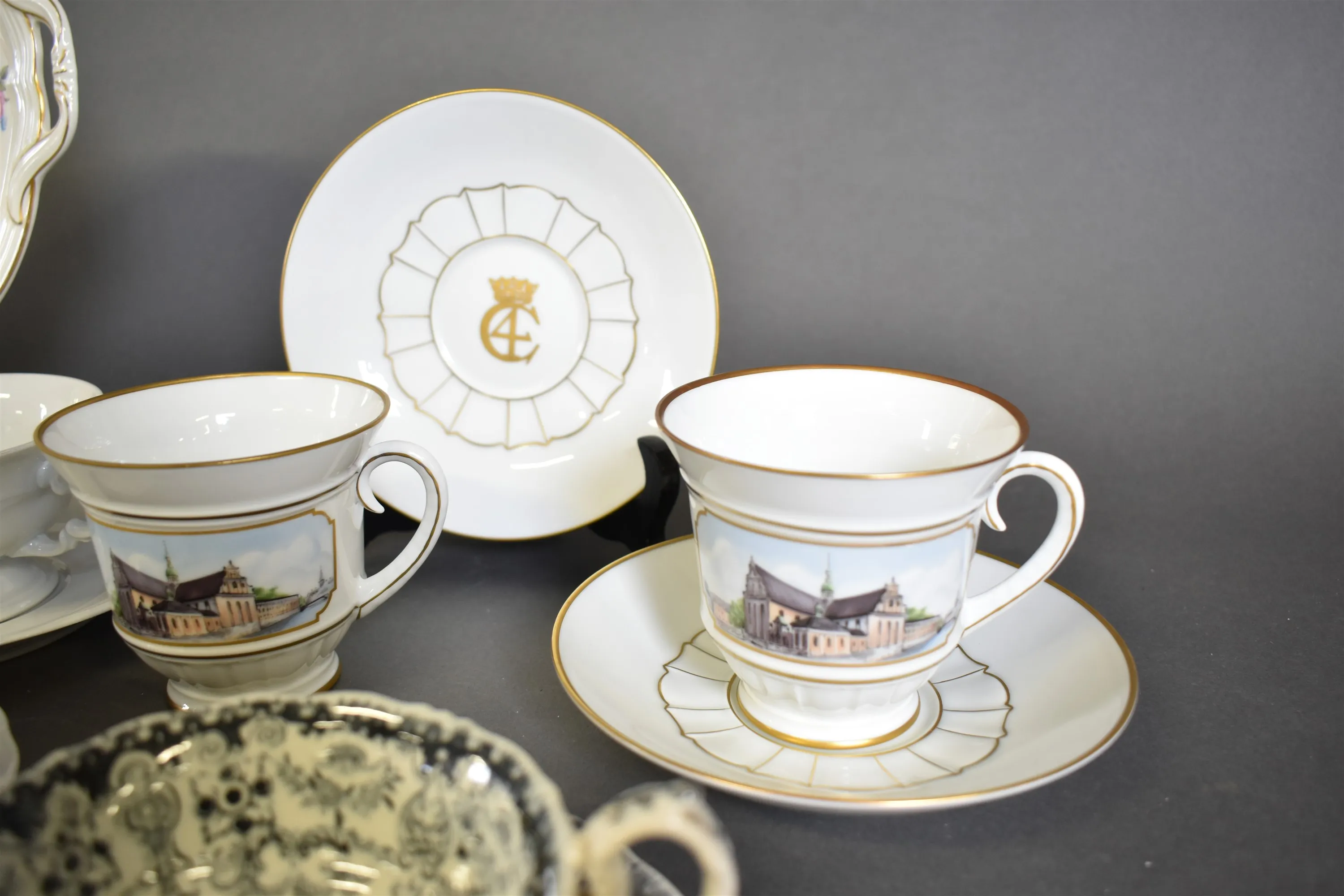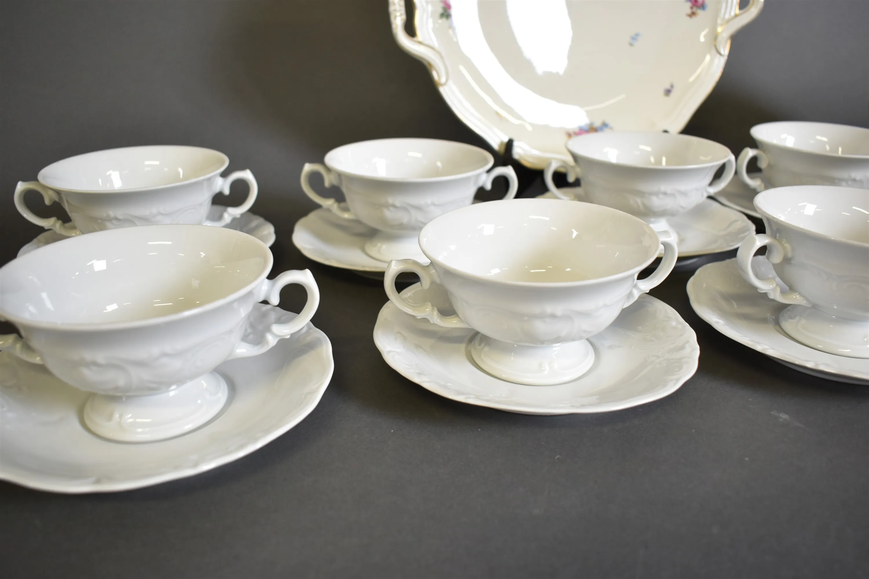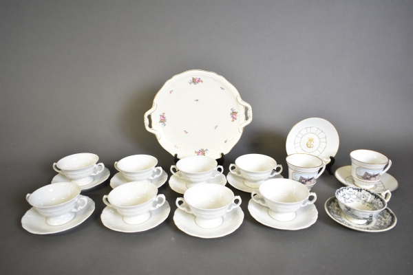 11388. Porslin bla buljongkoppar med fat 8 personer, fat Rosenthal och kopp med fat B&G 2 personer, längsta mått 33 cm