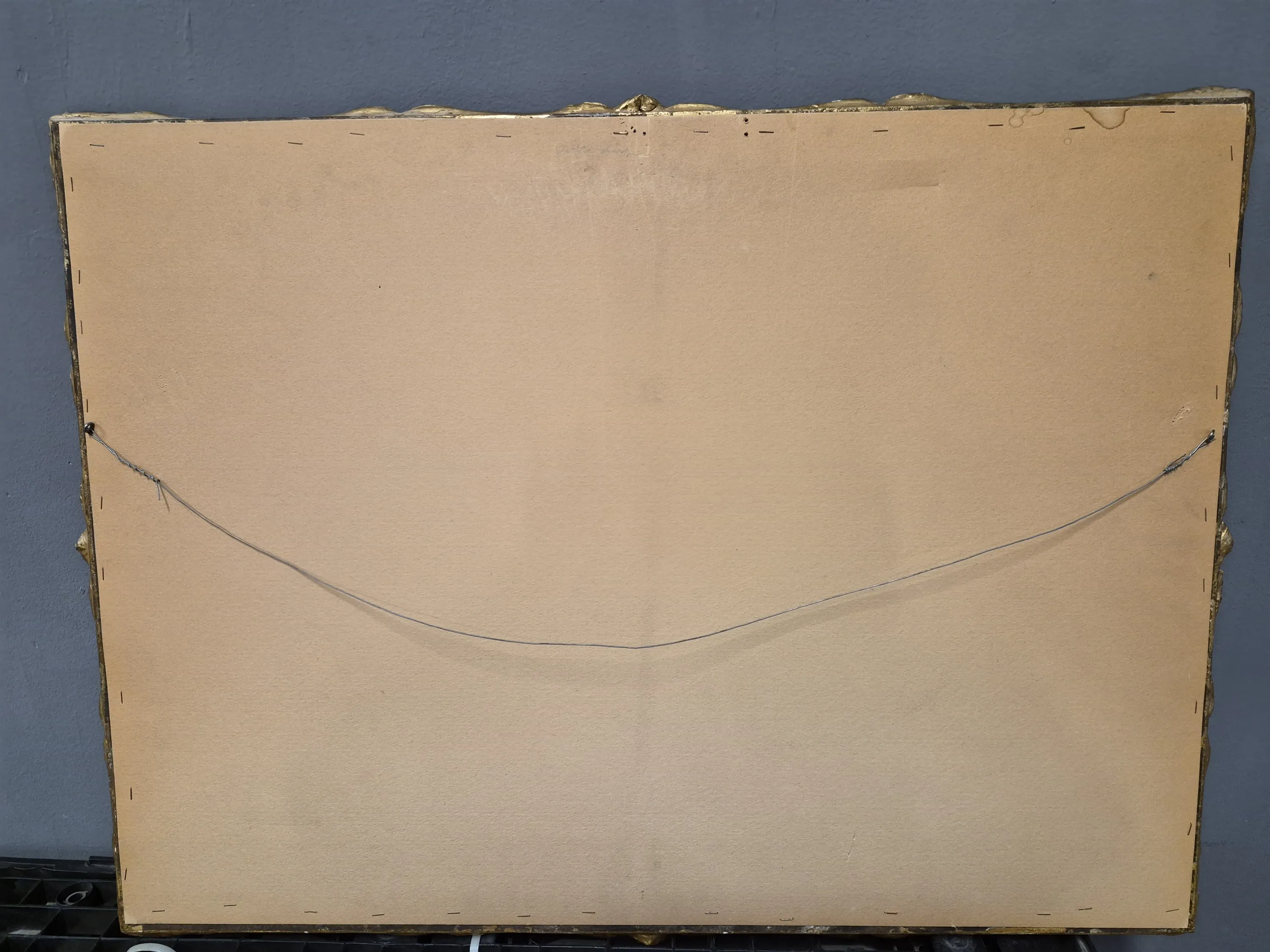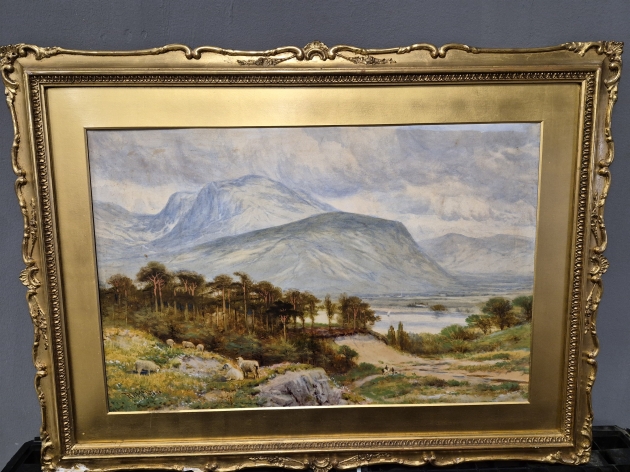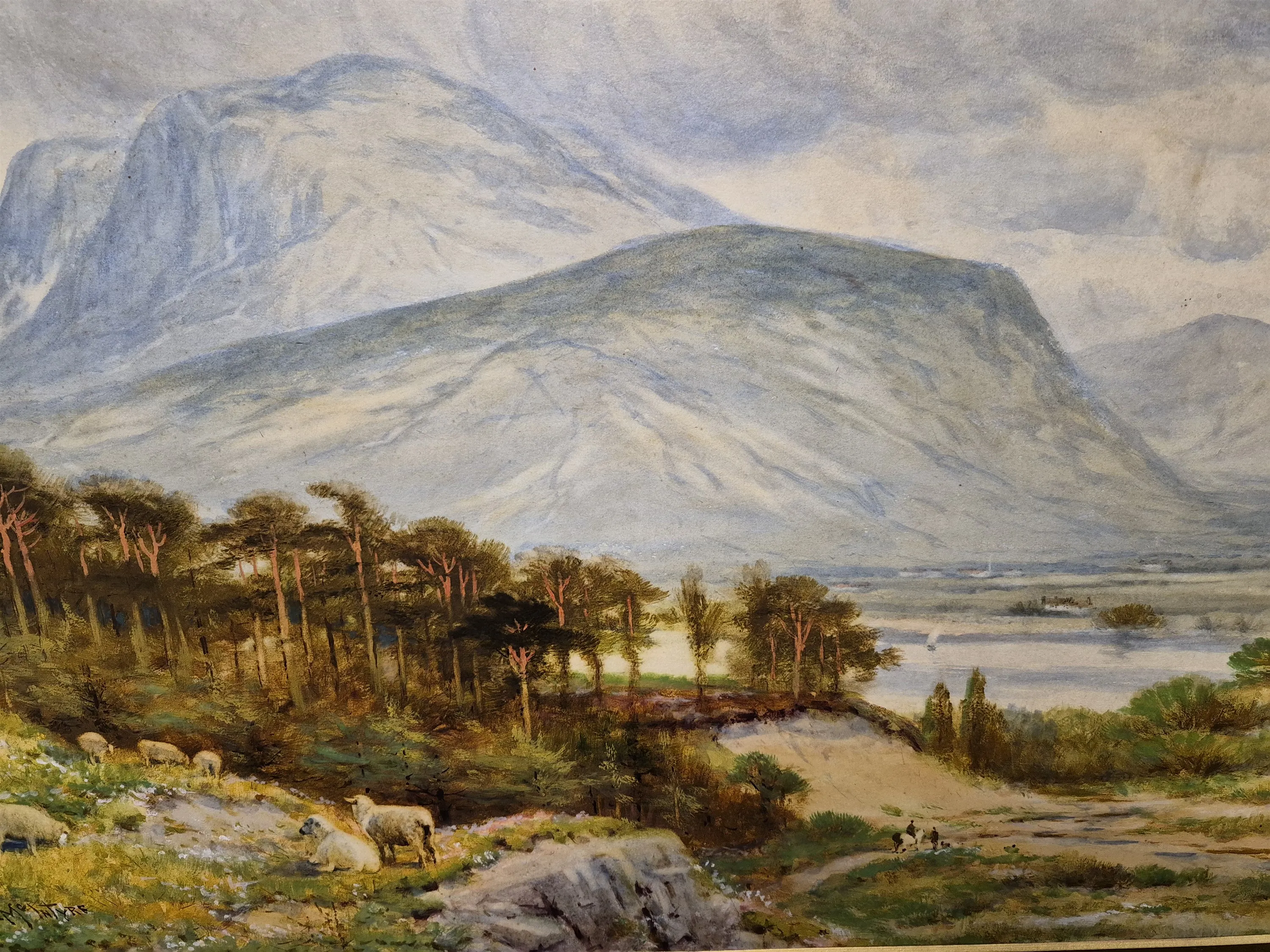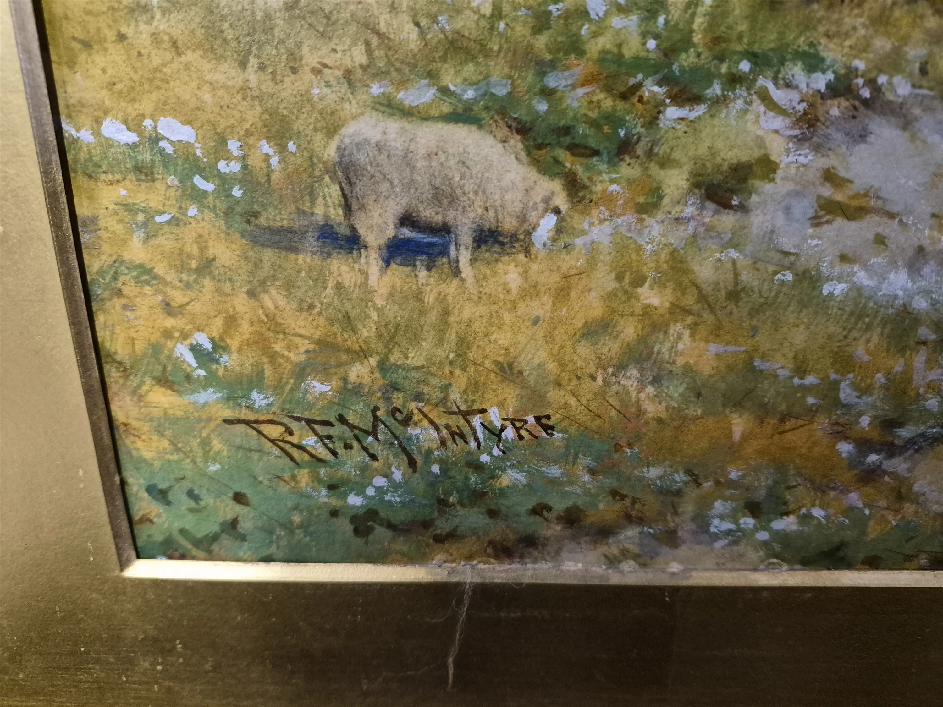 17722. R.F.McIntyre olja på pannå, "Får vid sjö", mått 98 x 74 cm
