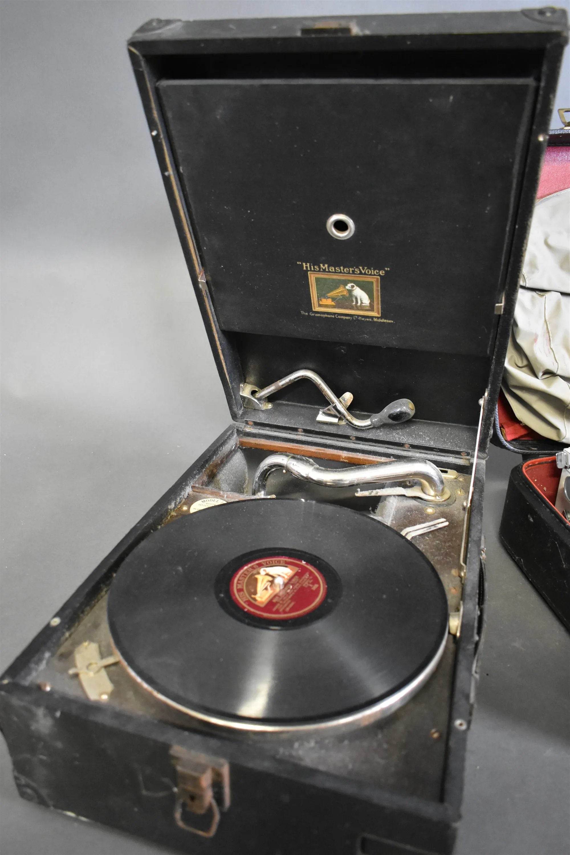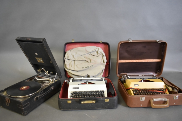 16621. Resegrammofon "His masters voice" och skrivmaskiner 2 st, ej testade, lukt finns