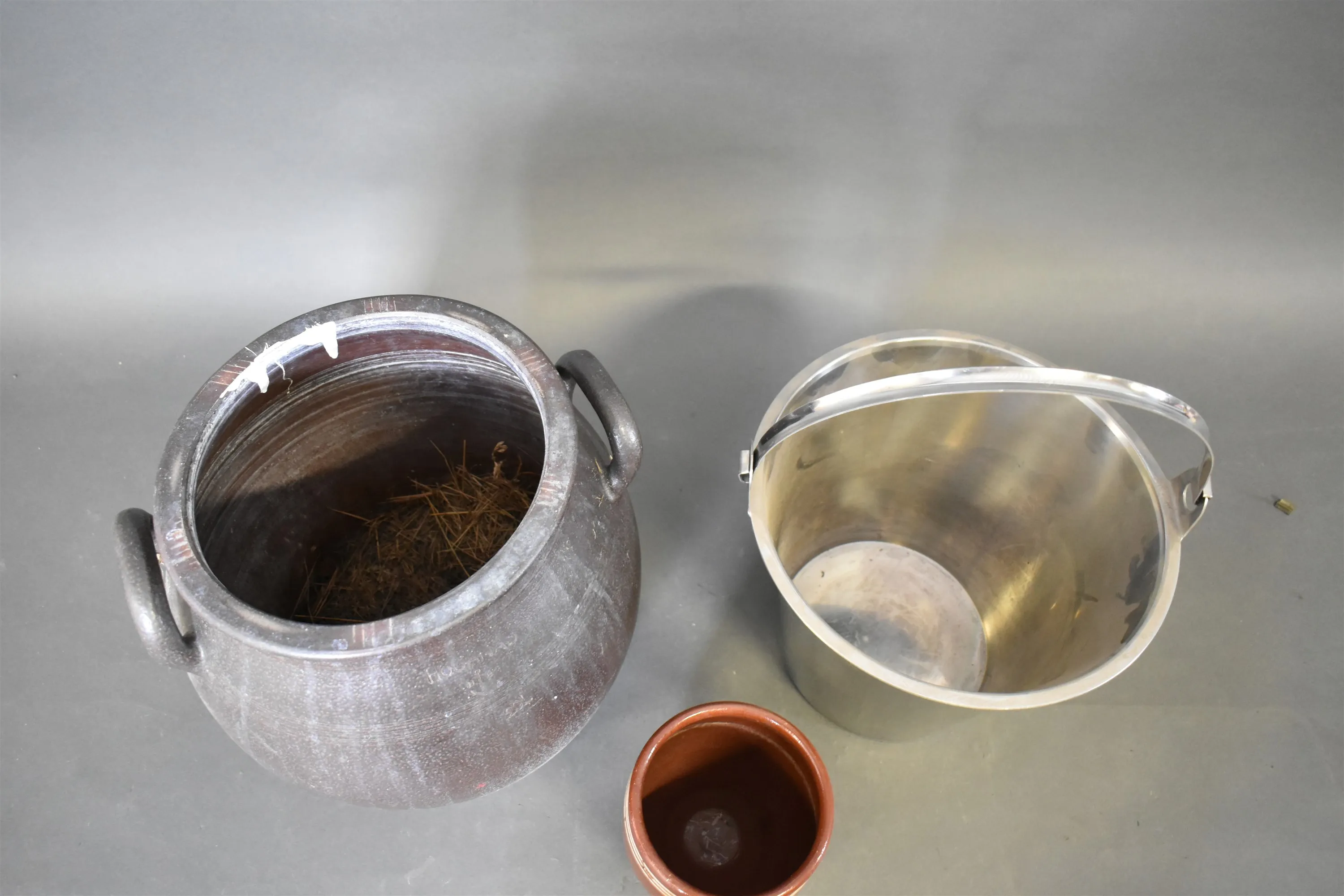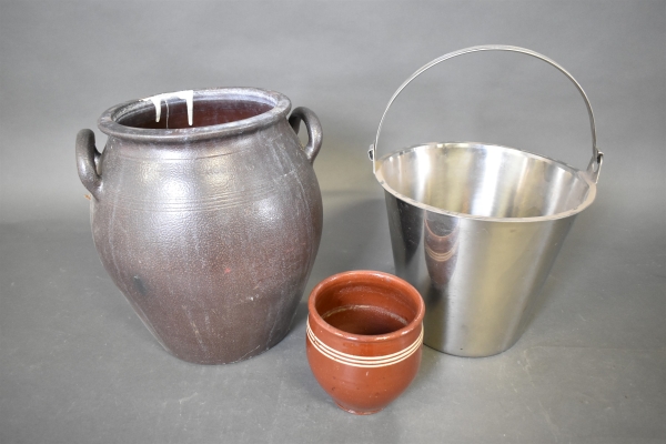 10724. Rostfrispann 12 liter, krus bl.a Höganäs 20 liter, behöver rengöras, högsta 47 cm med hänkel