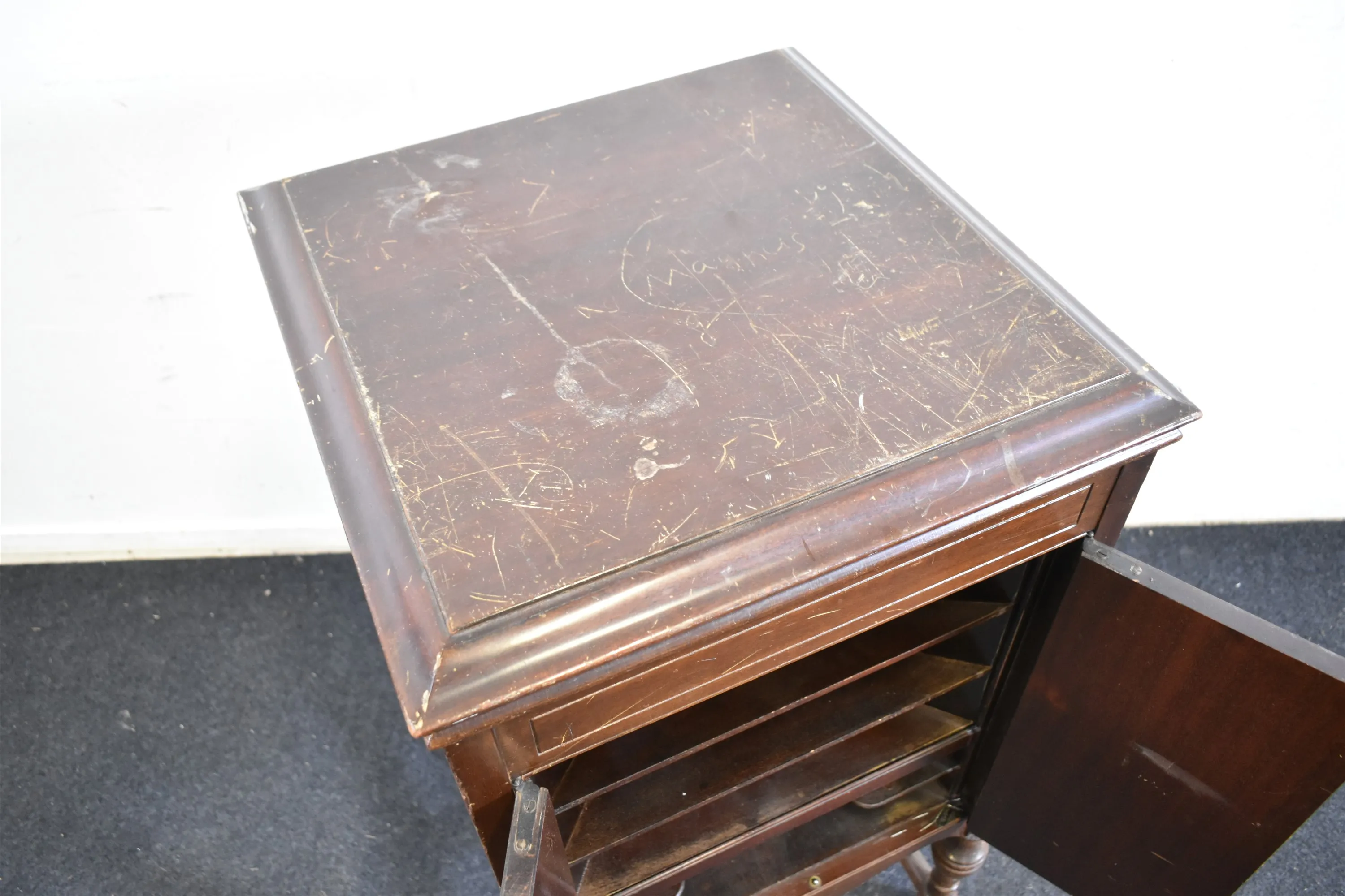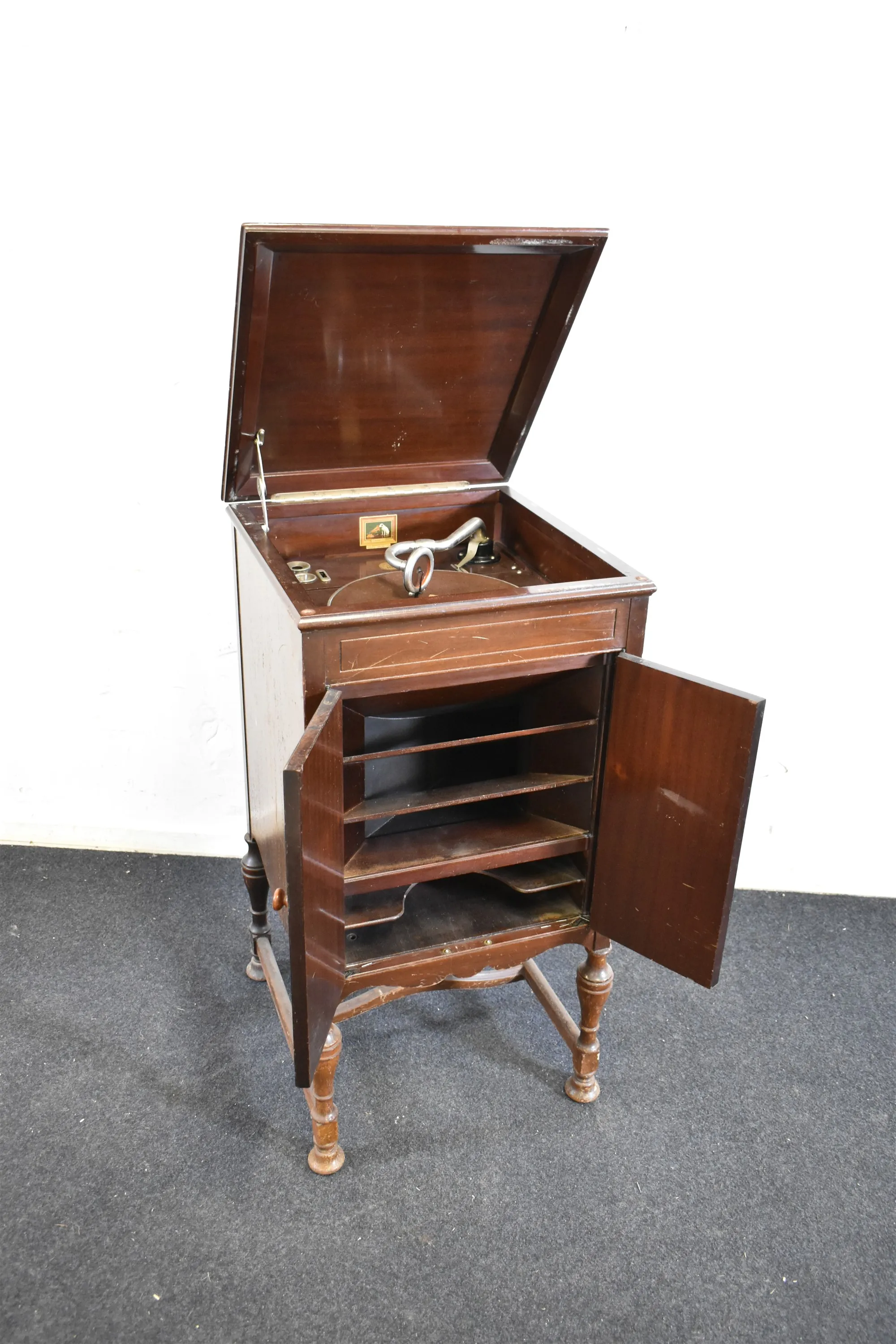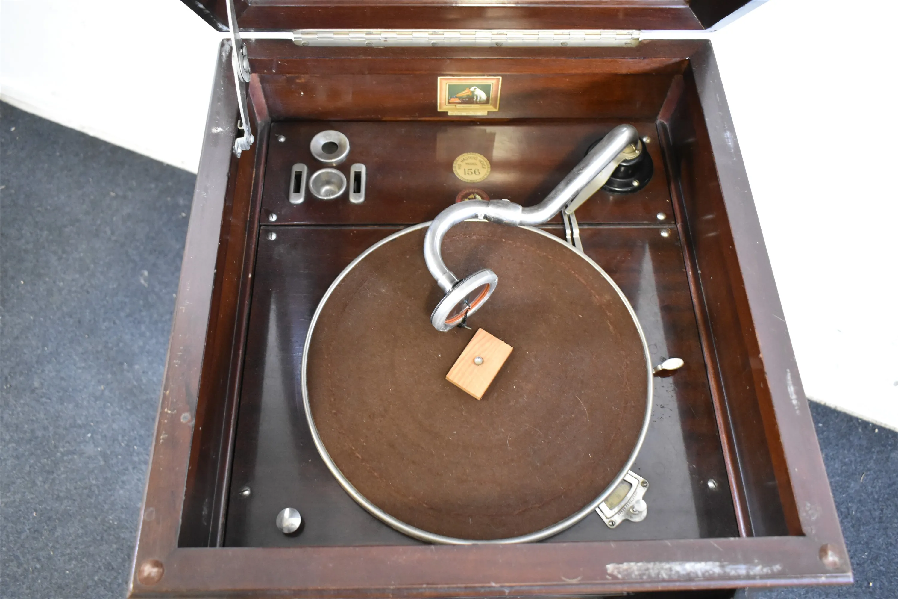 13437. Salongsgrammofon, His Masters Voice, modell 156, skav & repor finns, ingen vev, höjd 95 cm, mått 50 x 48 cm