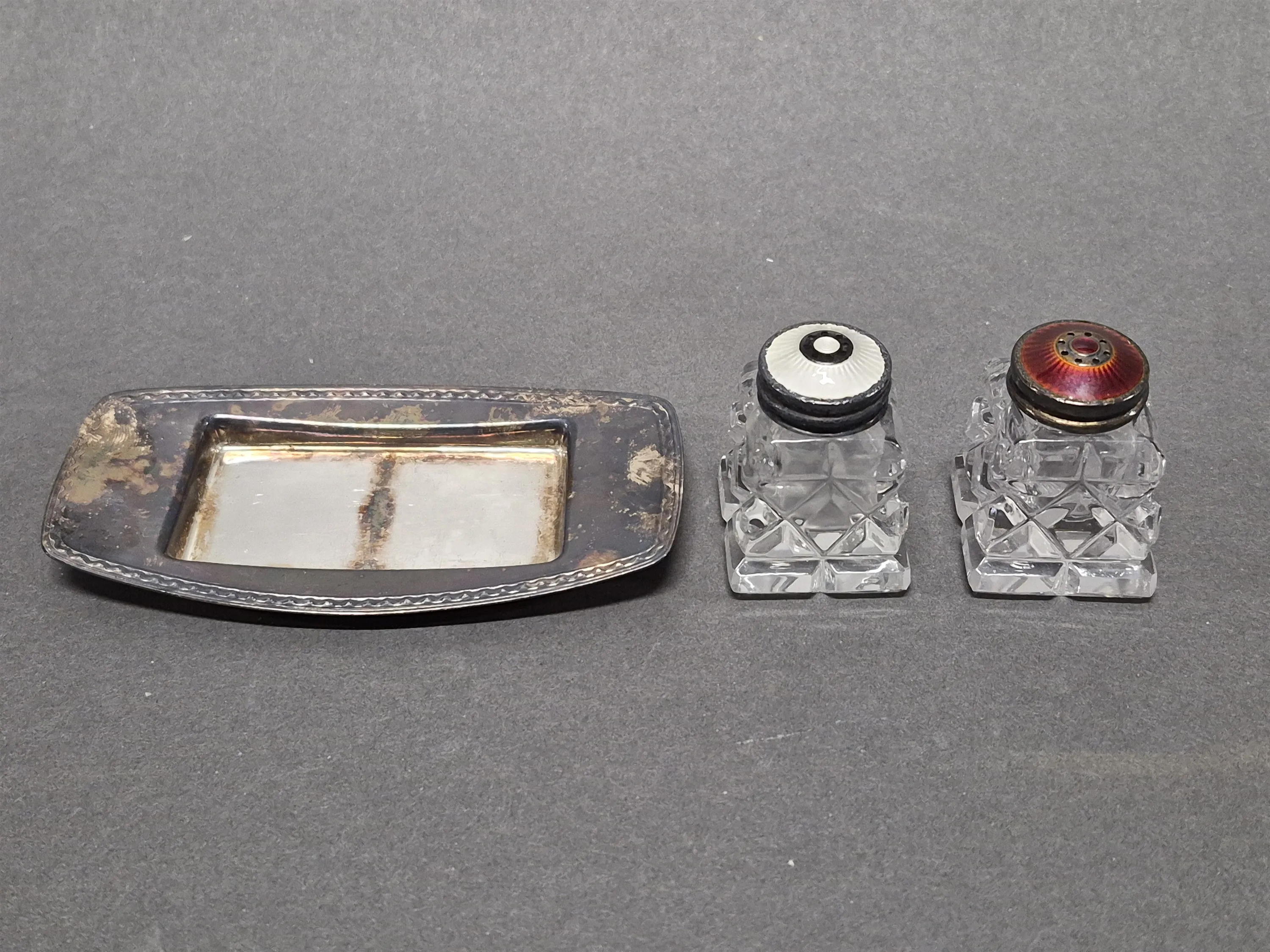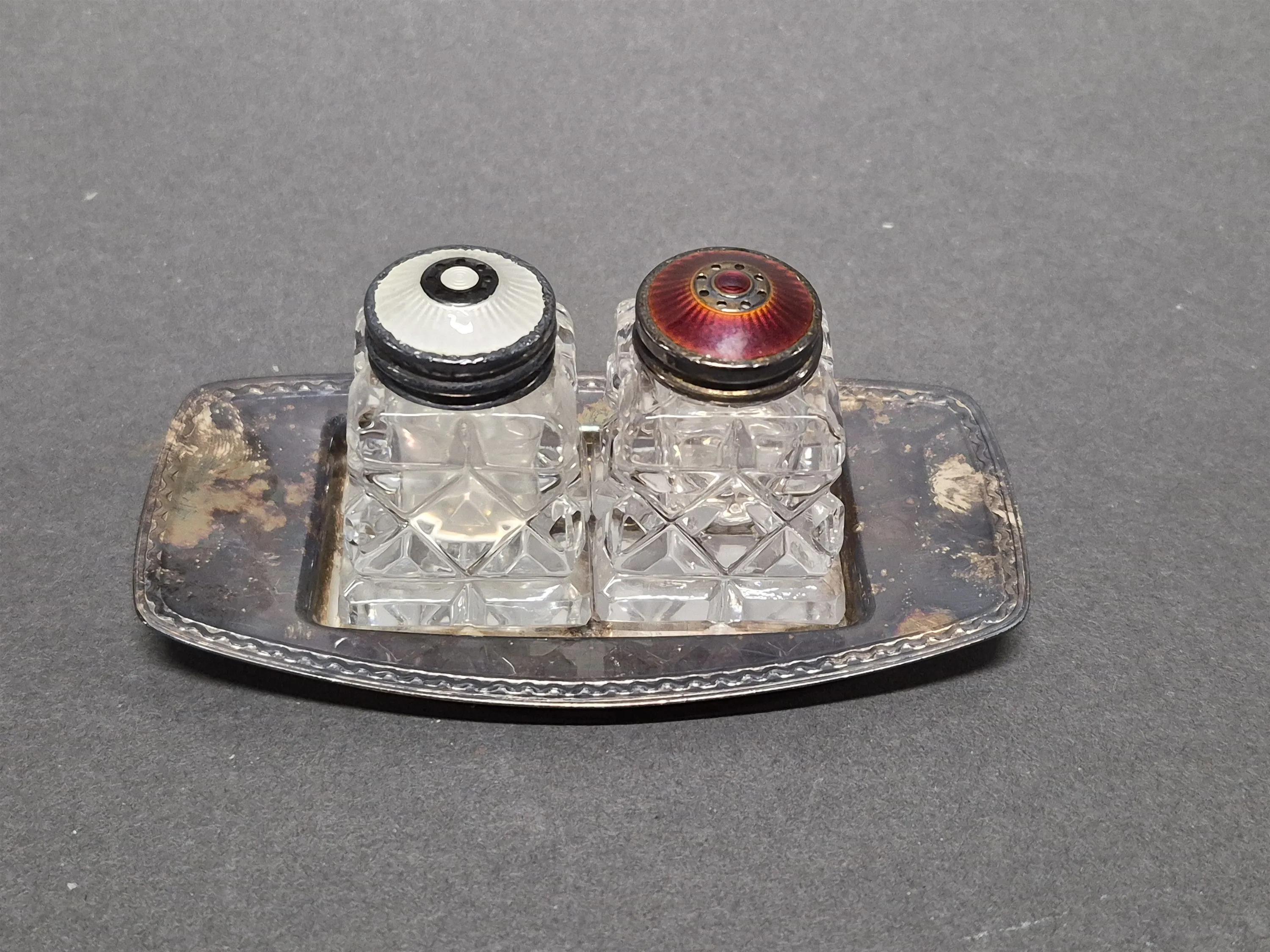 17382. Salt & pepparströare med silver & emalj, fat nysilver längd 10,5 cm