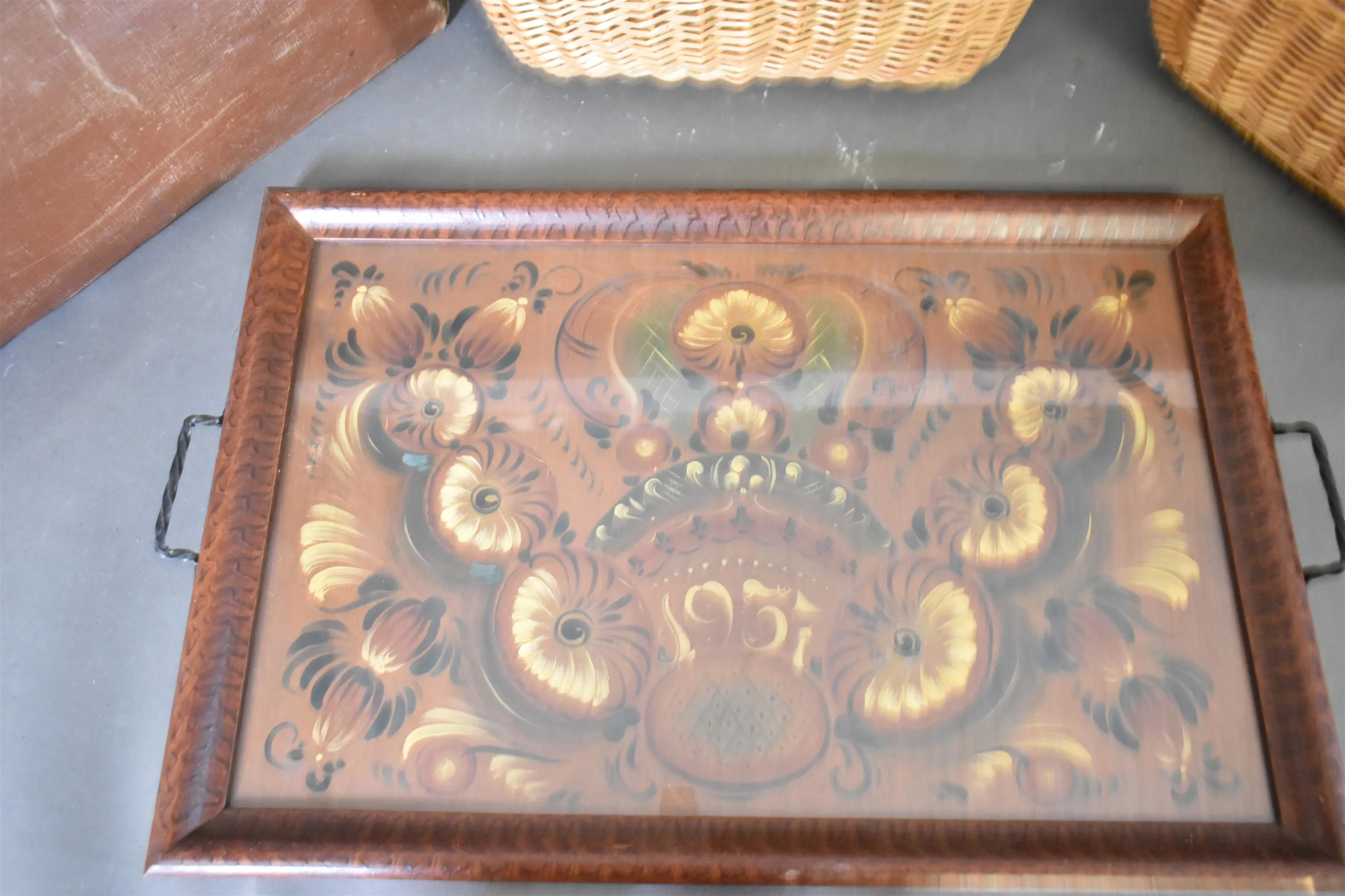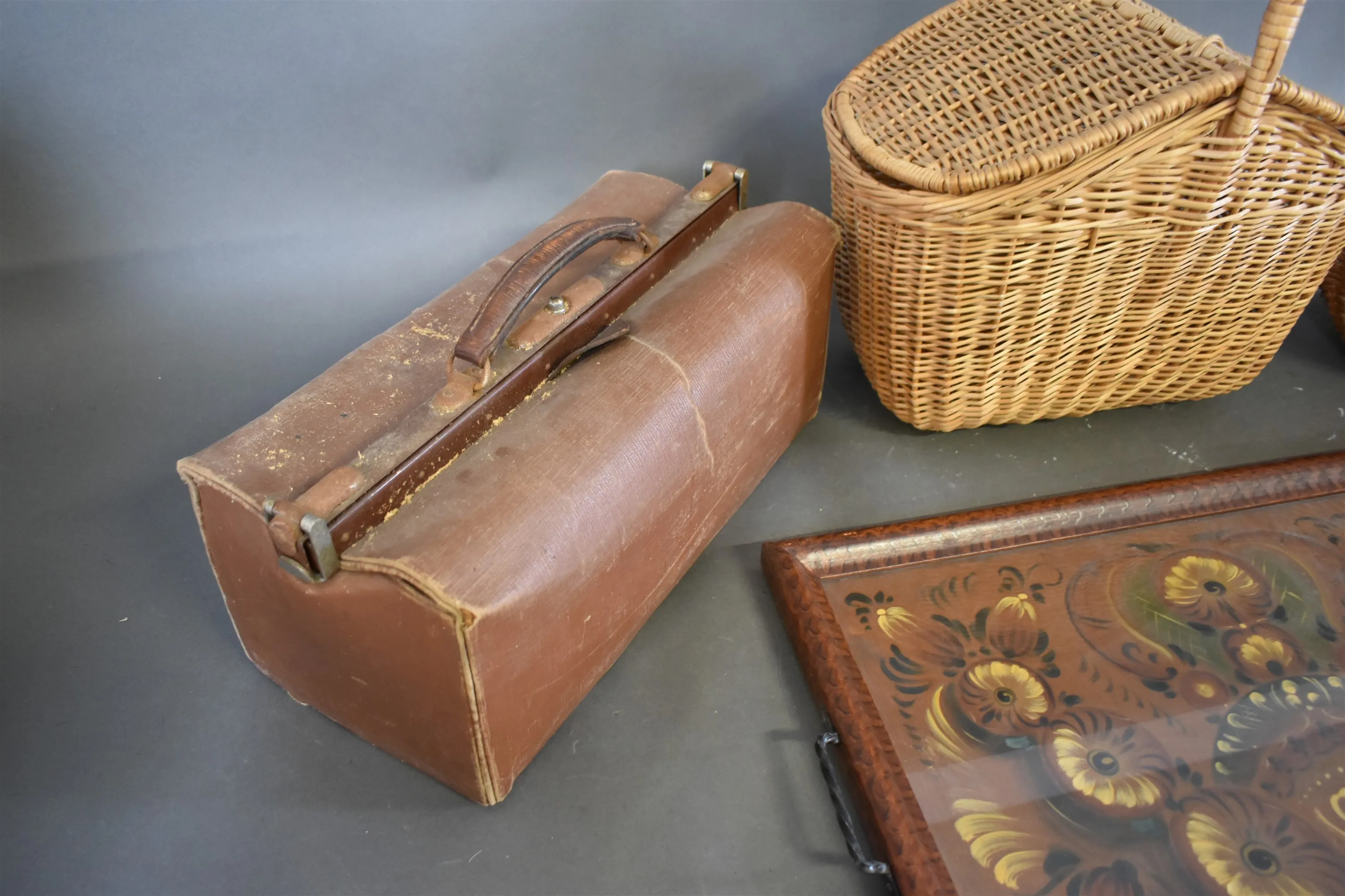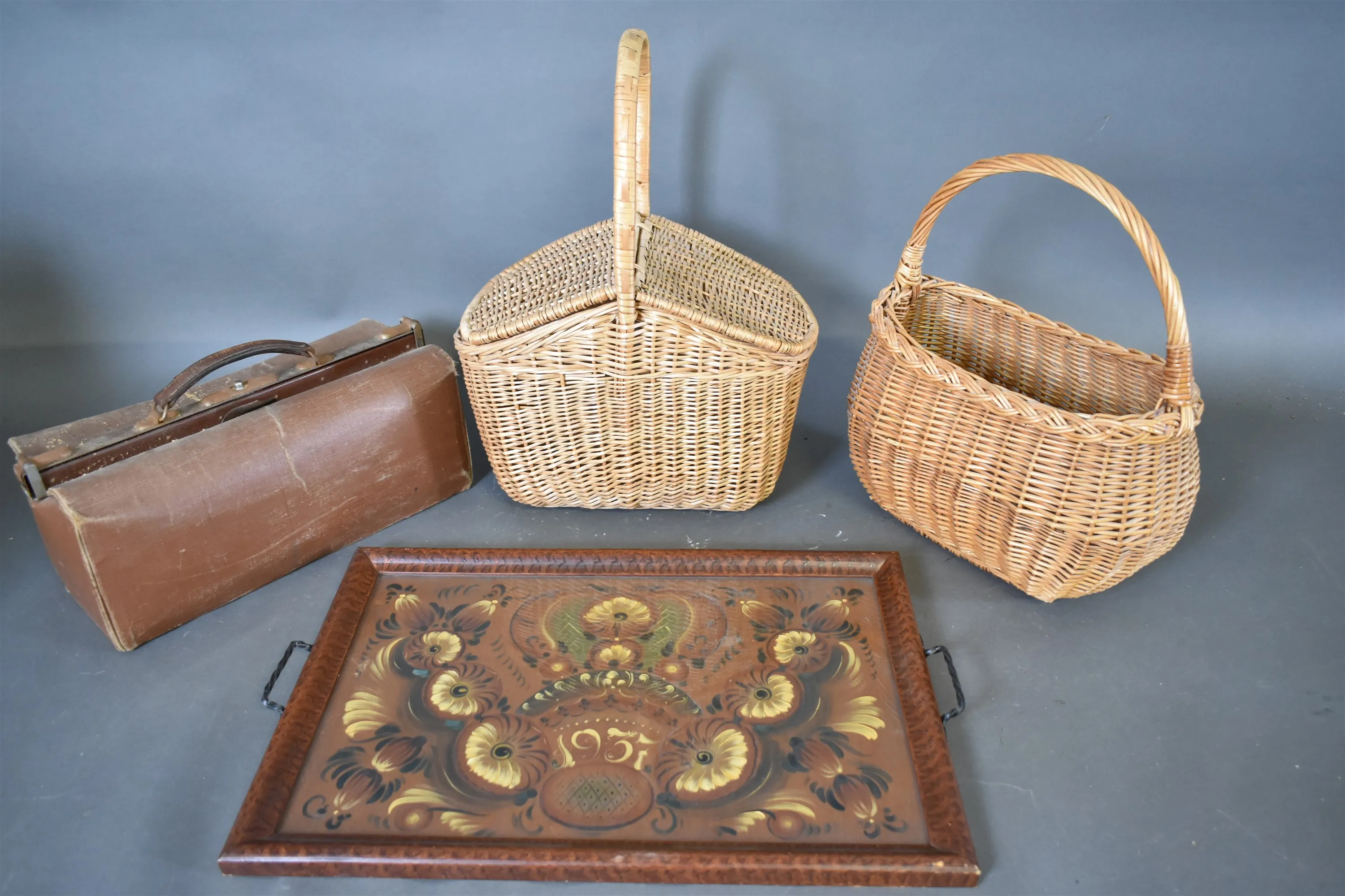 14087. Serveringbricka, docktorsväska & 2 korgar högsta 48 cm