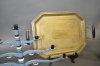 9931. Serveringsbricka mässing, bordslampa och ljusstake i trä, högsta höjd 51 cm
