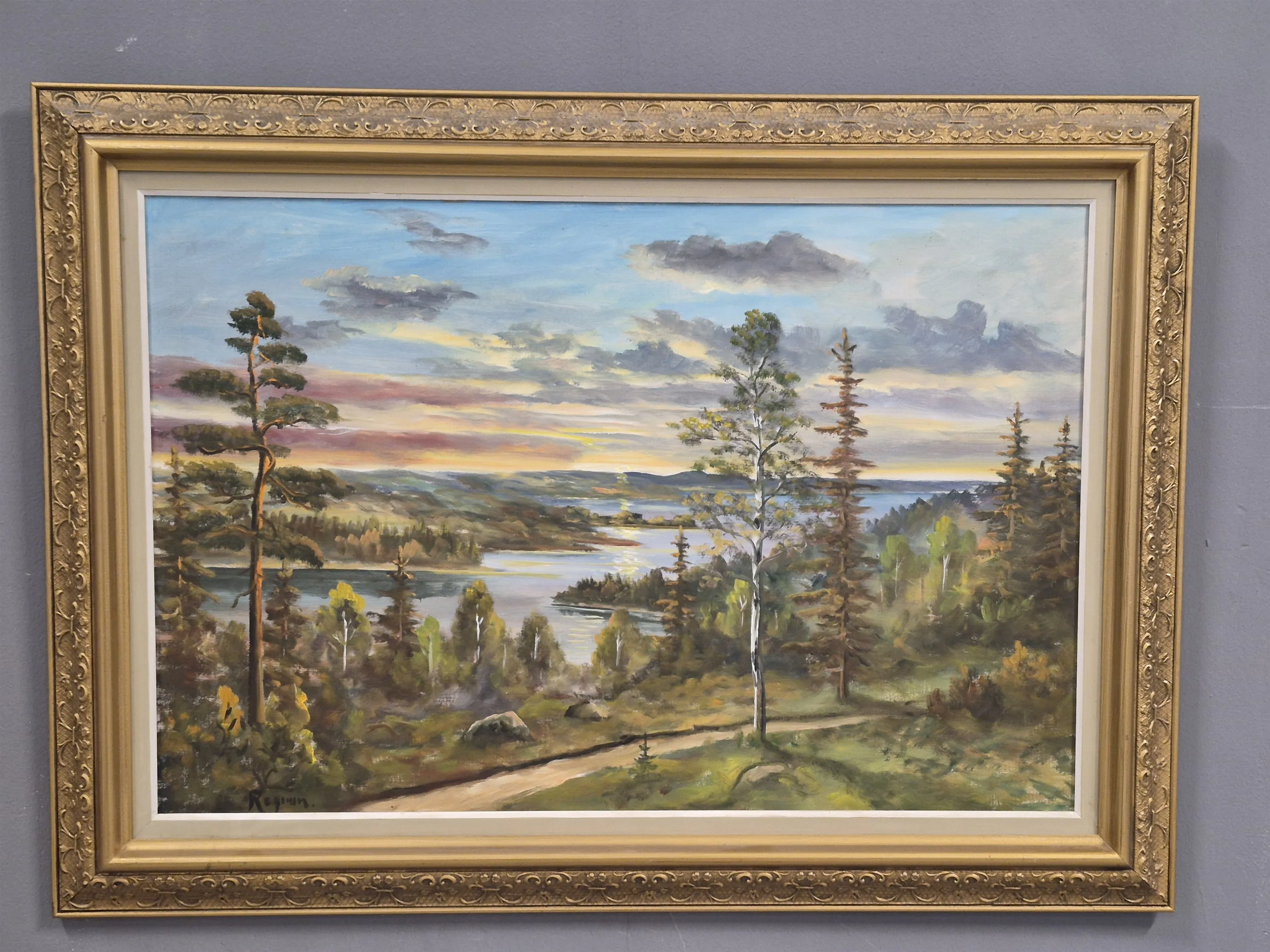 19959. Signerad olja på duk, "Solnedgång", mått 110 x 80 cm
