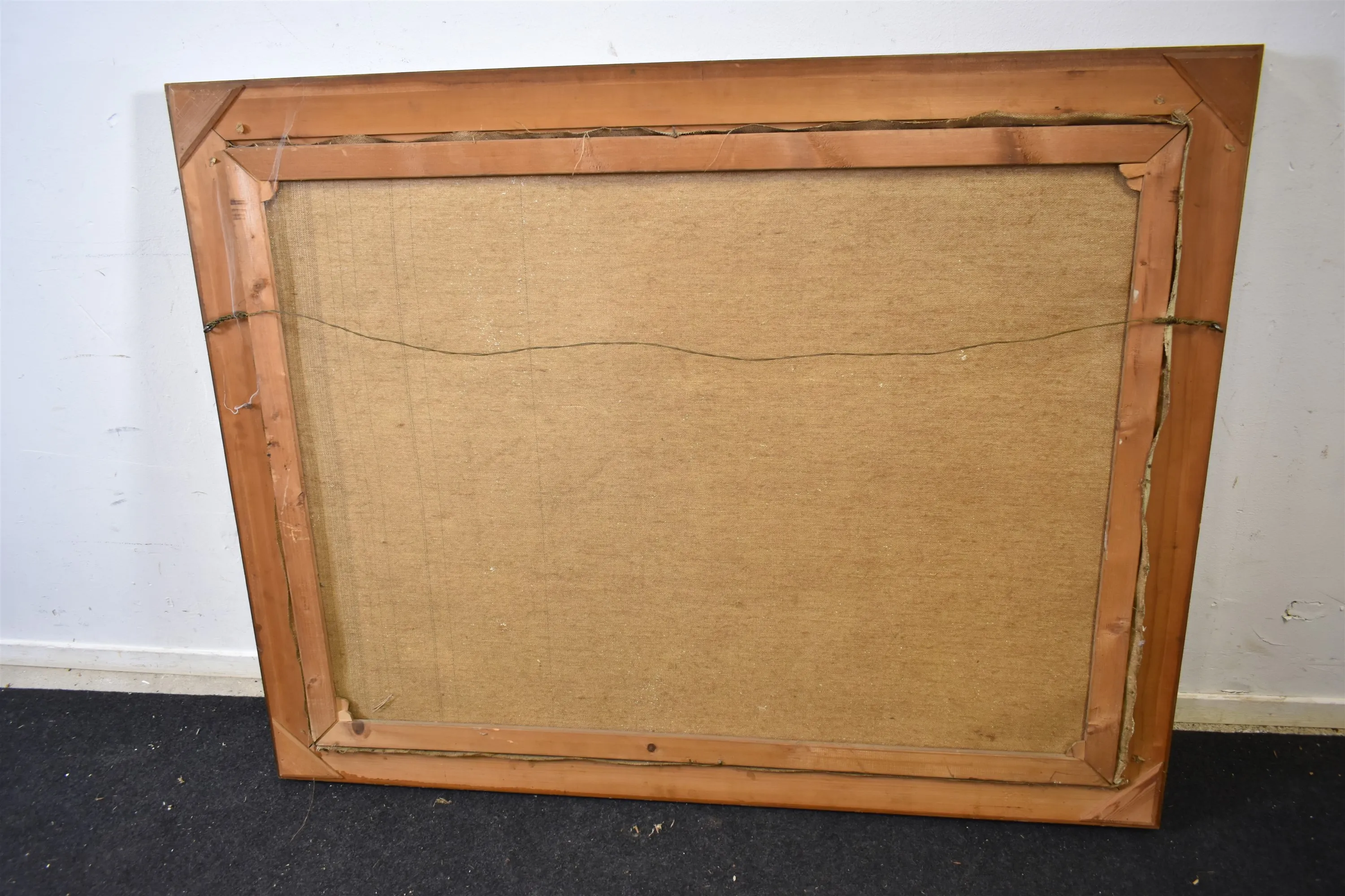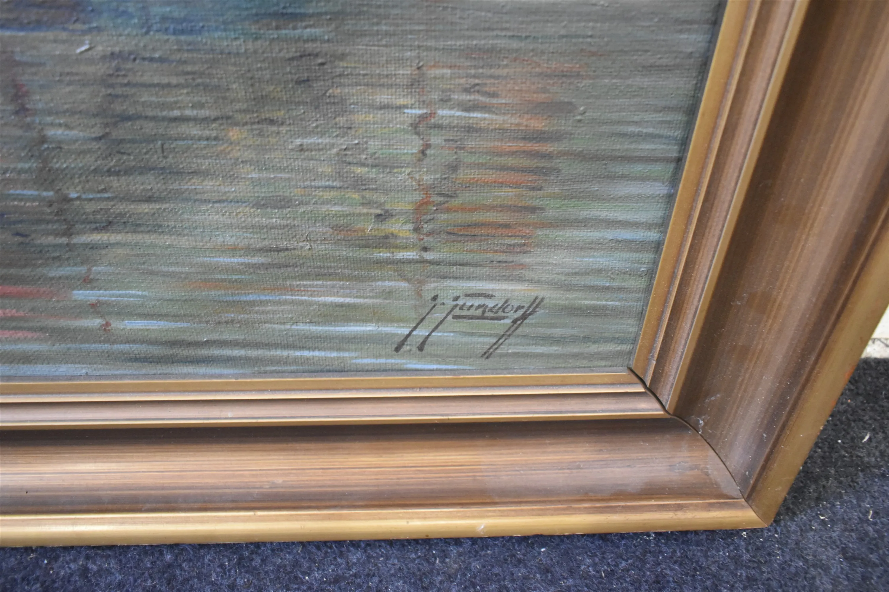 14223. Signerad olja på duk, "Stadsvy med fiskebåtar, mått 136 x 108 cm
