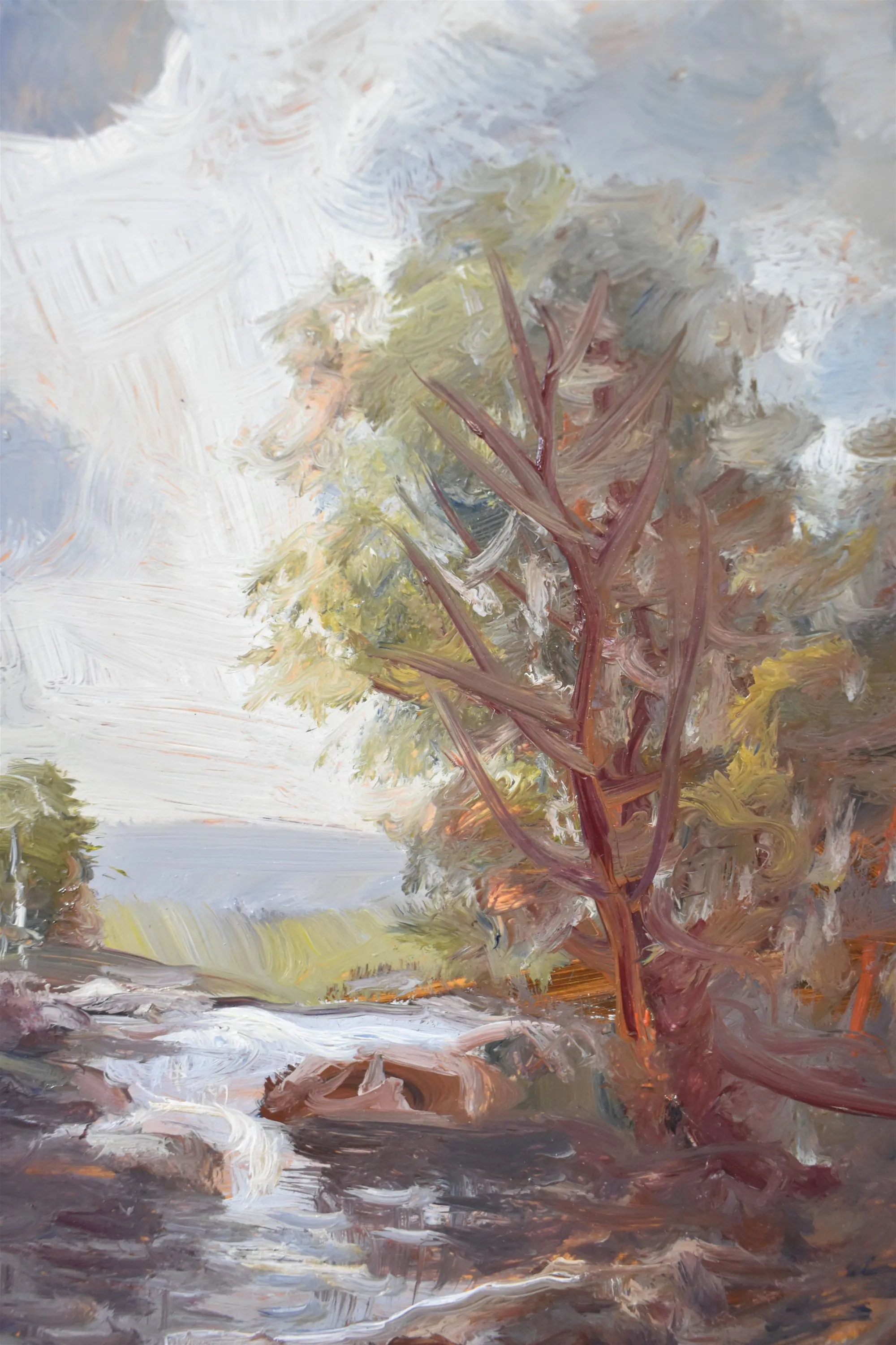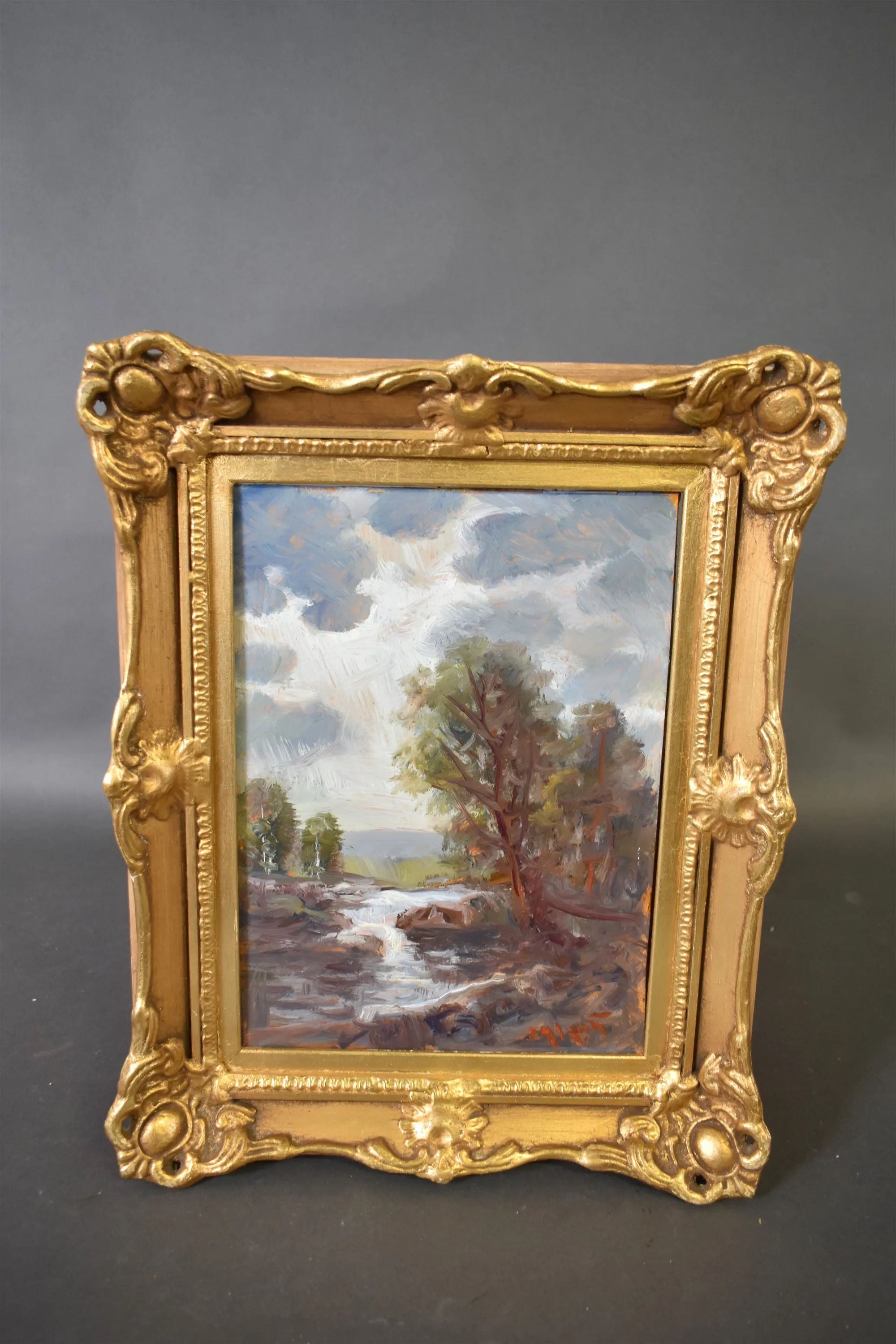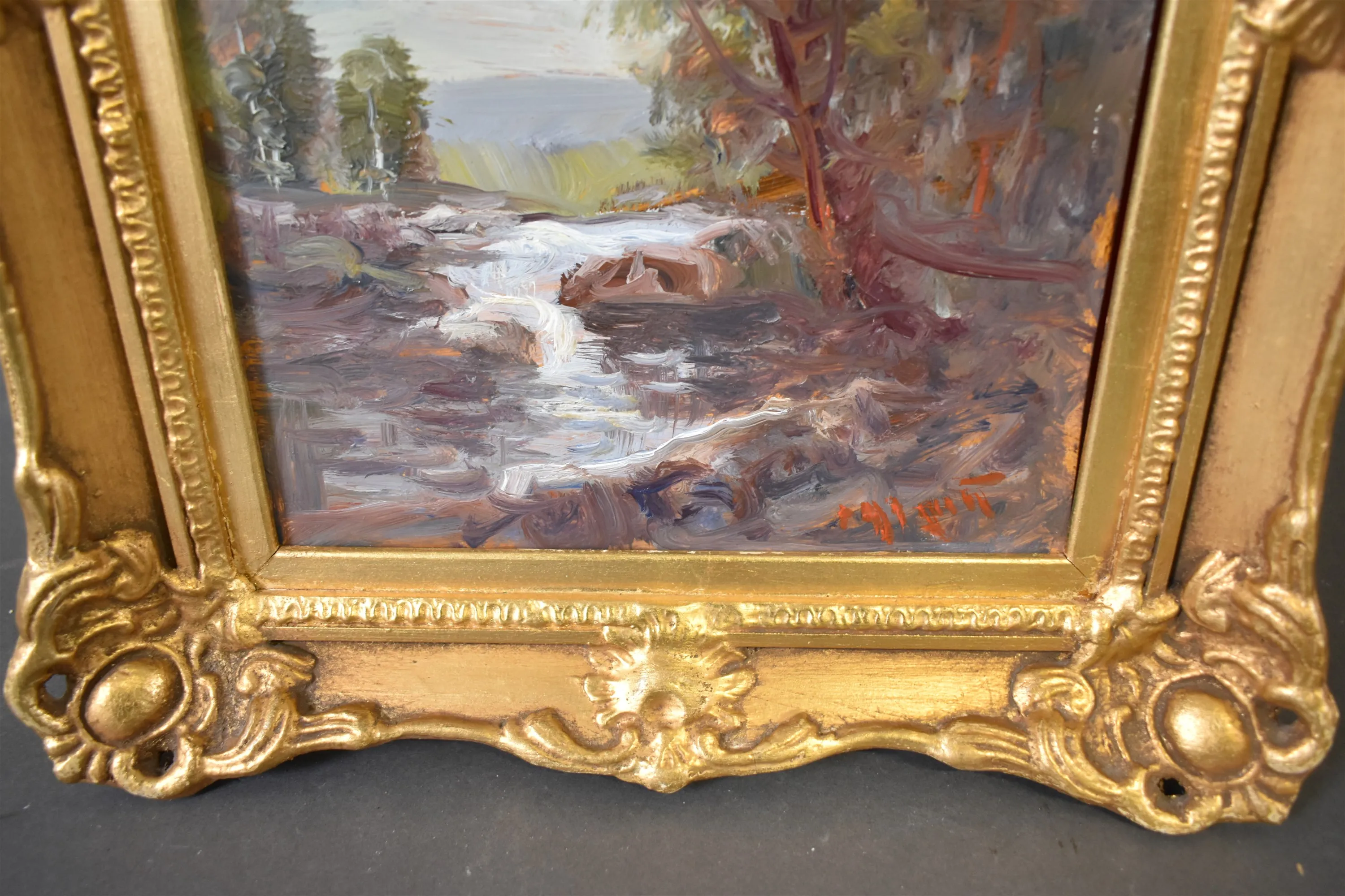 8148. Signerad olja på pannå, "Fors", mått 37 x 46 cm