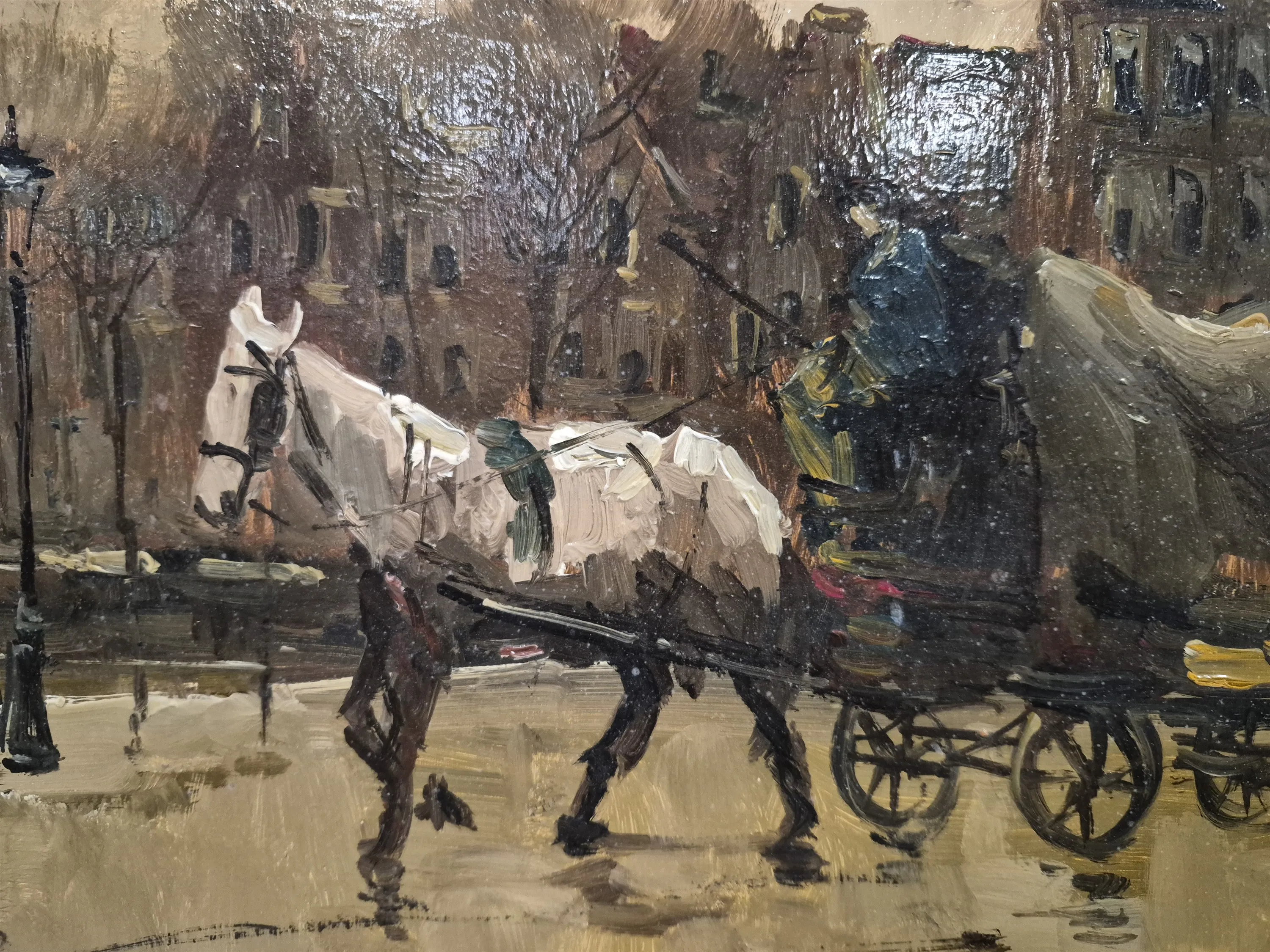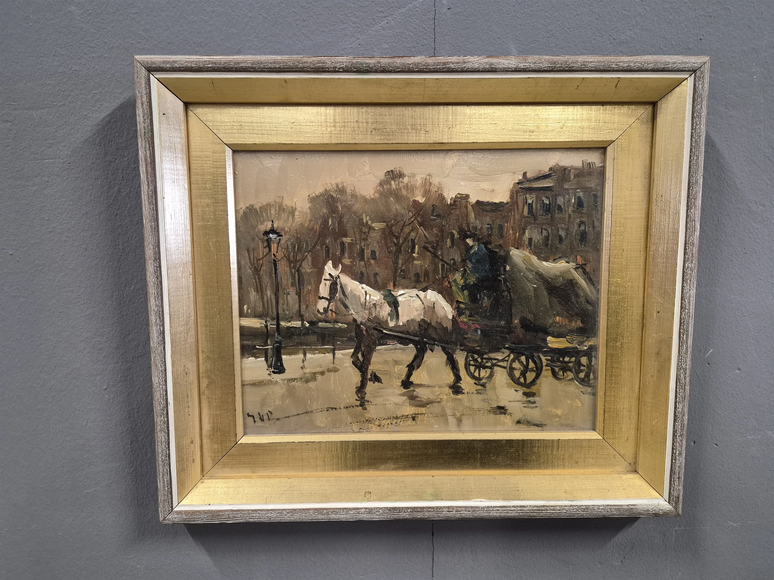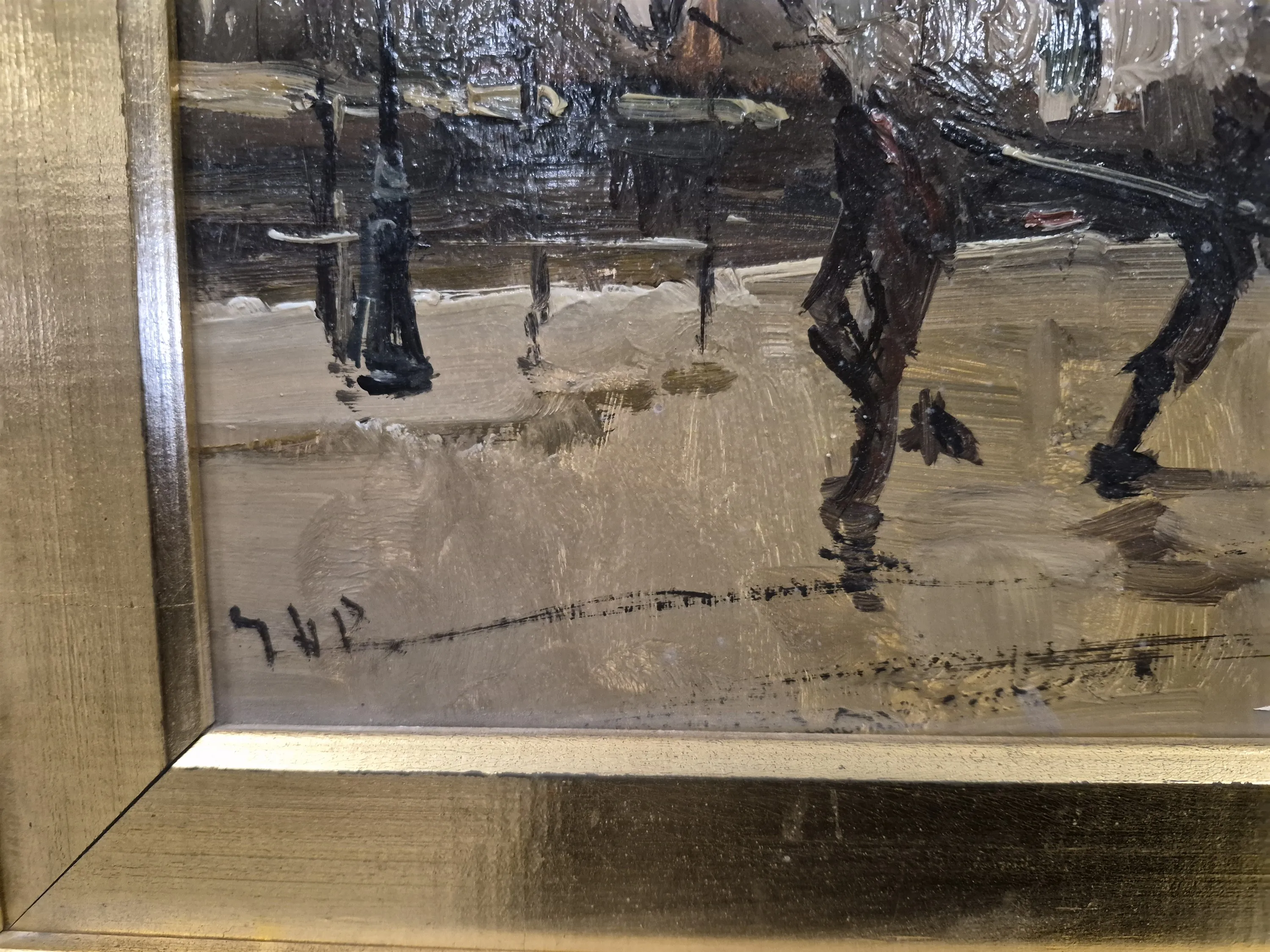 19327. Signerad olja på pannå "Hästskjuts", mått 35 x 41 cm