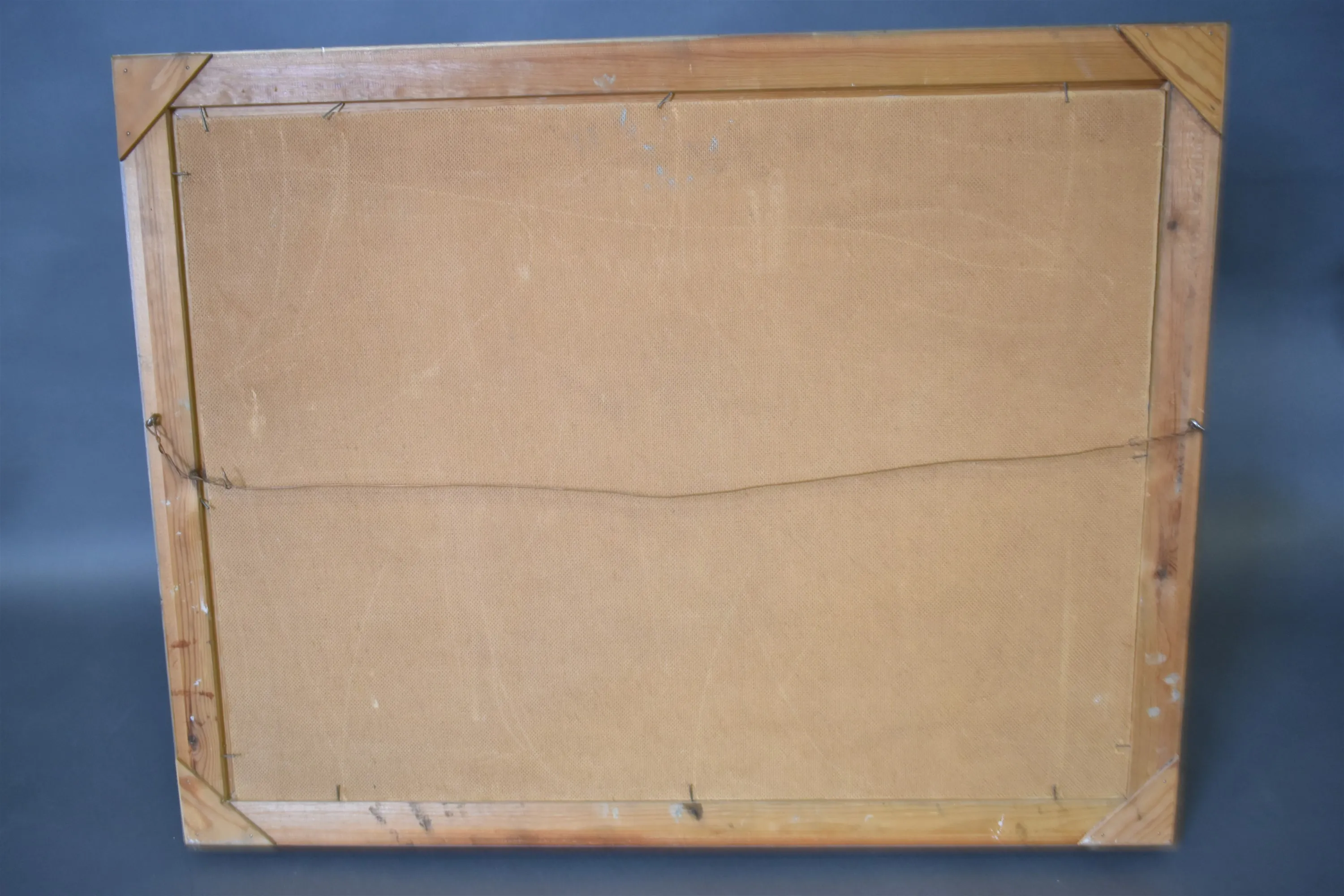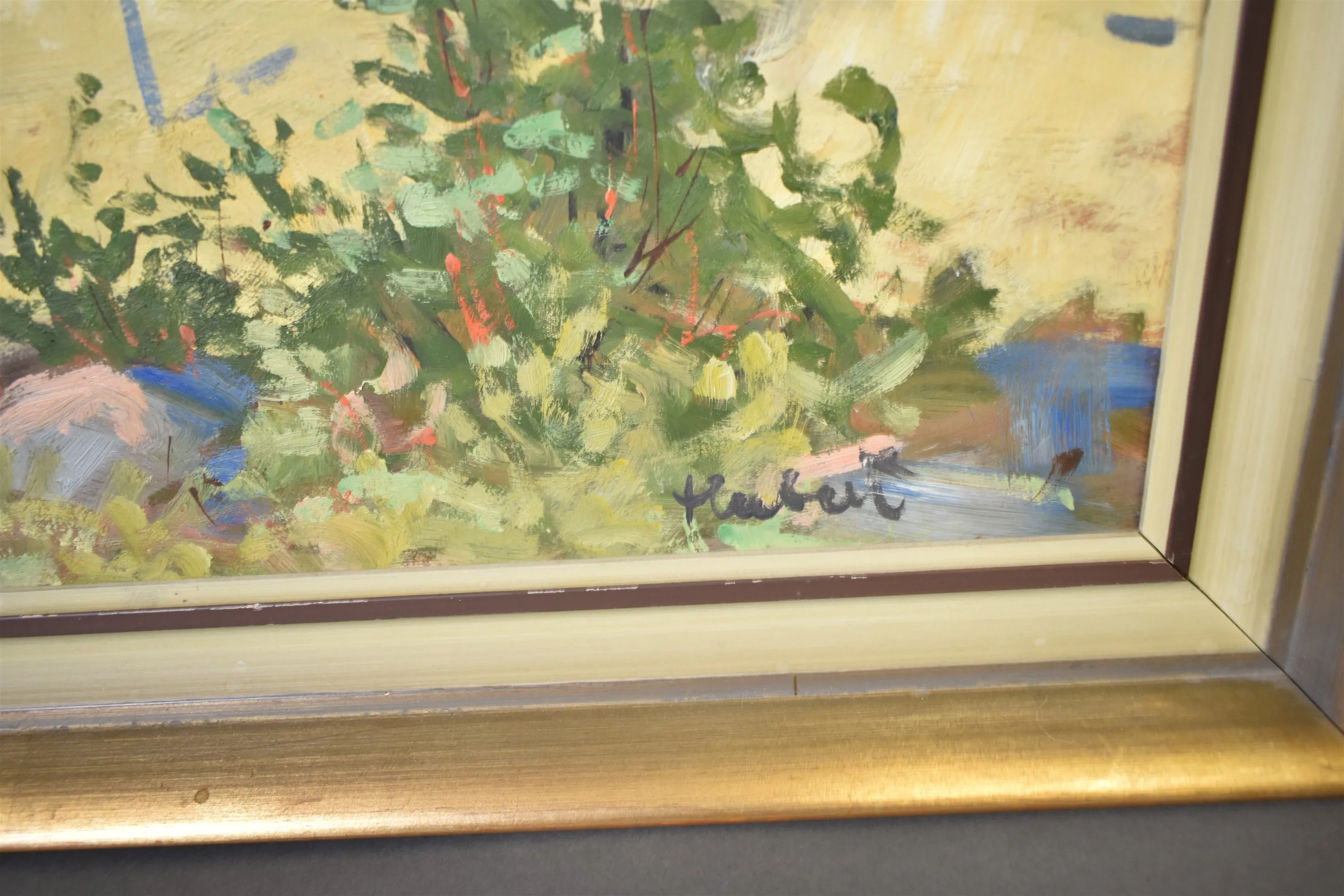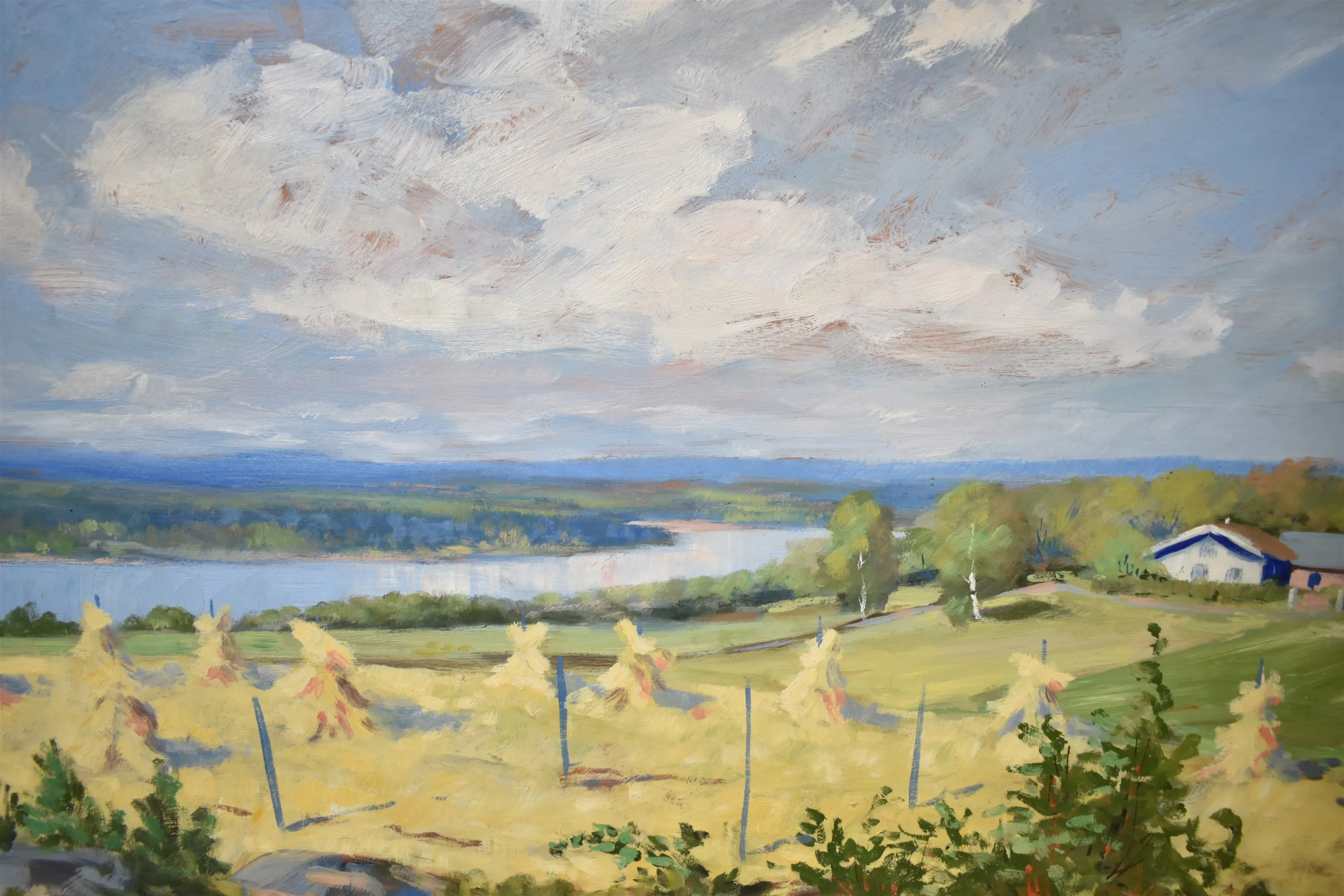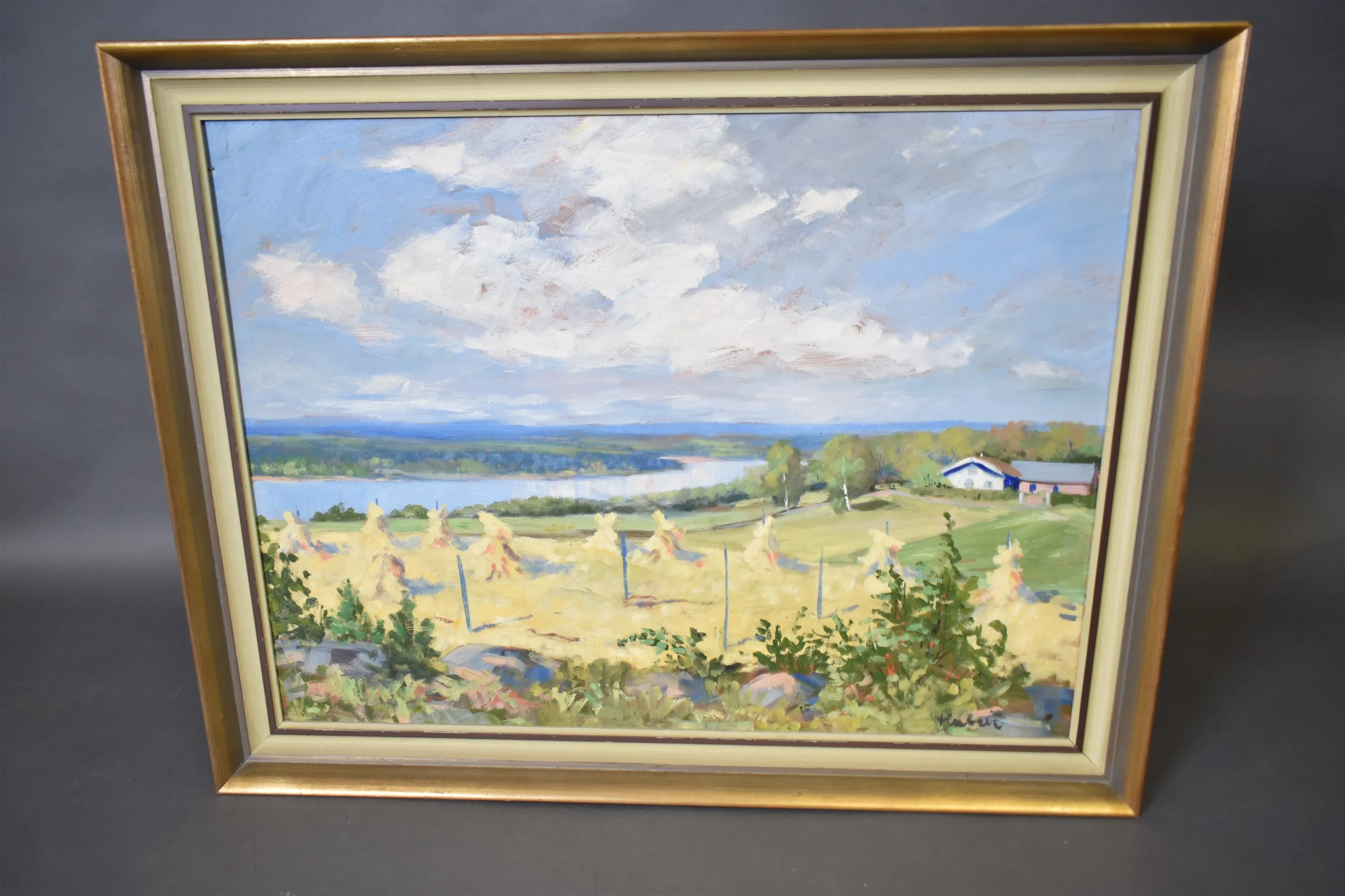 15163. Signerad olja på pannå, "Landskap med Hässjor", mått 91 x 71 cm