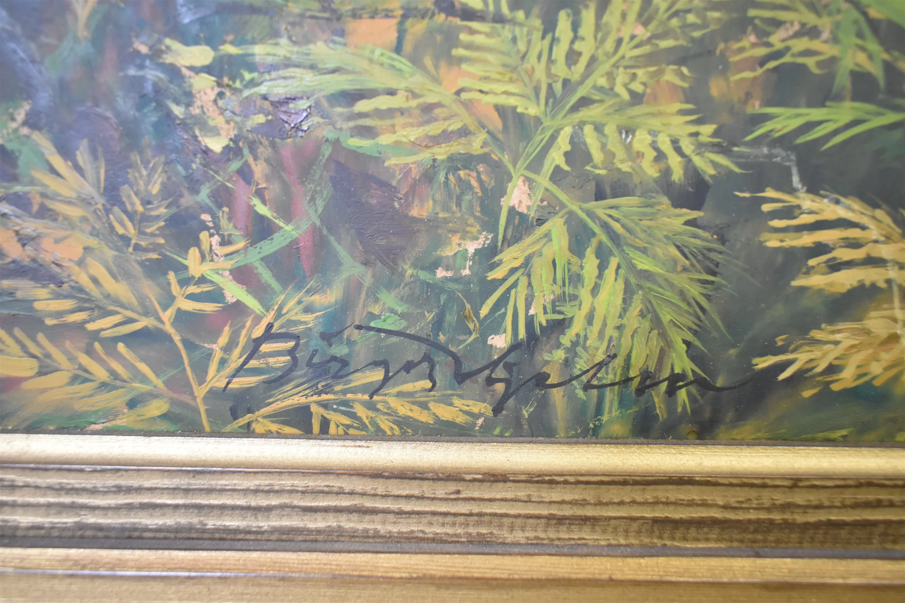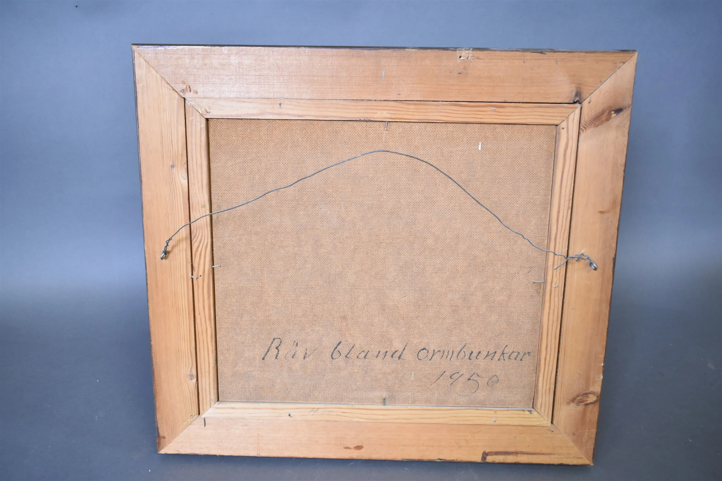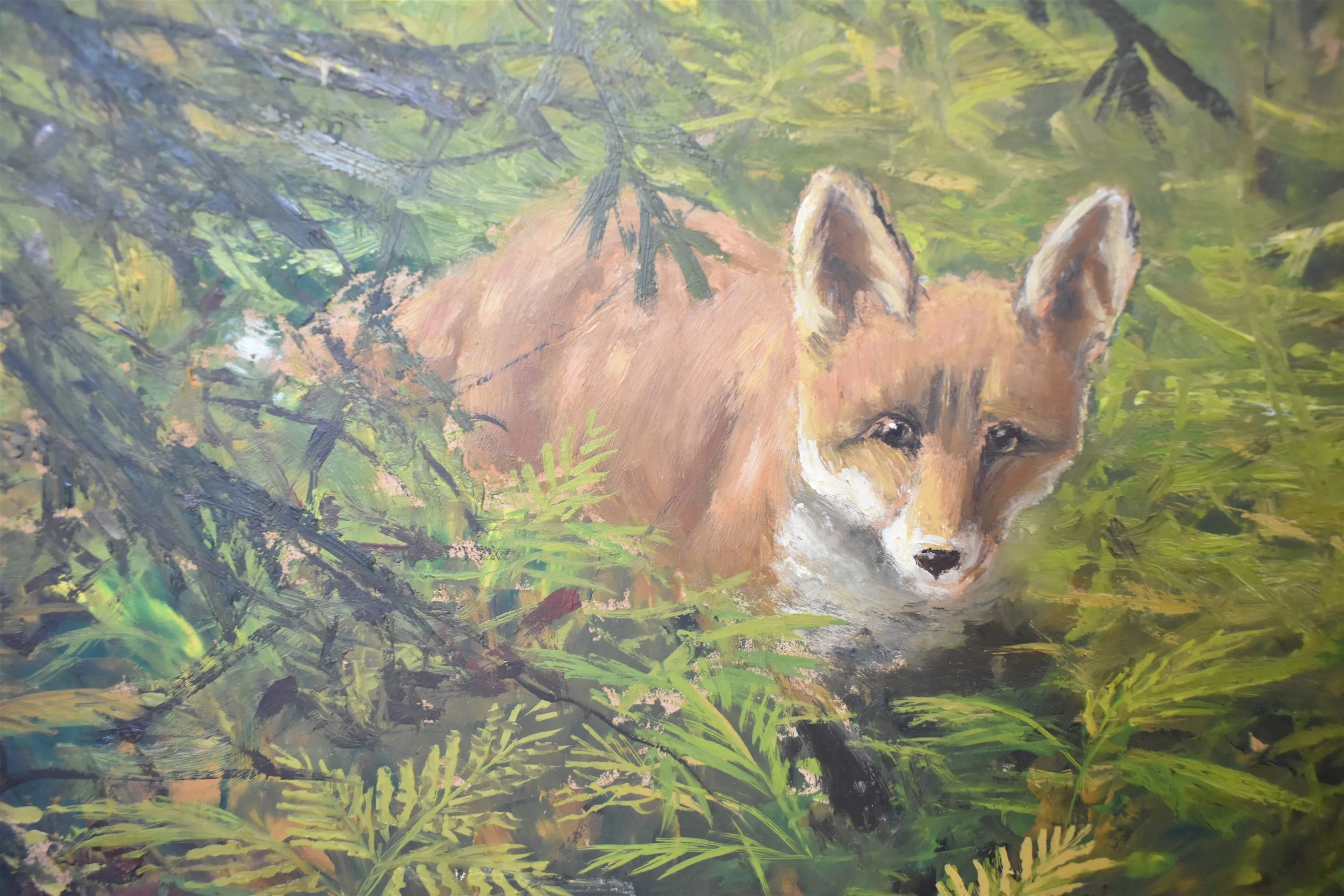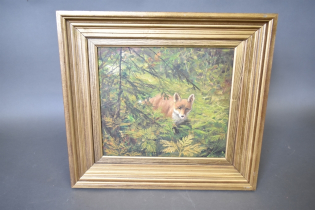 13491. Signerad olja på pannå, "Räv bland ormbunkar" 1950, mått 51 x 56 cm