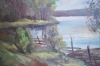 Signerad olja på pannå, tidigt 1900-tal, "Landskap med sjö" mått 62 x 82 cm