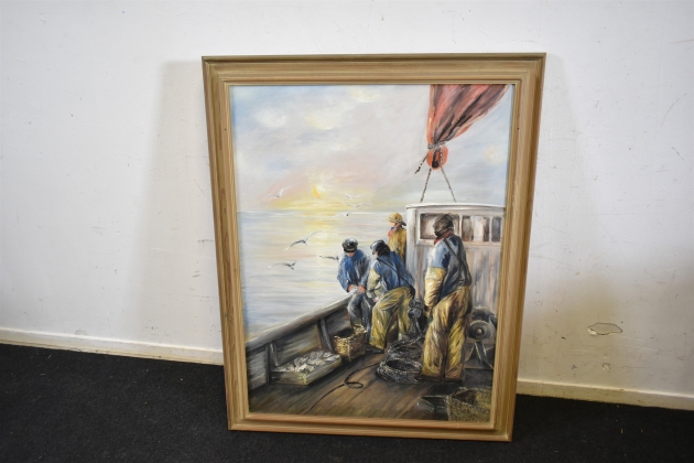 13150. Signerad olja på duk, "Fiskare", mått 90 x 115 cm