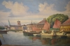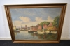 14223. Signerad olja på duk, "Stadsvy med fiskebåtar, mått 136 x 108 cm