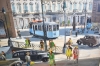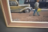 3467. Signerag Helge 1947, olja på pannå, "Stadsvy med spårvagn", mått 70 x 86 cm
