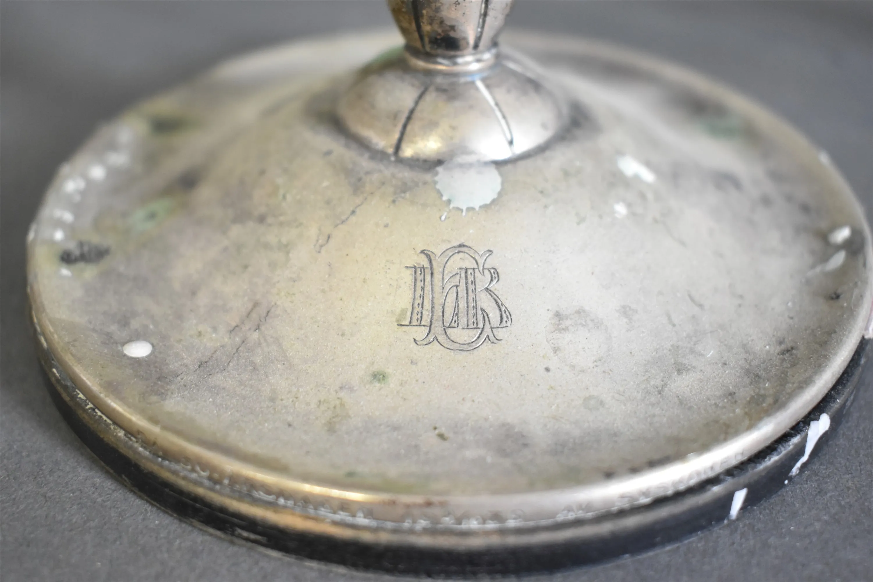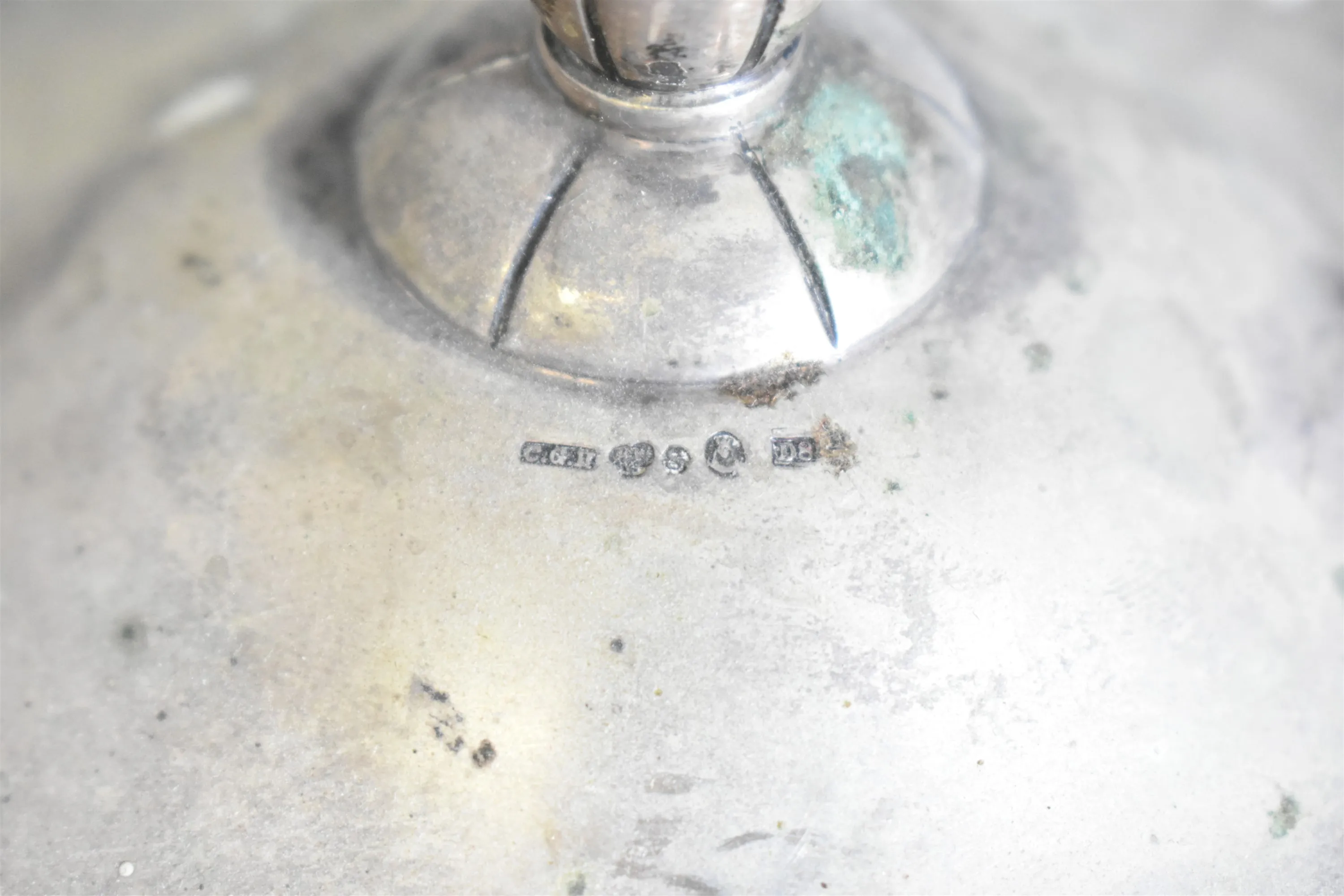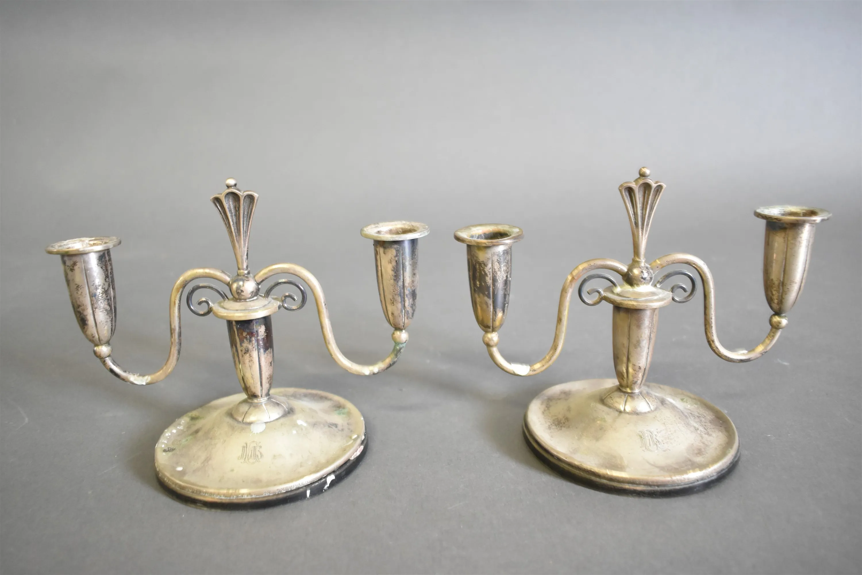14745. Silverljusstakar ett par, gravyr finns, totalvikt med träplattor undertill 639,97 gram, höjd 15,5 cm, bredd 19 cm