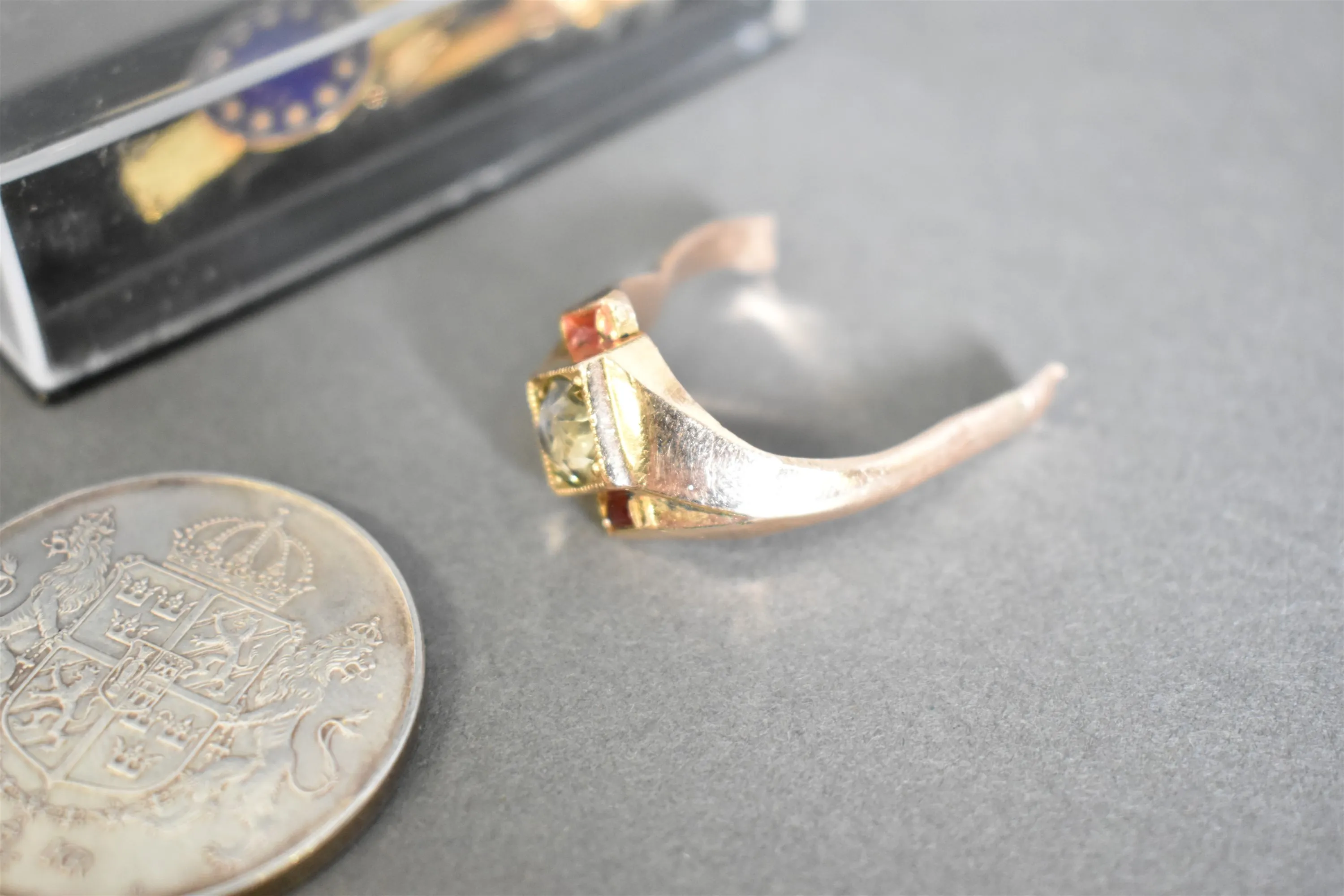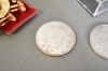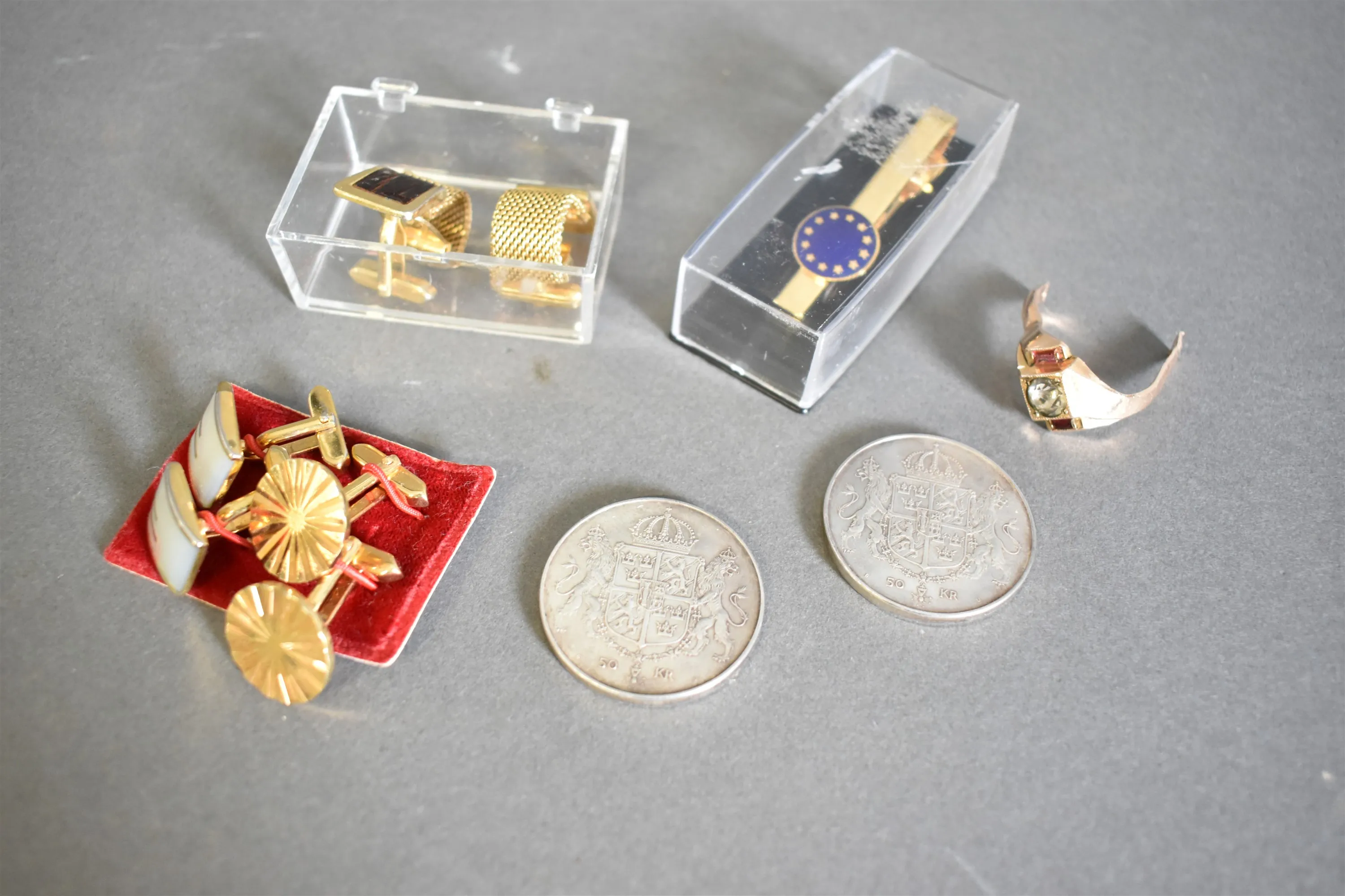 14381. Silvermynt 50 kr 2 st, bijouterier och ring gulddoublé