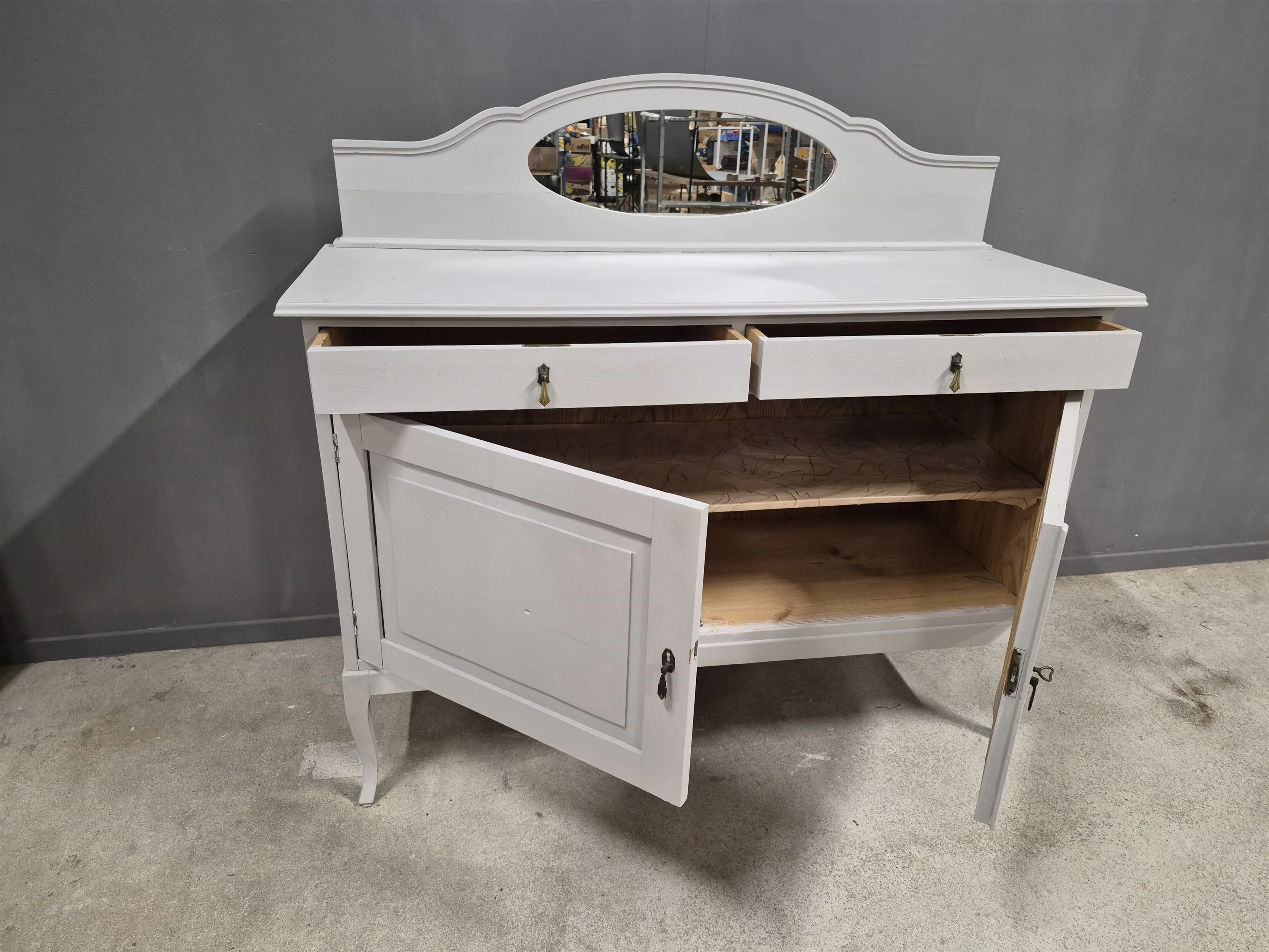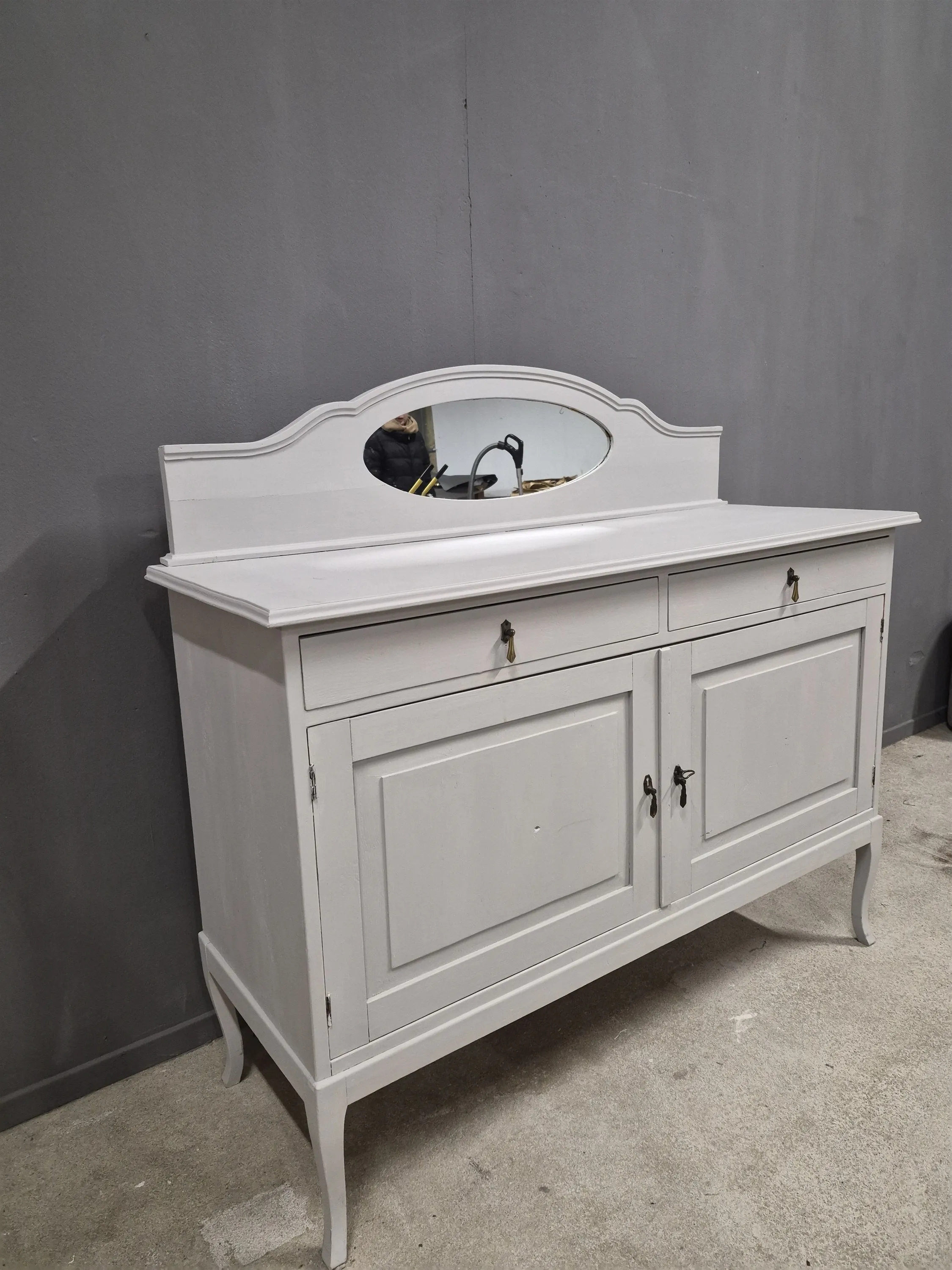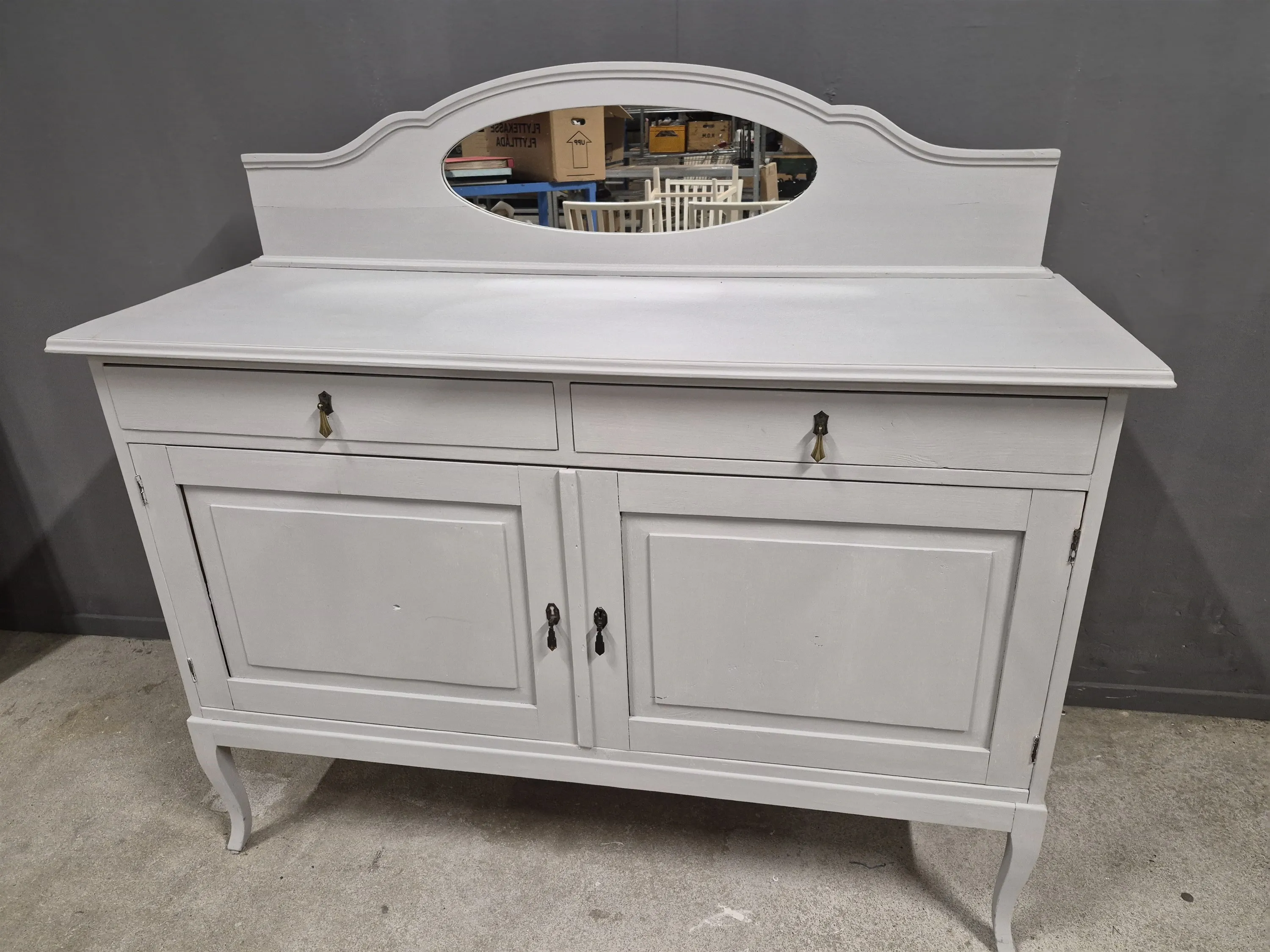 18028. Skänk med spegel överdel, målad furu, höjd 126 cm, bredd 140 cm, djup 50 cm