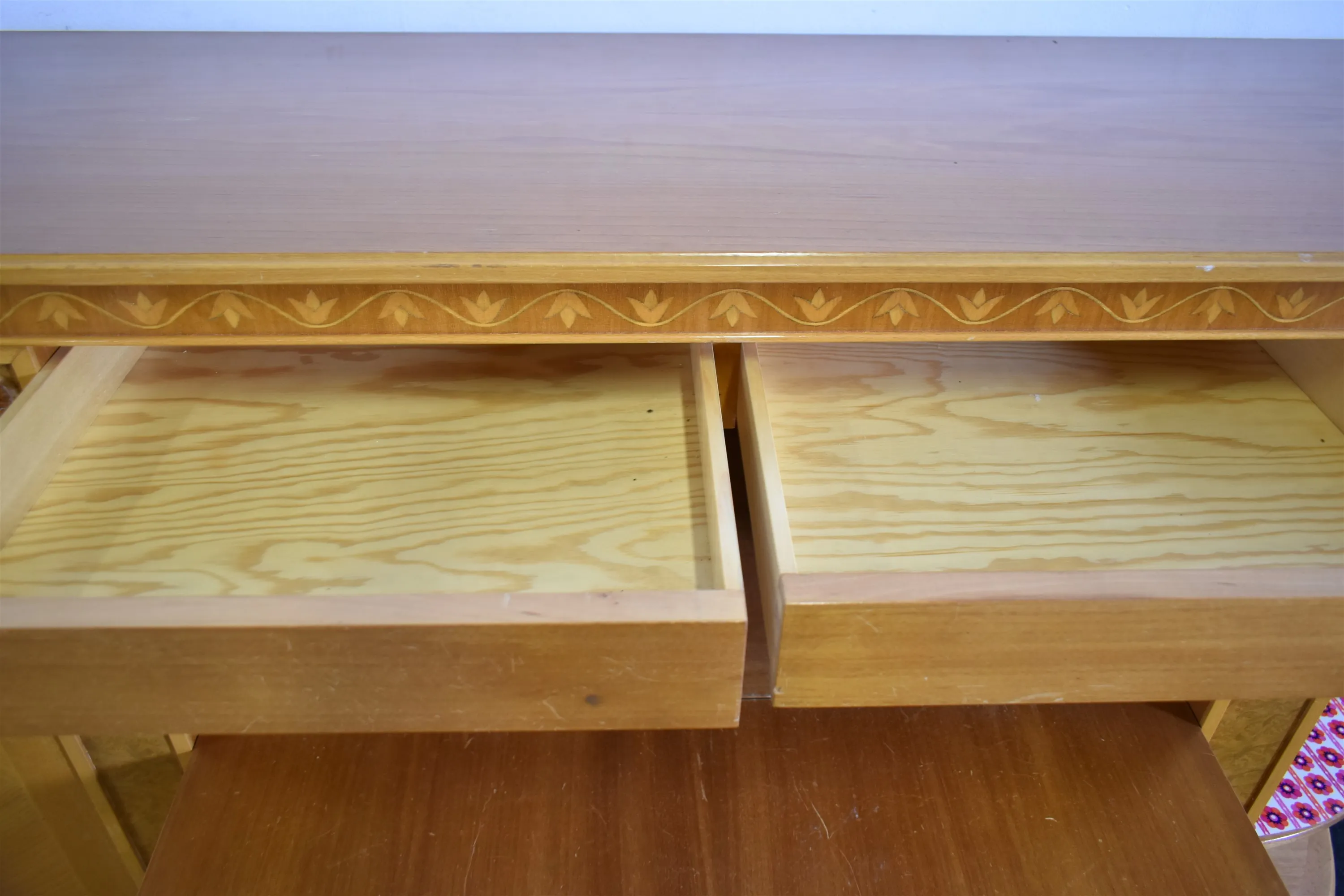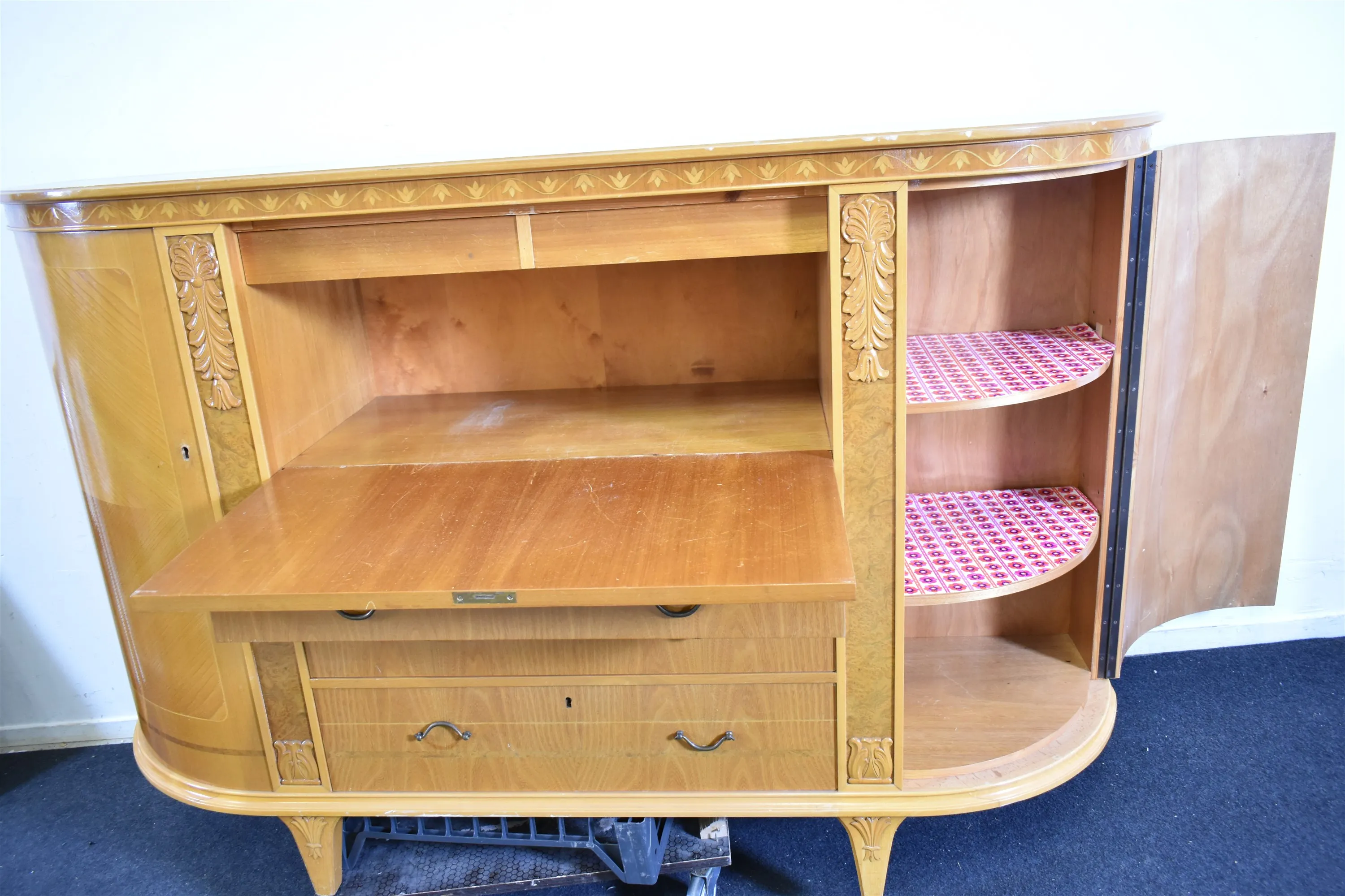 15189. Skänk med utfällbar skrivklaff, intarsia, höjd 117 cm, längd 183 cm, bredd 47 cm