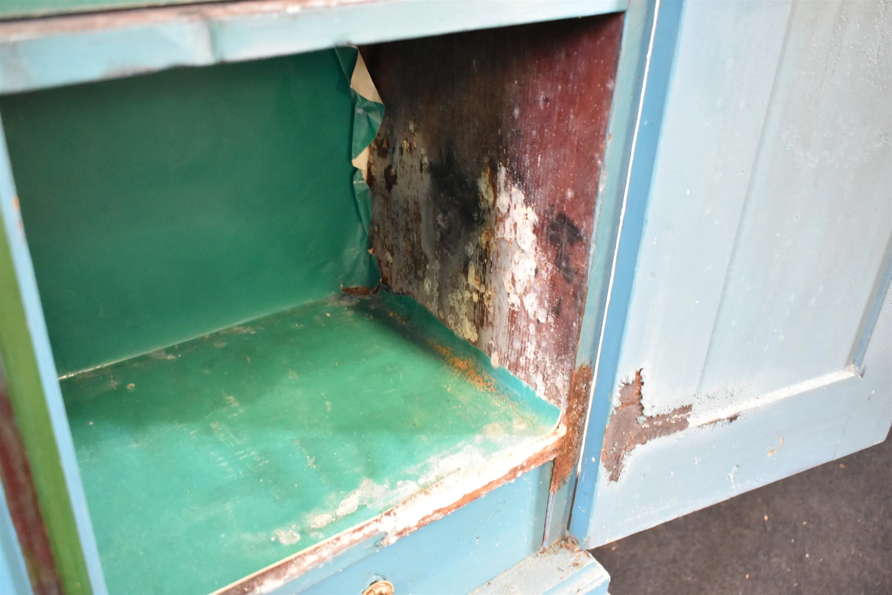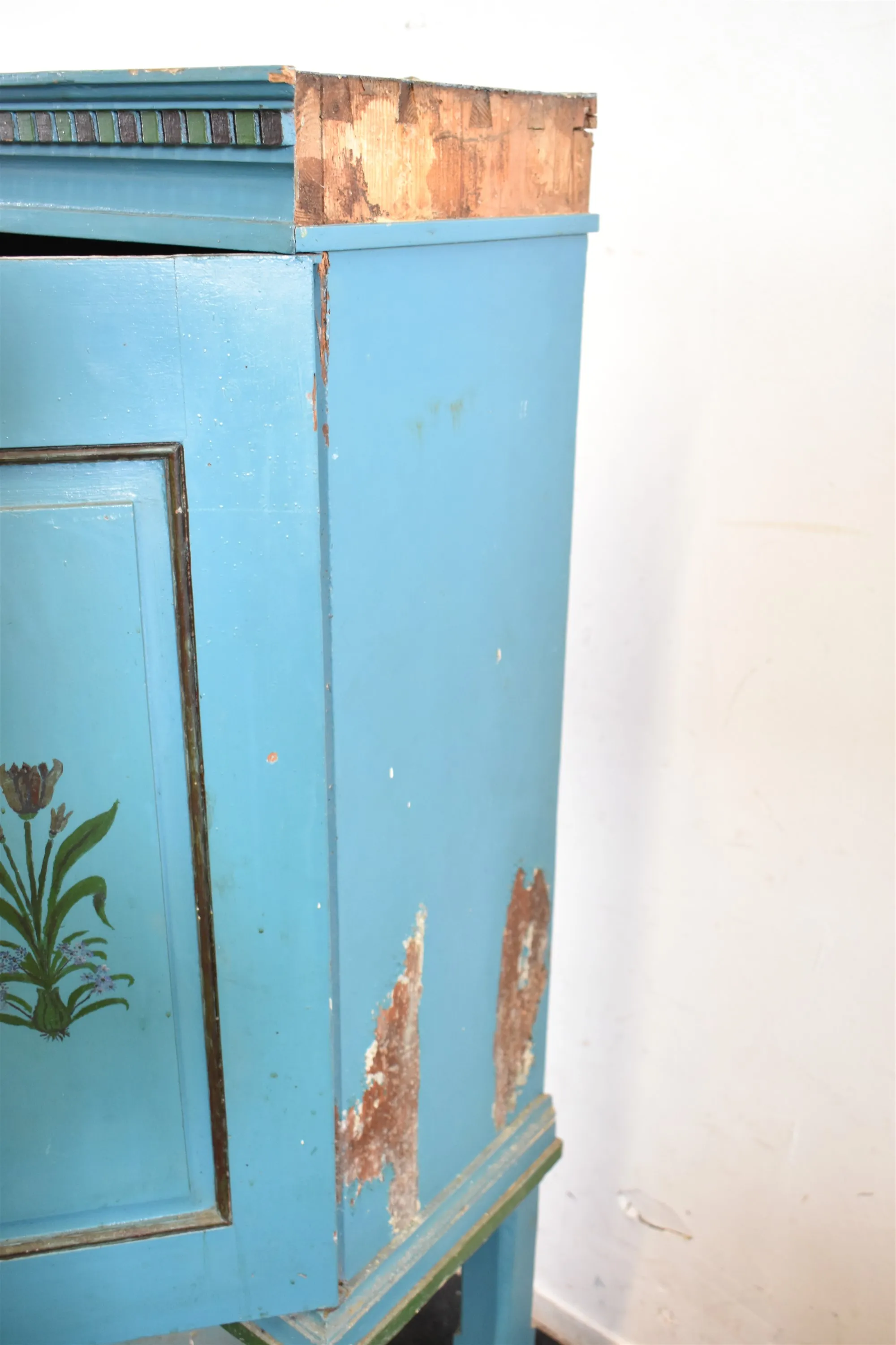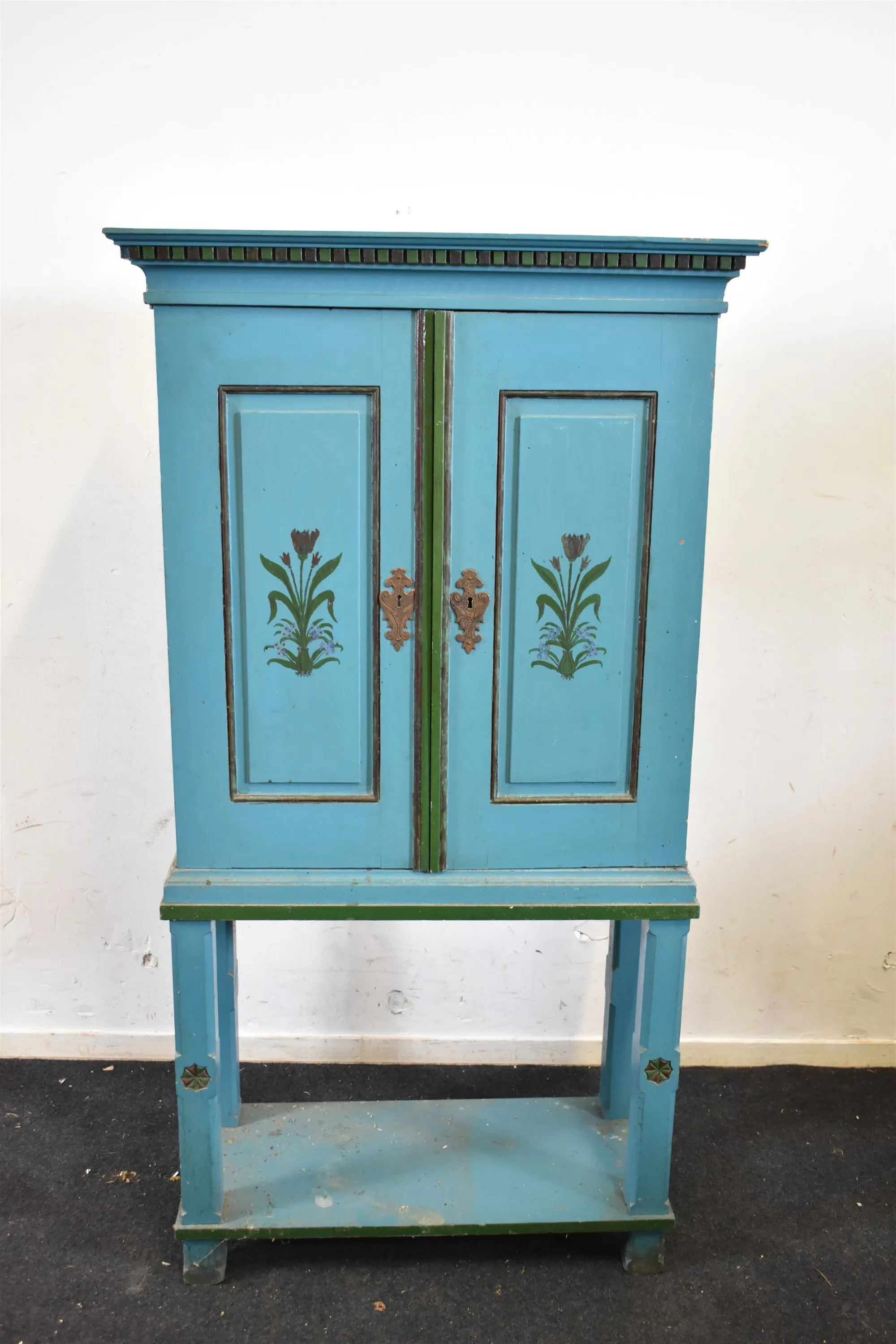 12976. Skåp på ben 1800 tal, har stått i källare, höjd 145 cm, bredd 75 cm, djup 40 cm
