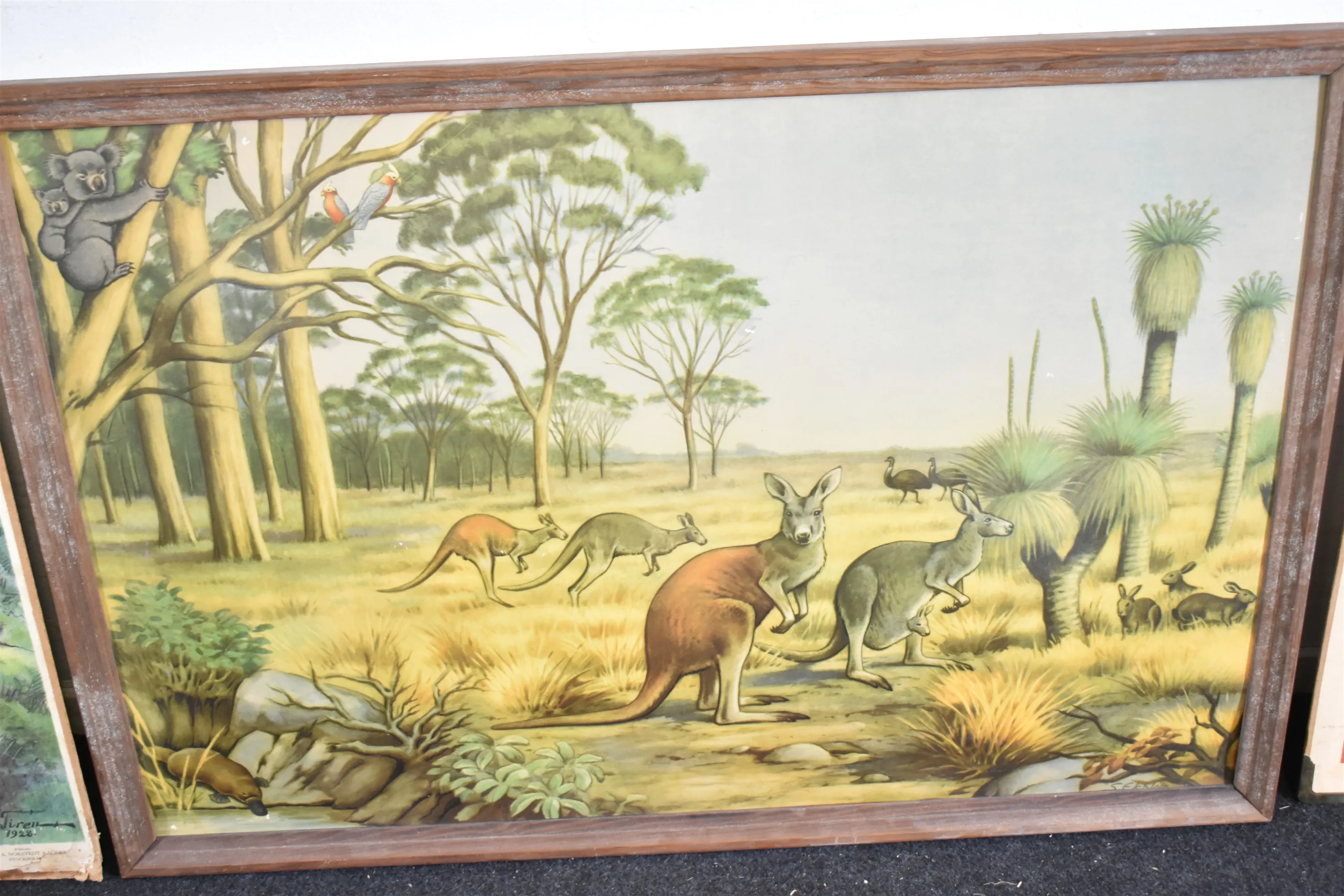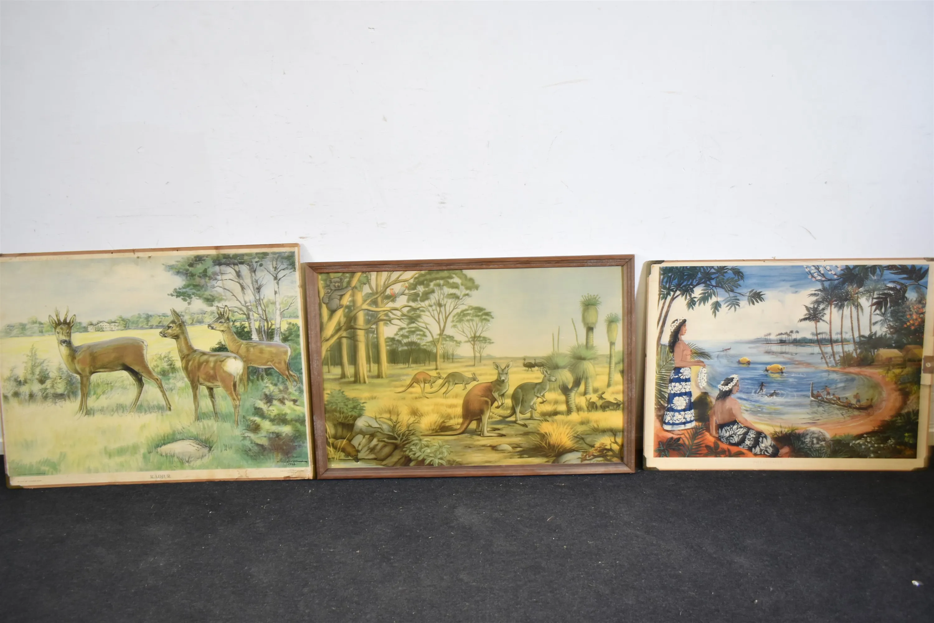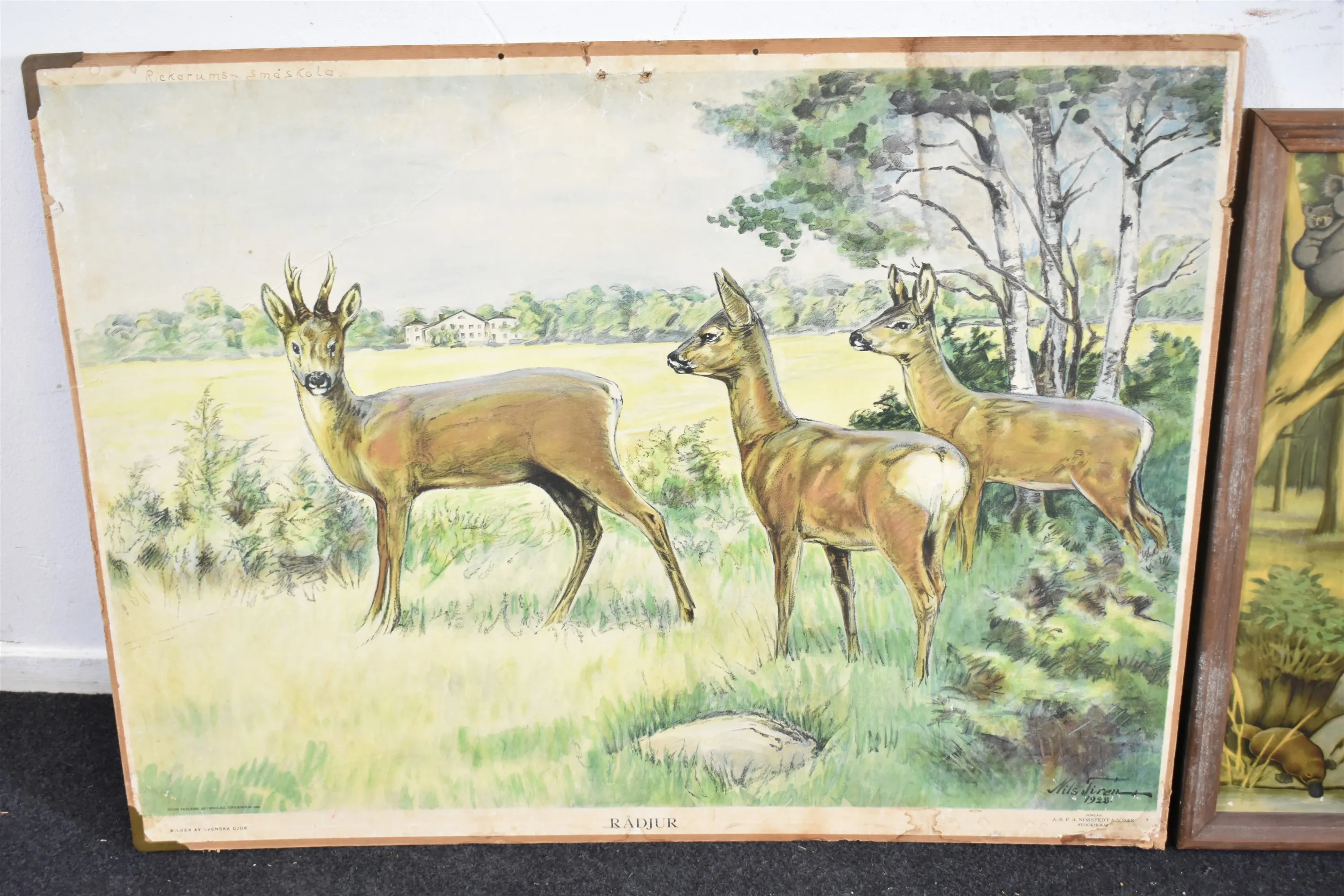 11992. Skolplanscher 2 st och tryck bla "Rådjur, största mått 95x75 cm