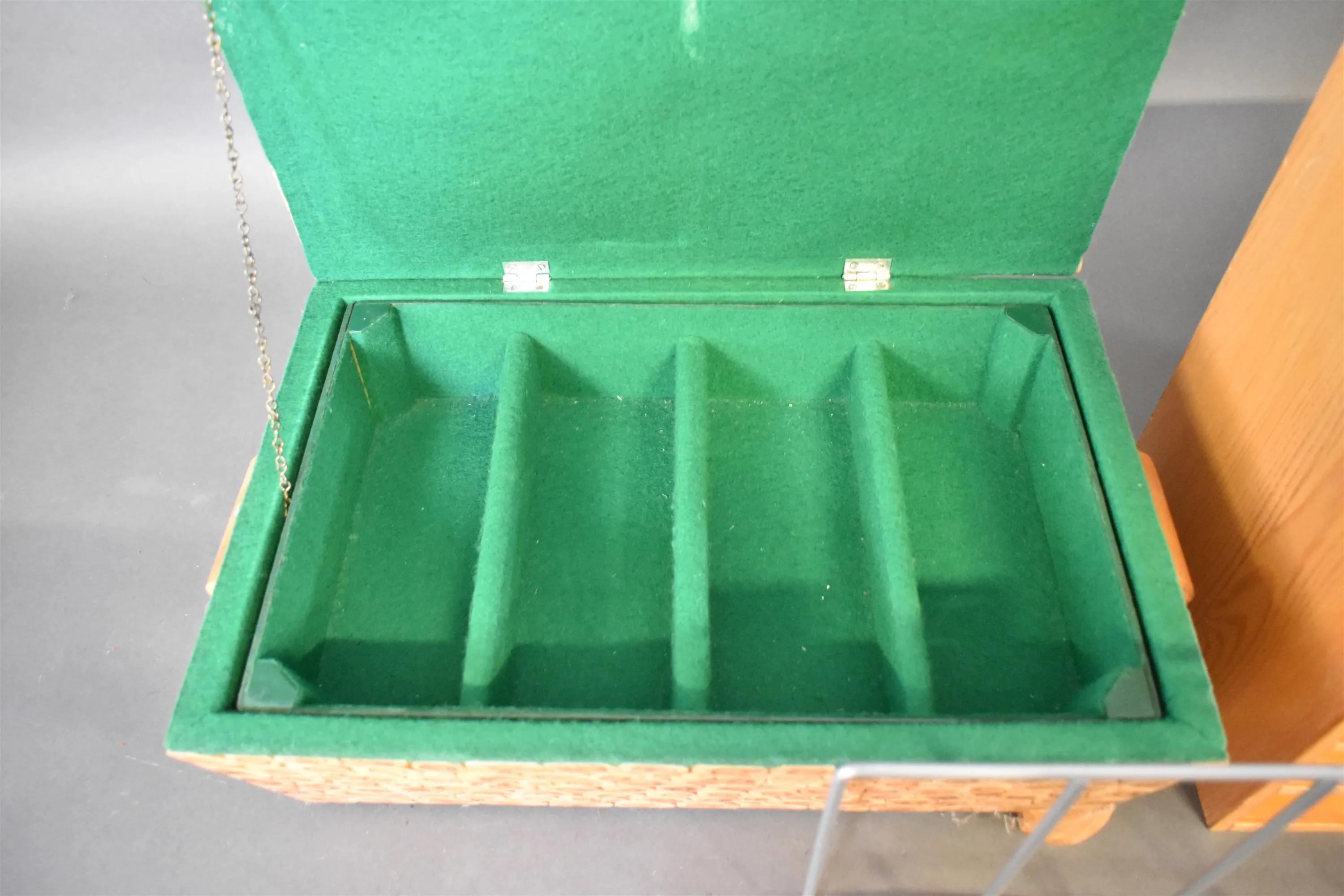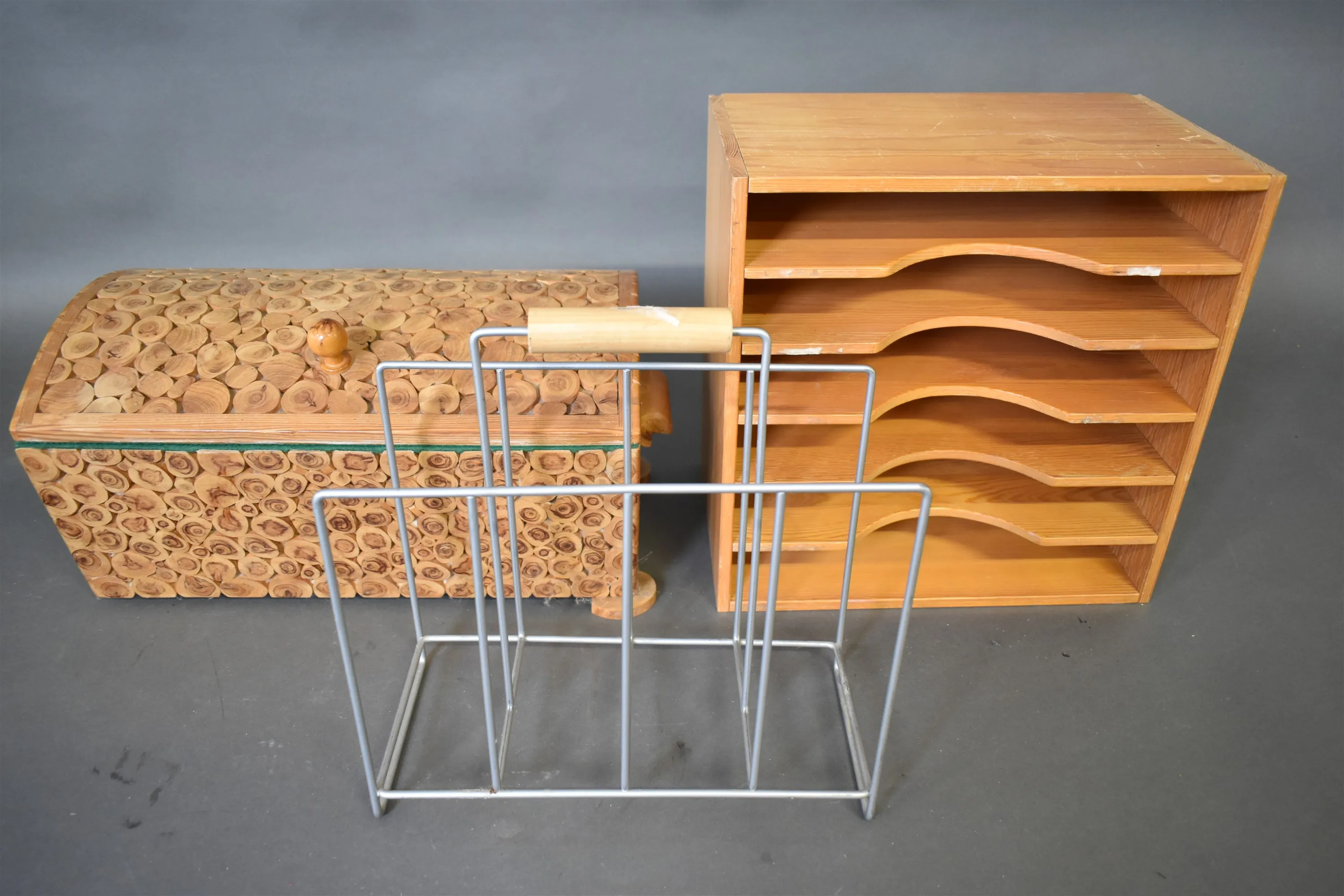 15319. Skrin, tidningskorg, sortimenthylla, högsta 38 cm, fot på skrin saknas