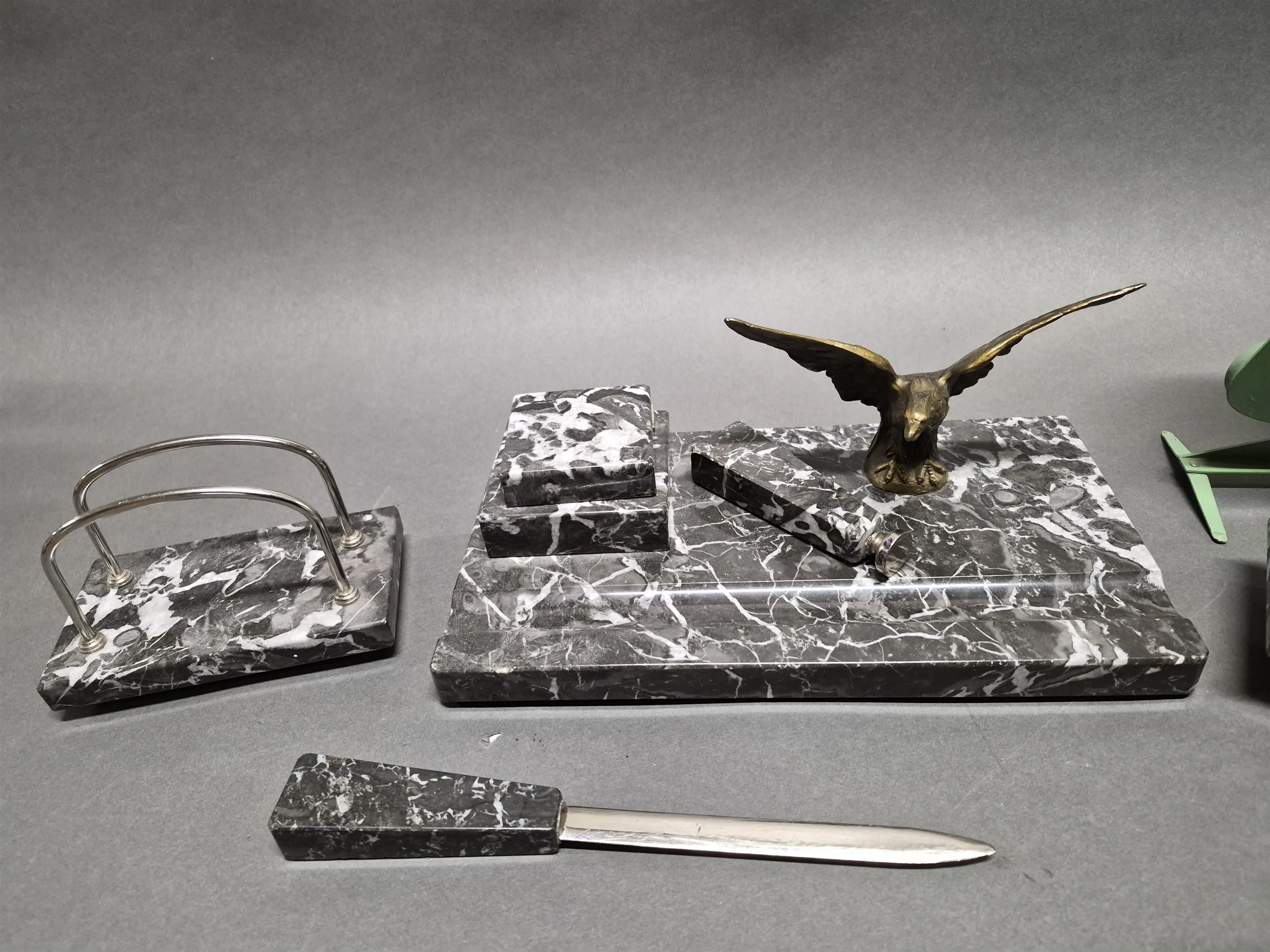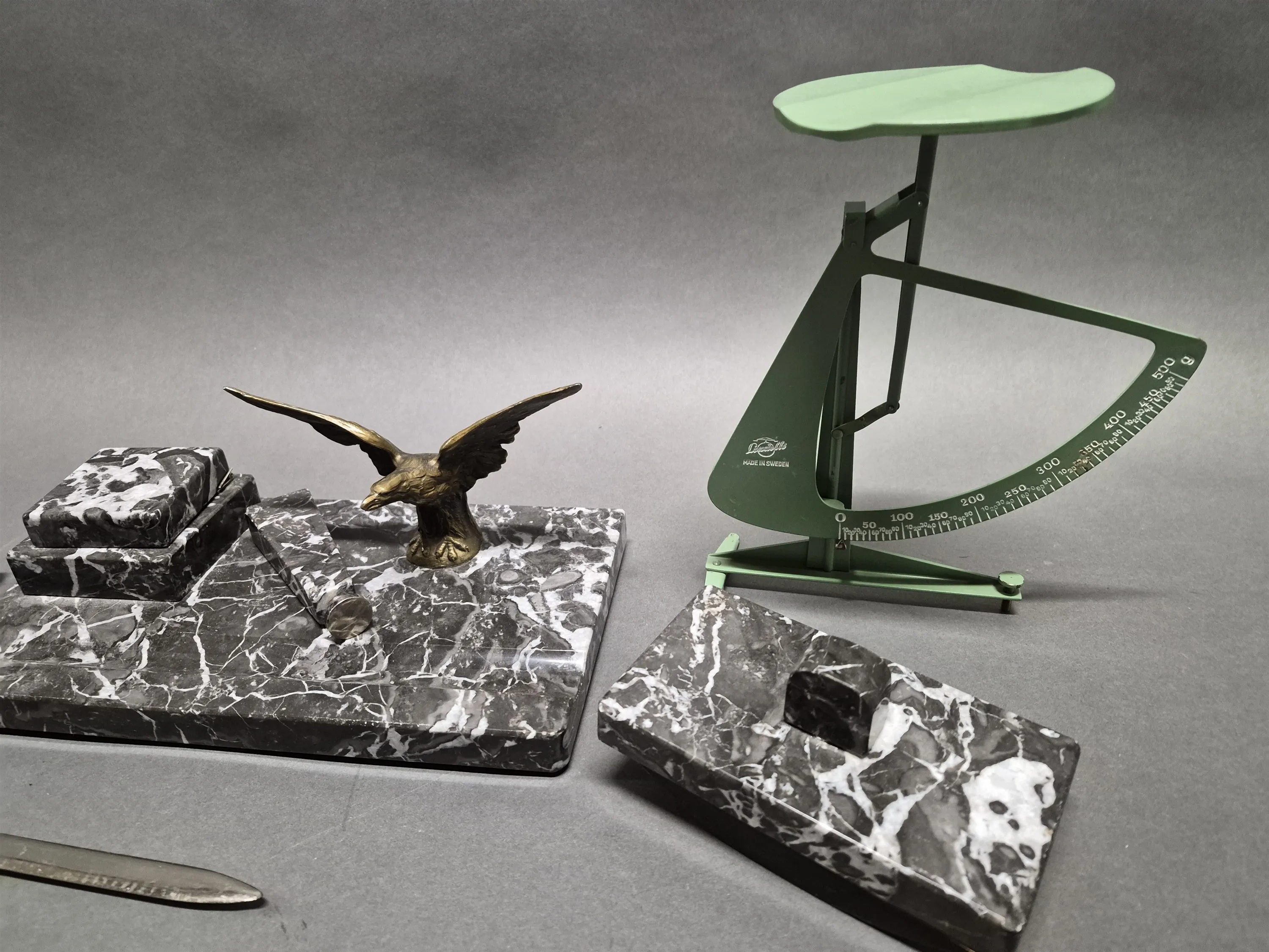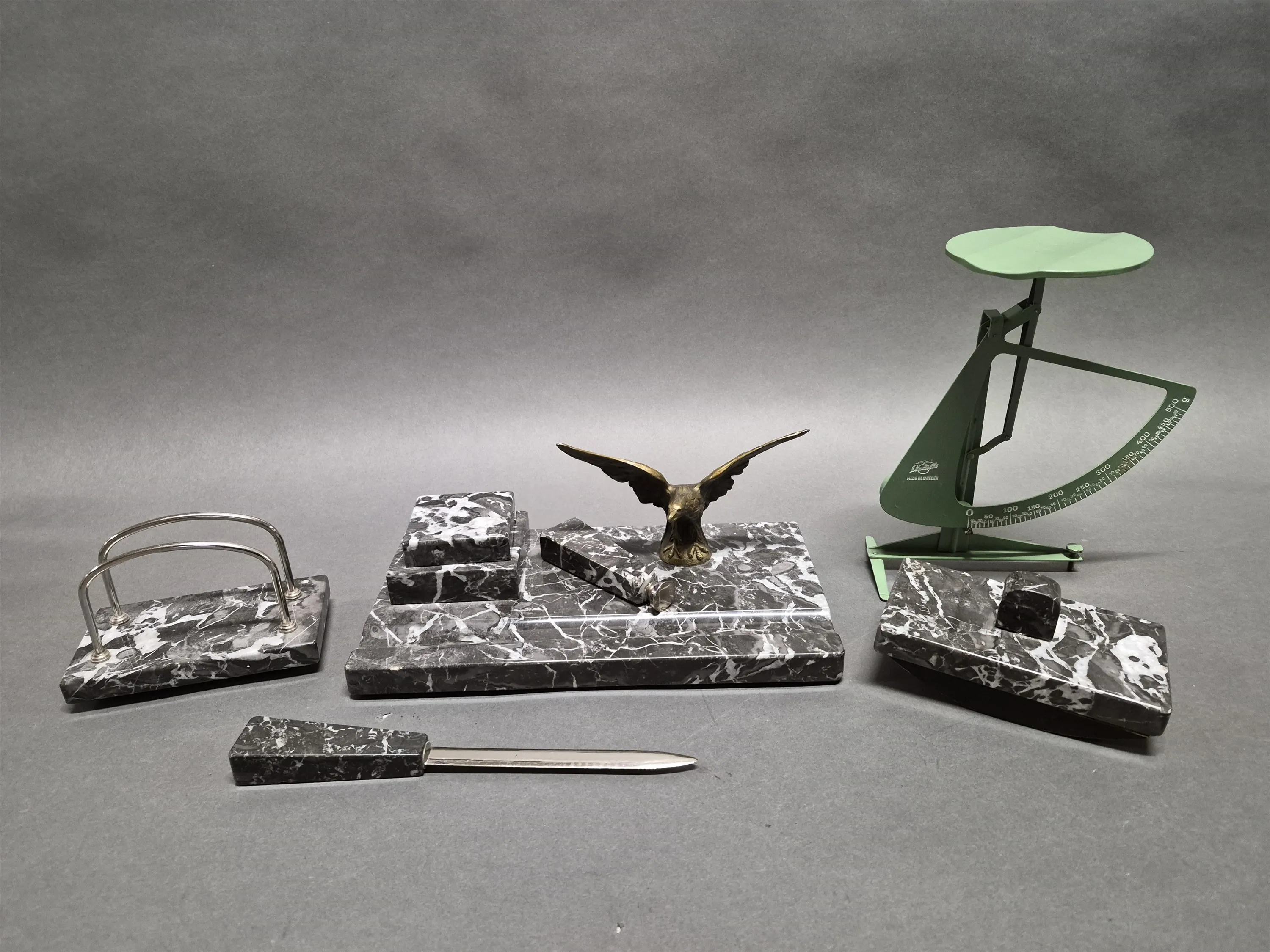 18336. Skrivsbordsset i marmor och brevvåg, längsta mått 27 cm