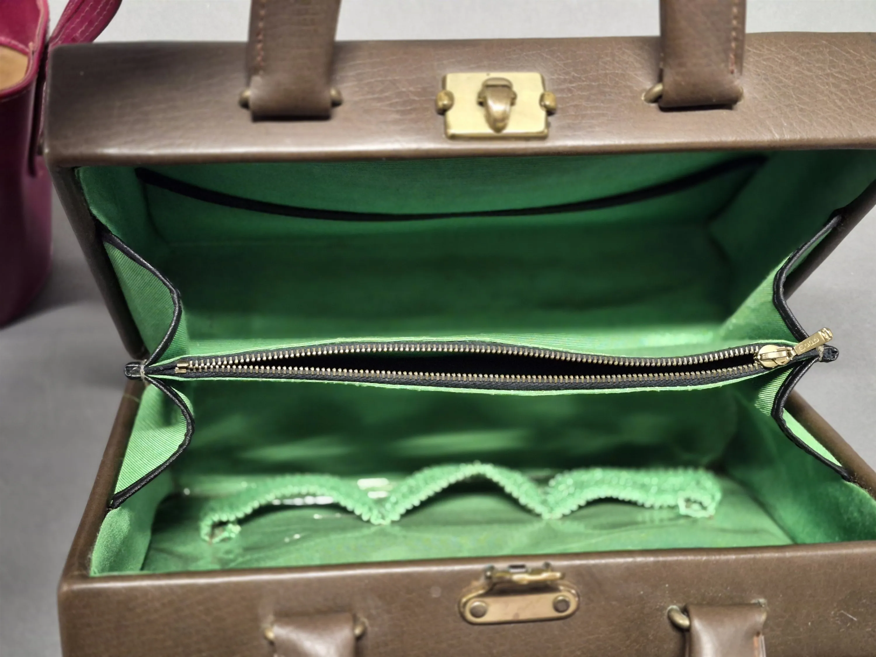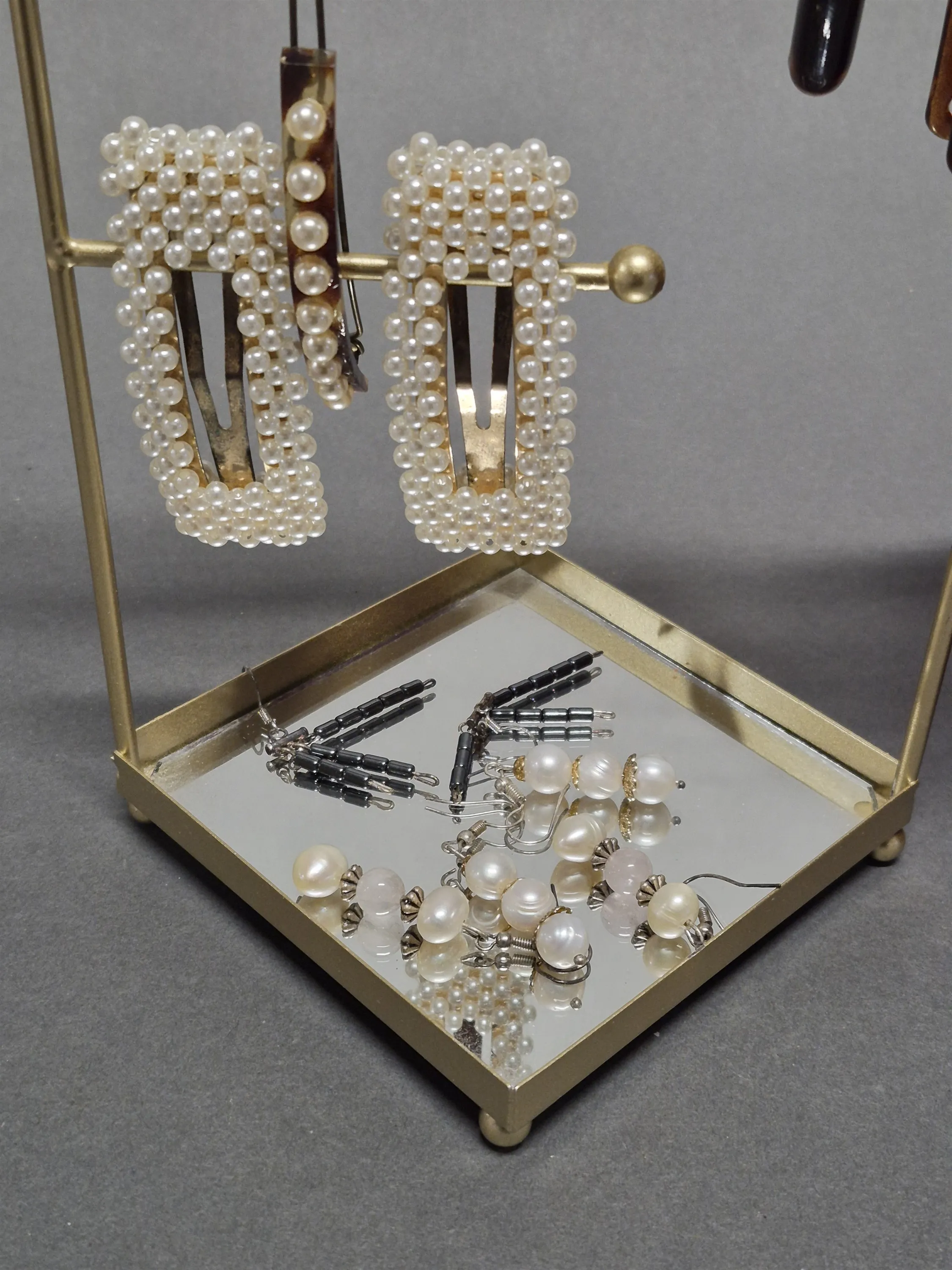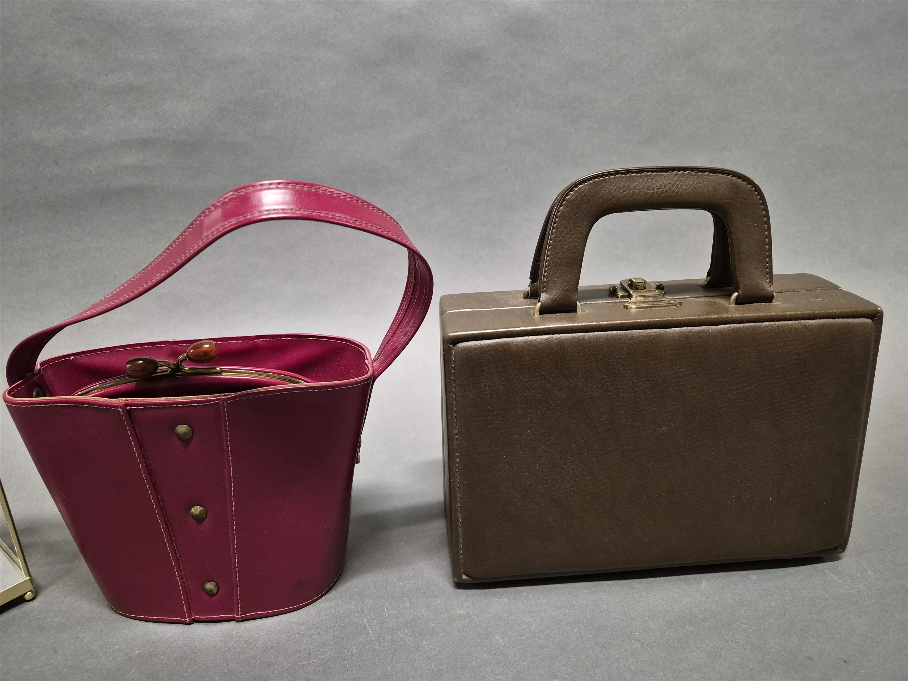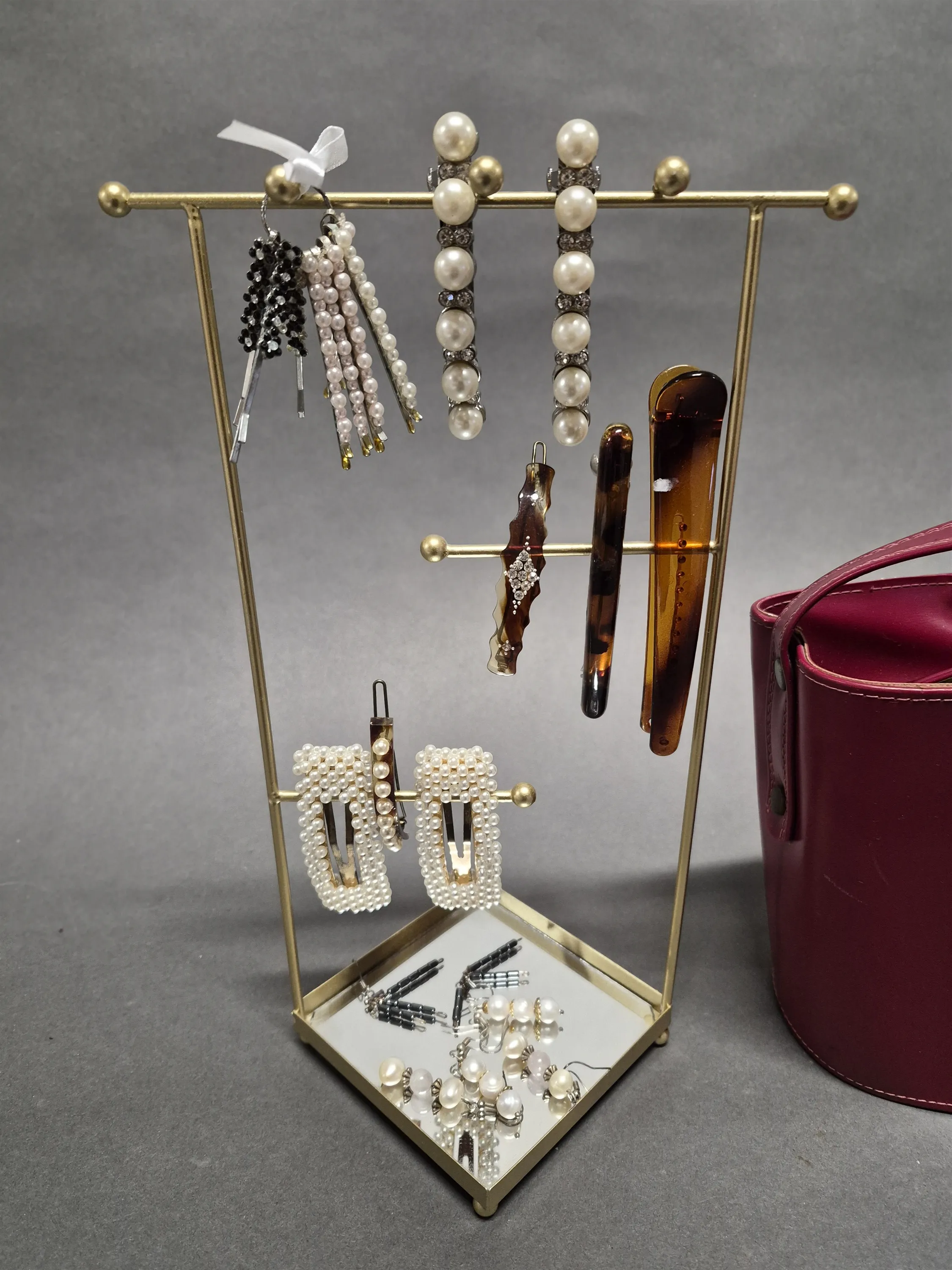18622. Smyckesställning med håraccessoarer och örhängen, handväska retro och neccessärväska 1950-60-tal29 cm