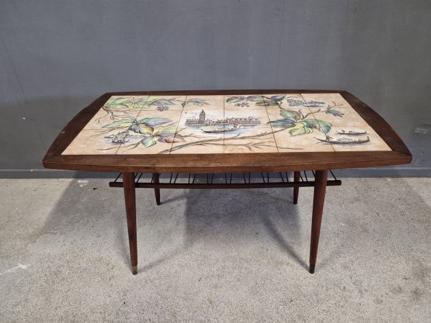 19304. Soffbord med kakelplattor, spricka i platta, längd 104 cm, bredd 59 cm, höjd 56 cm